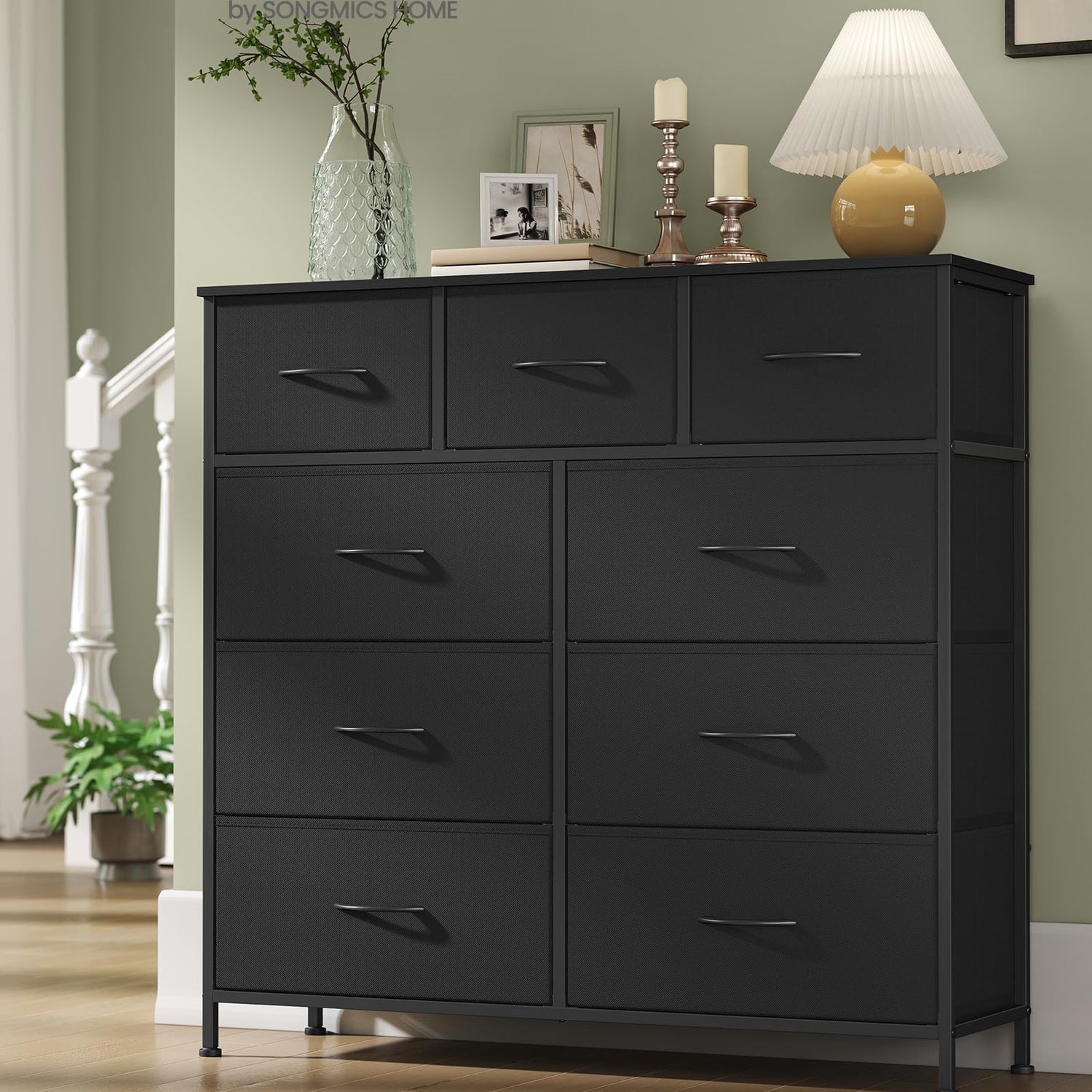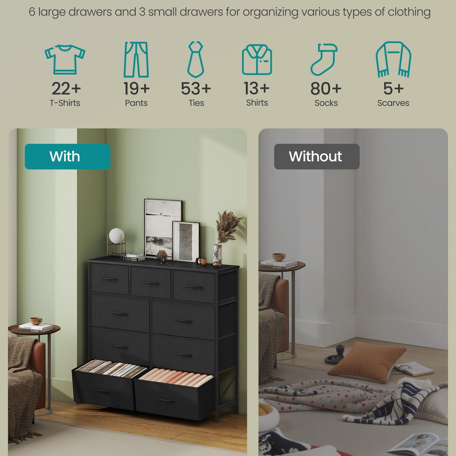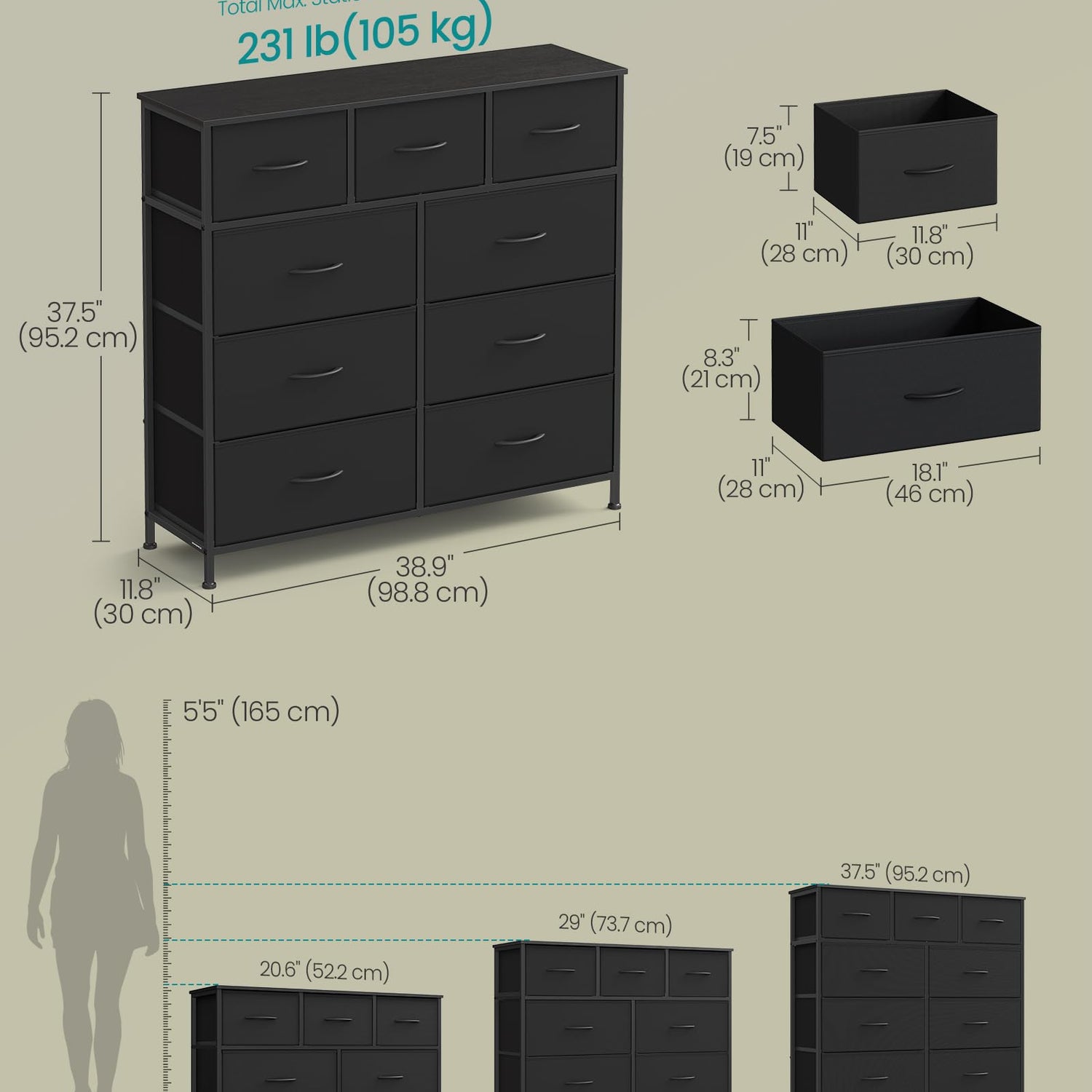 SONGMICS Dresser for Bedroom, Chest of Drawers, Steel, MDF, 9 Non-Woven Fabric Drawers, Storage Organizer Unit, Closet, Entryway, Ink Black and Ebony Black LGS324B01S