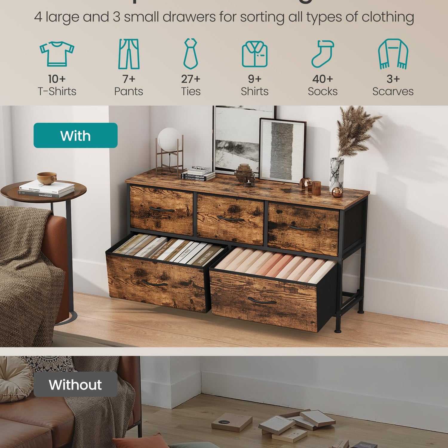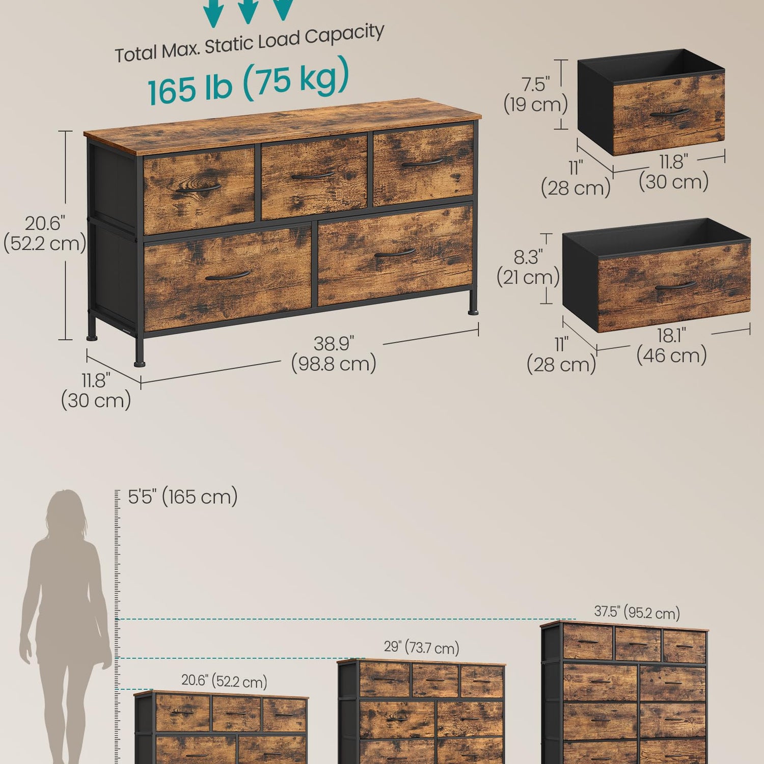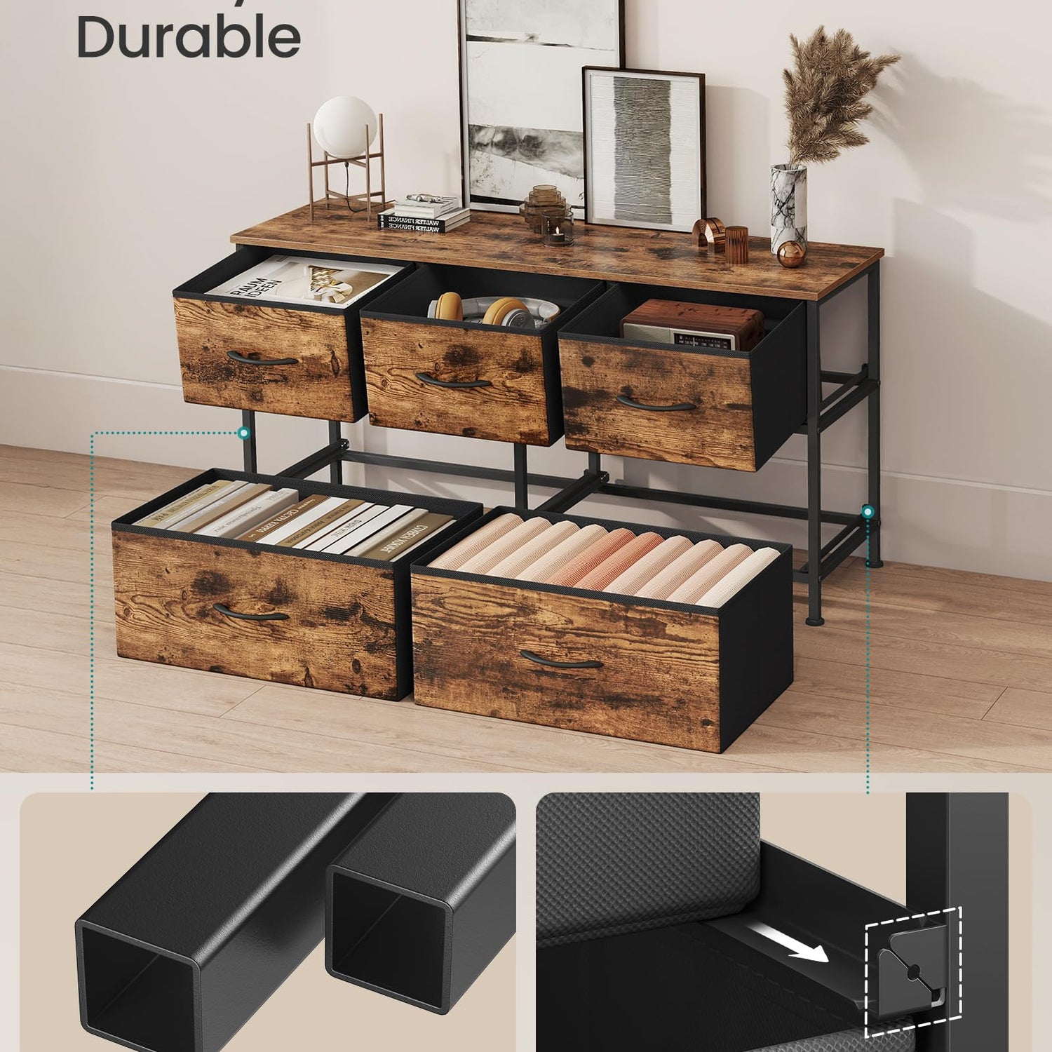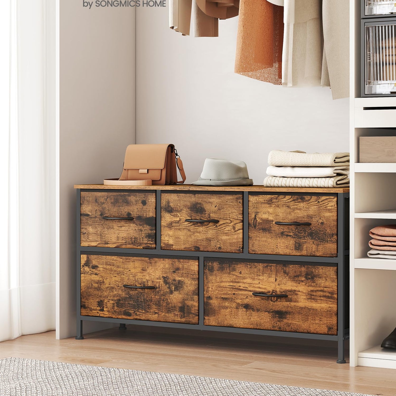SONGMICS Dresser for Bedroom, Chest of Drawers, TV Stand, Steel, MDF, 5 Non-Woven Fabric Drawers, Storage Organizer Unit, Closet, Entryway, Rustic Brown and Ink Black ULGS322B02S