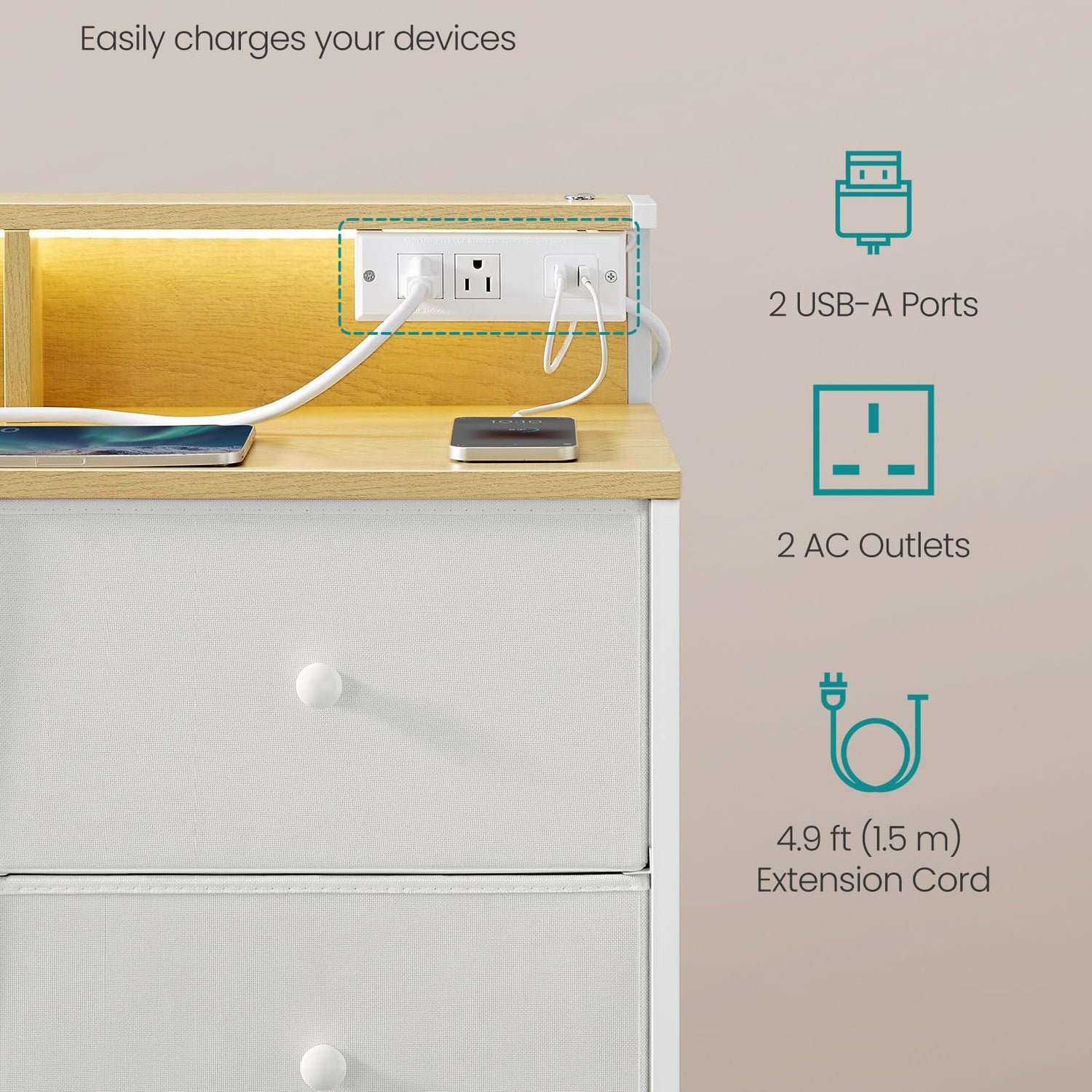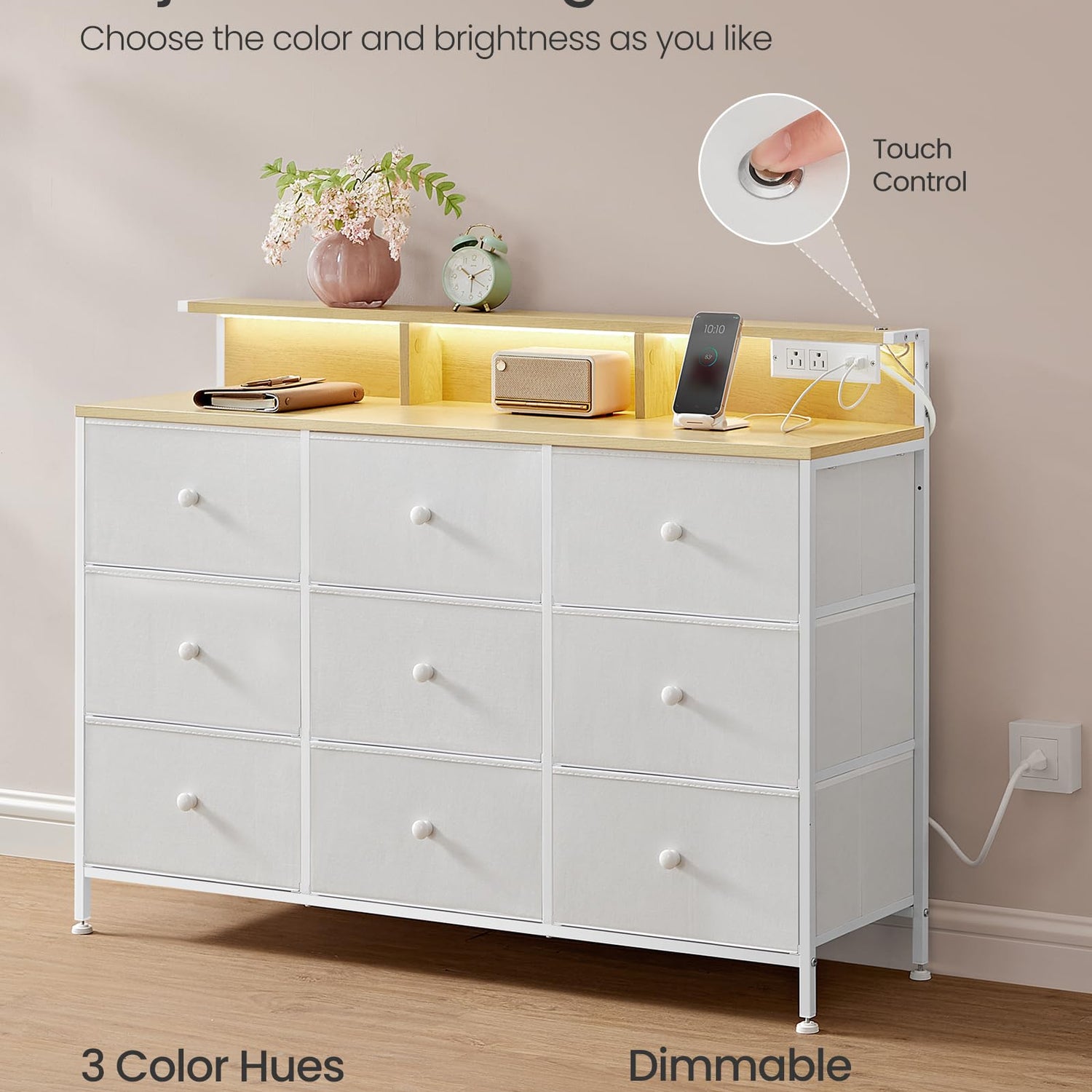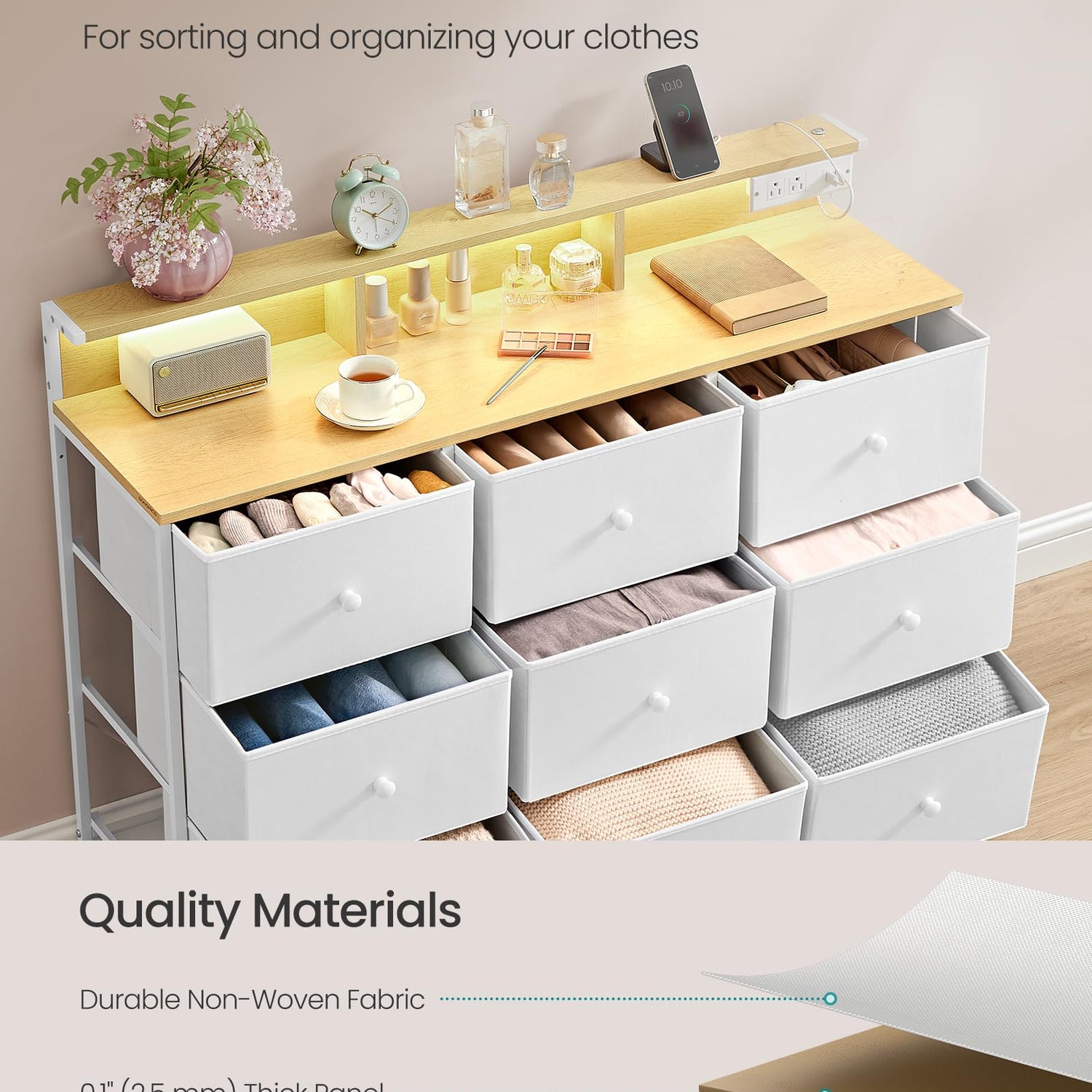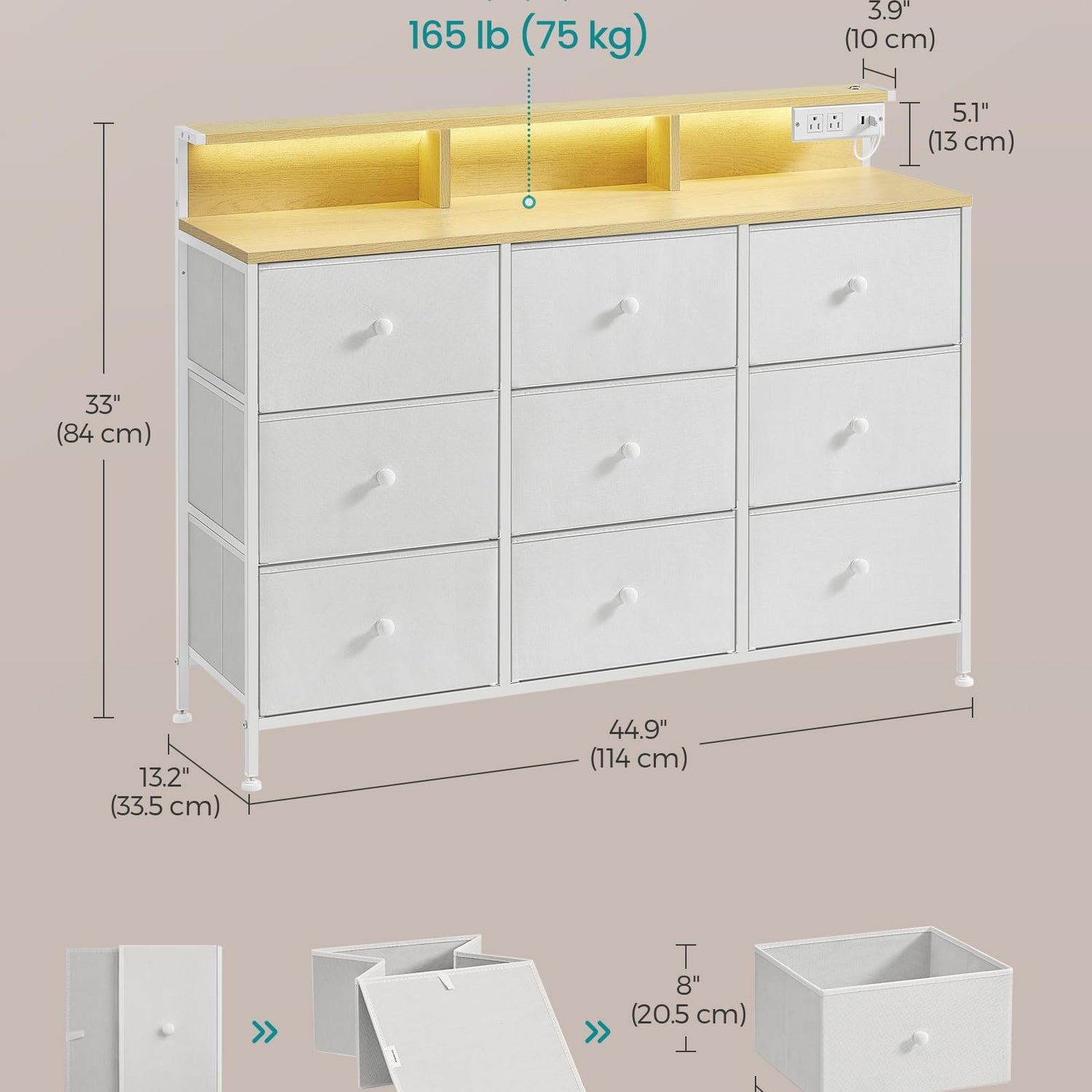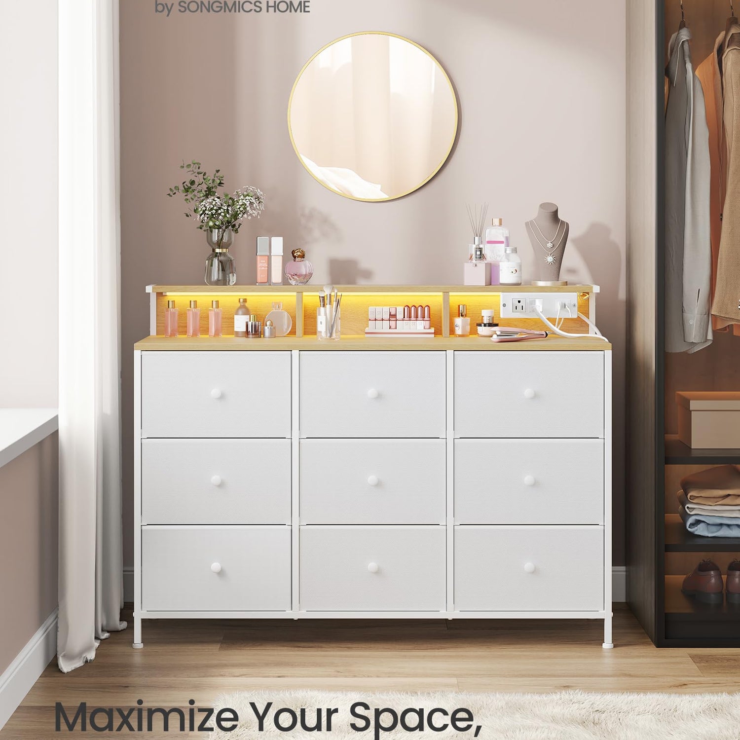SONGMICS Dresser for Bedroom, Storage Organizer with 9 Fabric Drawers and LED Lights, Charging Station, Steel Frame, 13.2 x 44.9 x 33 Inches, Entryway, Cloud White ULTS519W01