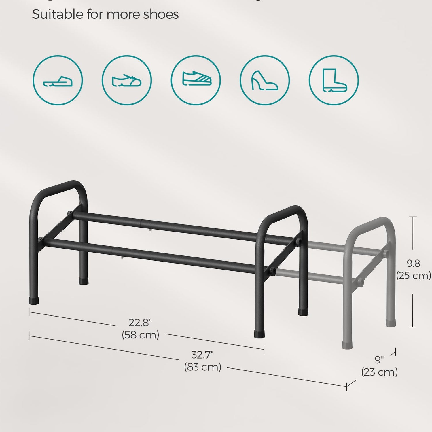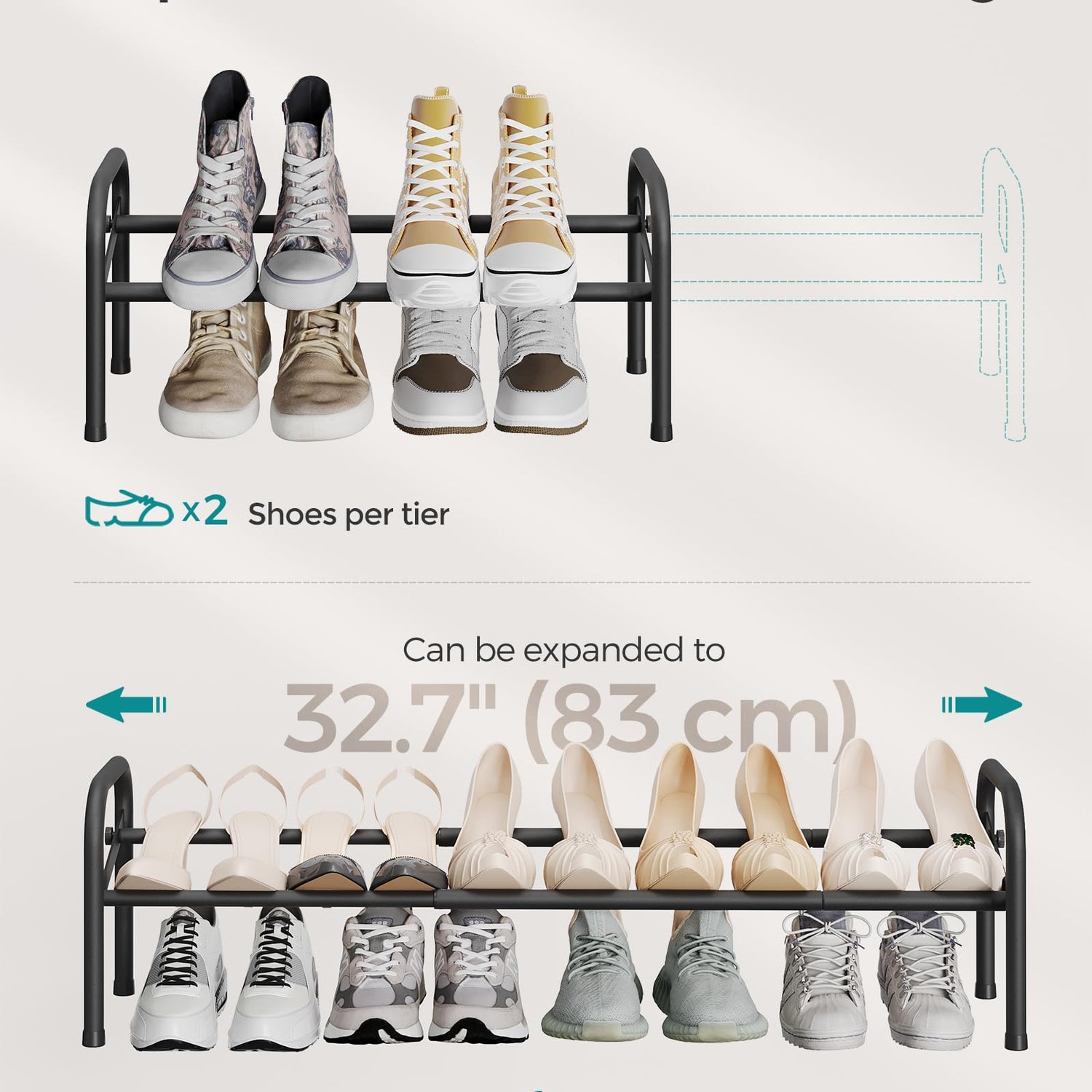 - [Expandable Storage Space] This shoe rack can be expanded from 22.8 inches to 32.7 inches for a customized fit, perfect for organizing shoes in the garage, entryway, bedroom, or small spaces