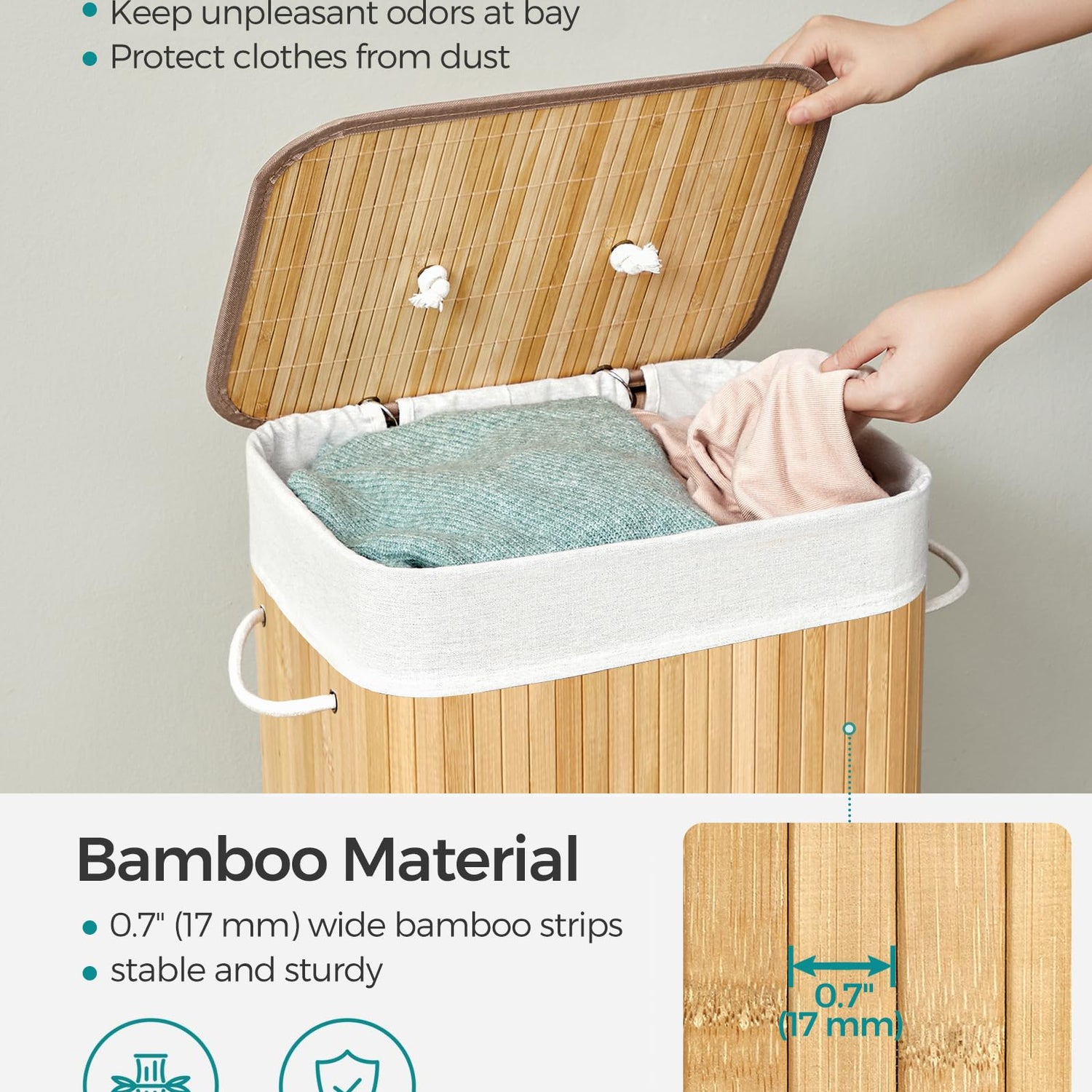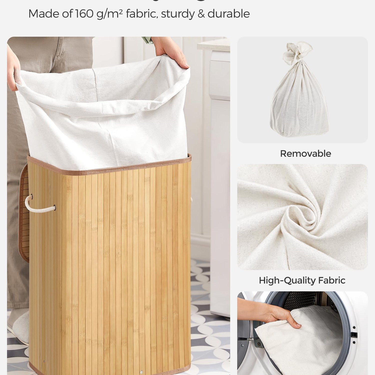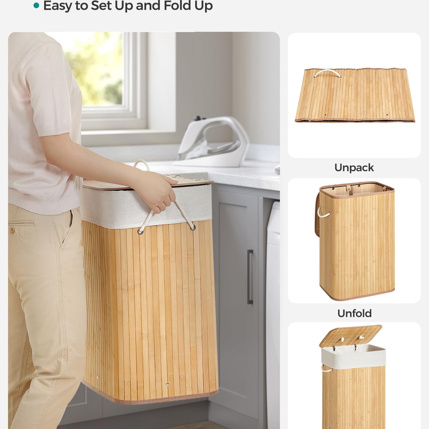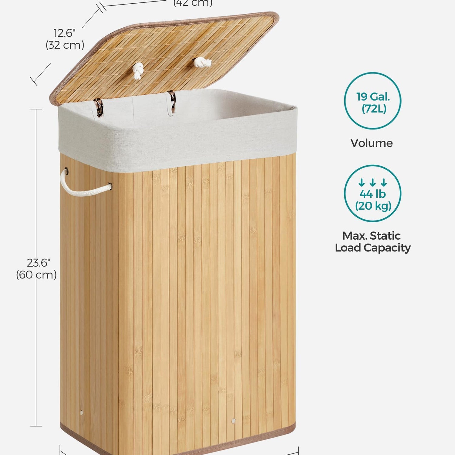 SONGMICS Foldable Laundry Hamper with Lid, 19 Gal. Bamboo Laundry Basket, Rectangular Storage Hamper with 3 Handles, 15.7 x 11.8 x 23.6 Inches, for Laundry Room, Bedroom, Natural ULCB10YV1