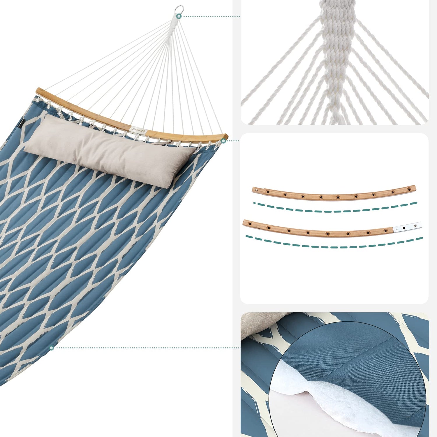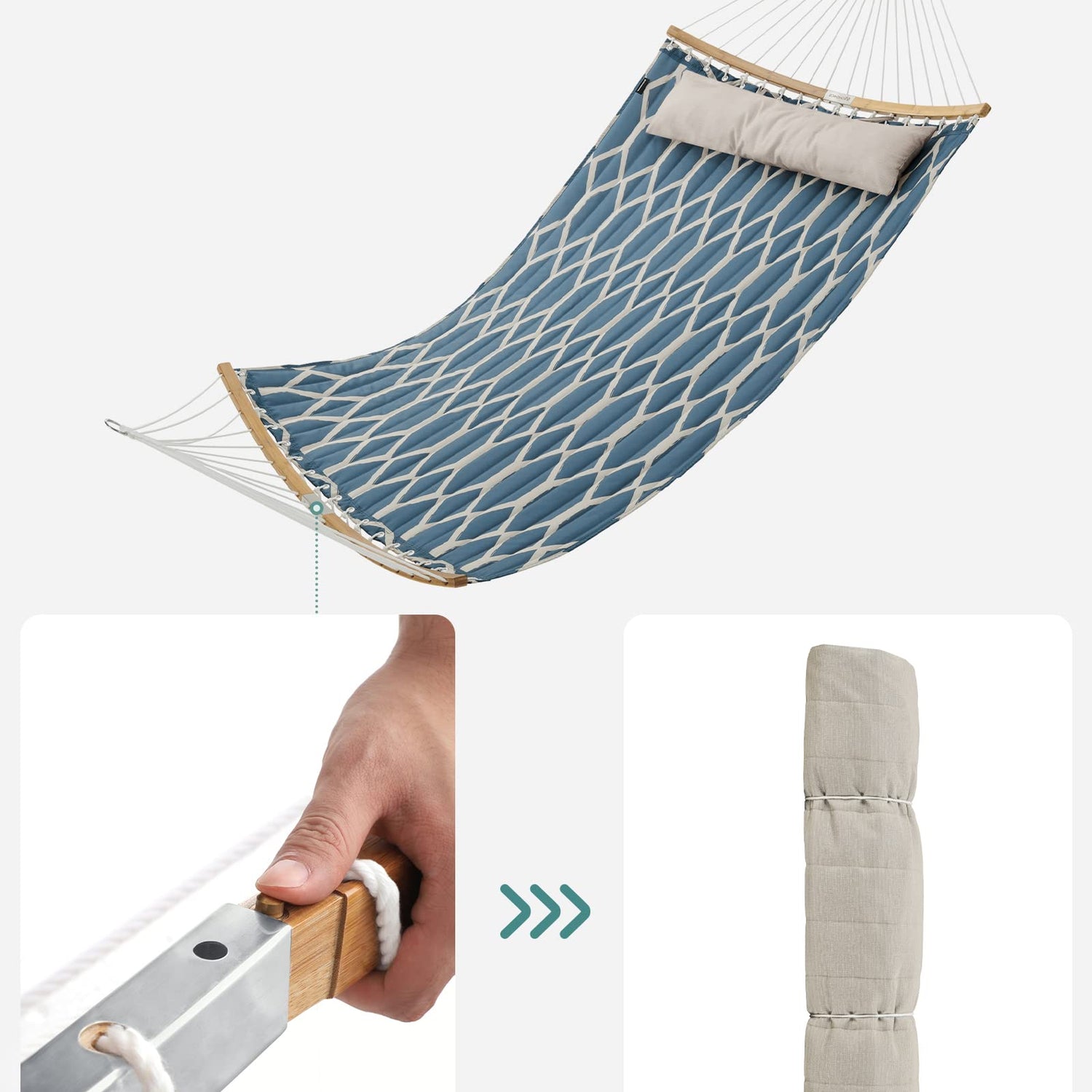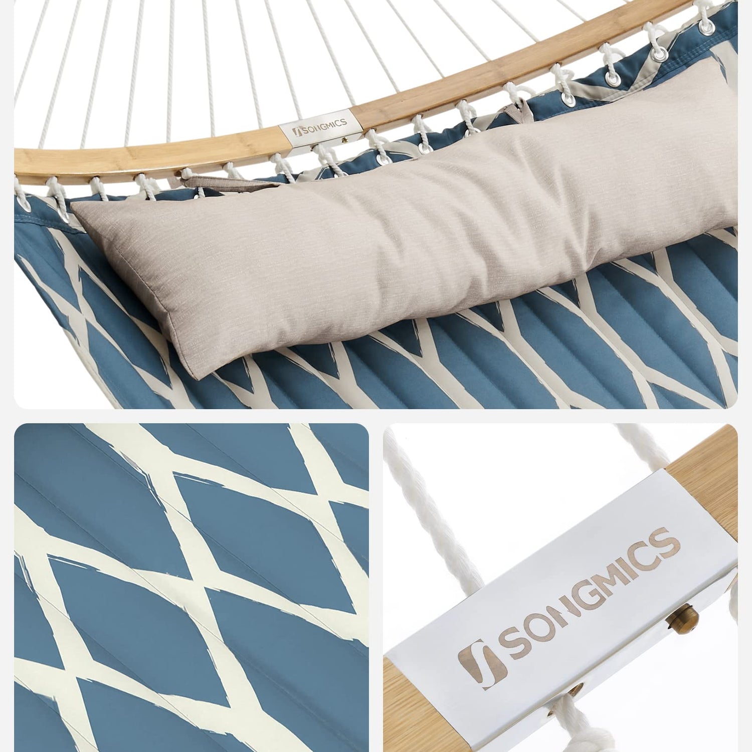 SONGMICS Hammock, Quilted Hammock with Curved Bamboo Spreaders, Pillow, 78.7 x 55.1 Inches, Portable Padded Hammock Holds up to 495 lb, Blue and Beige Rhombus UGDC034I02