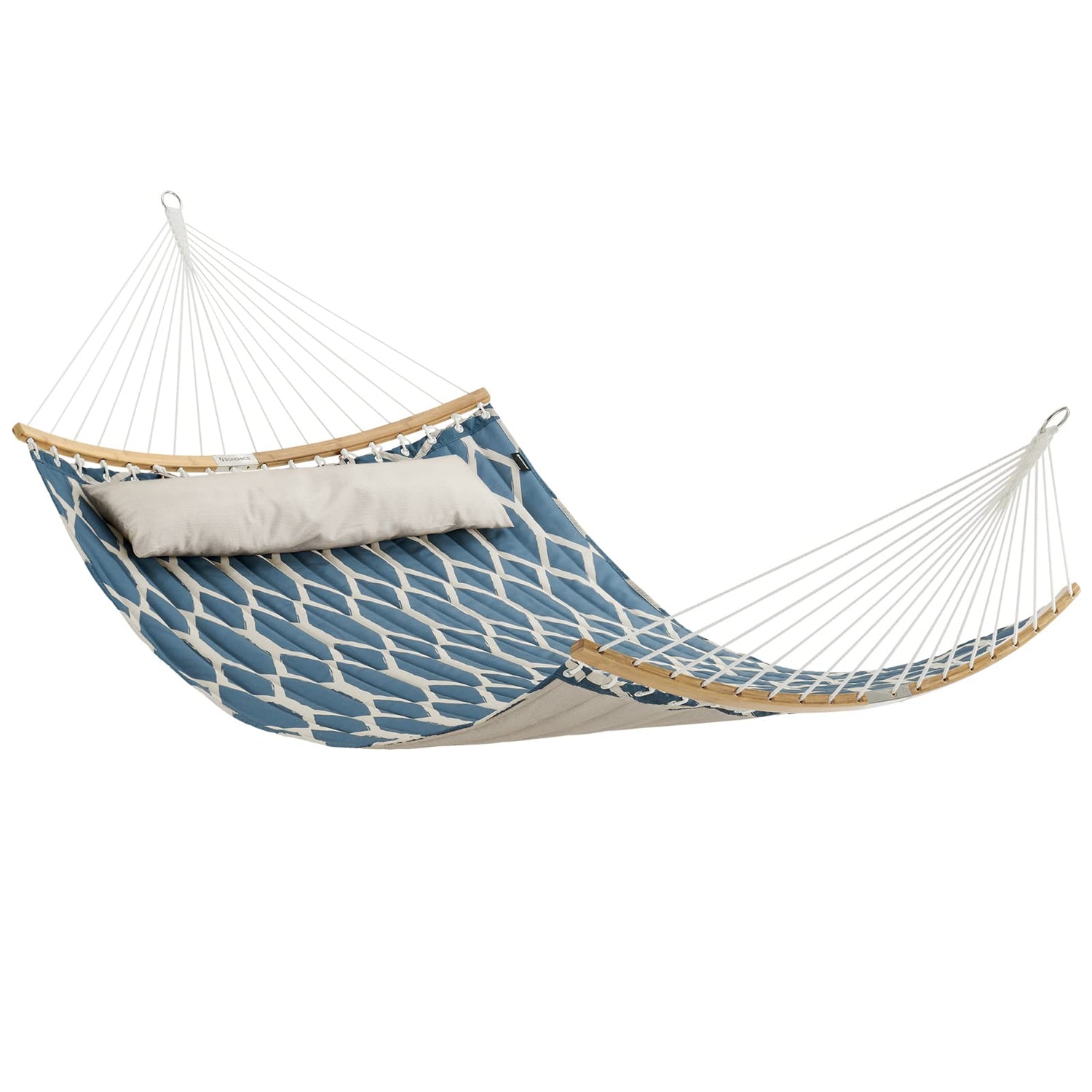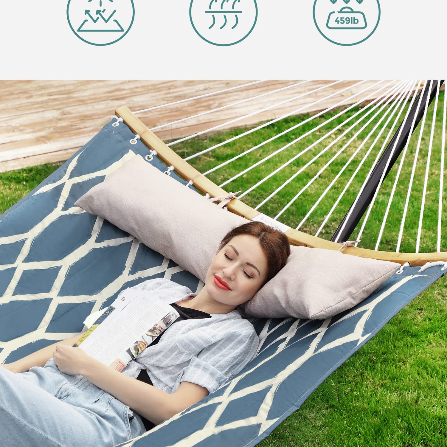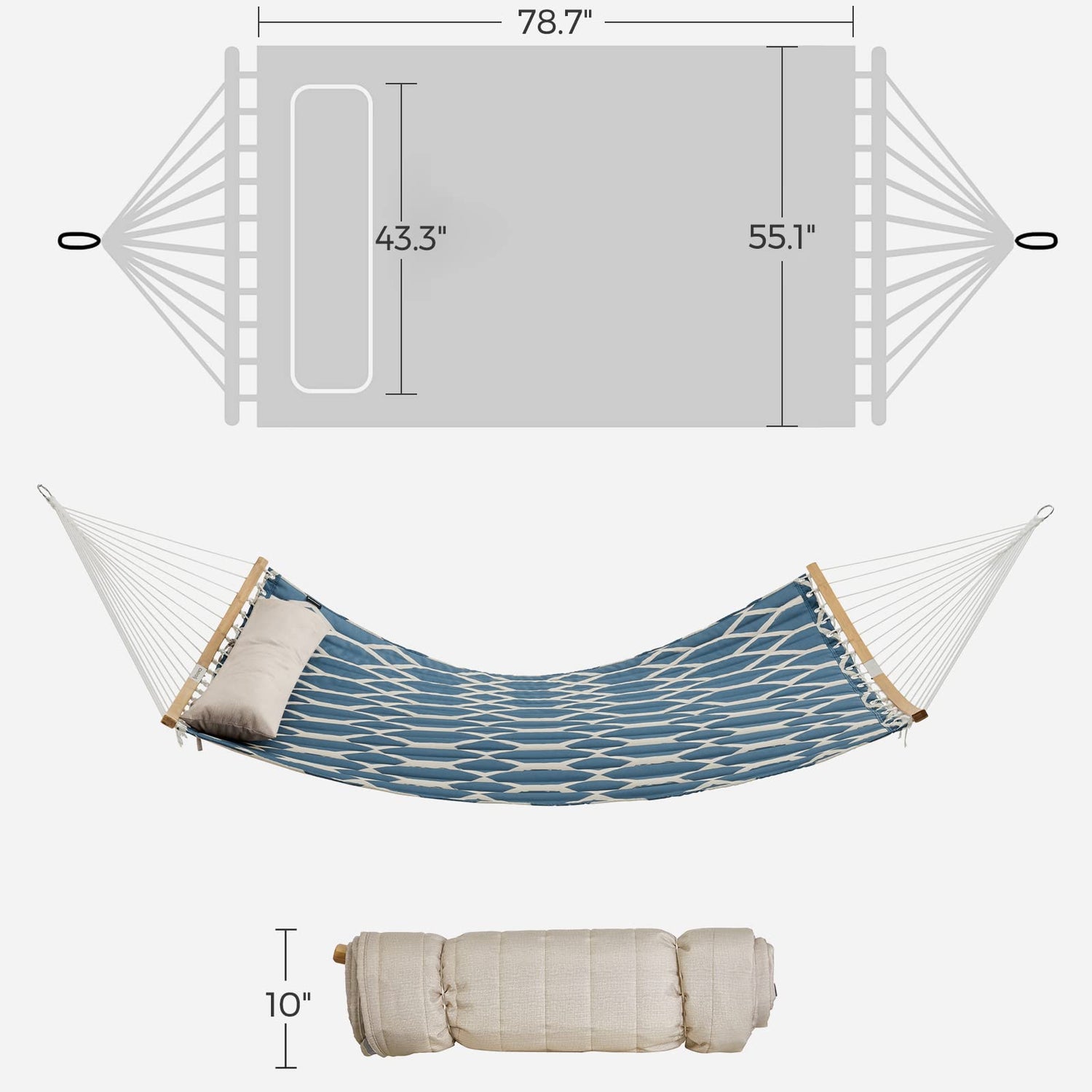 SONGMICS Hammock, Quilted Hammock with Curved Bamboo Spreaders, Pillow, 78.7 x 55.1 Inches, Portable Padded Hammock Holds up to 495 lb, Blue and Beige Rhombus UGDC034I02