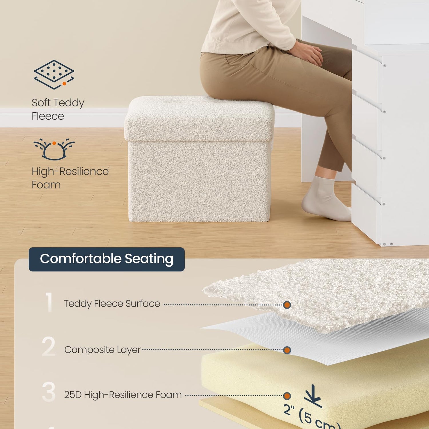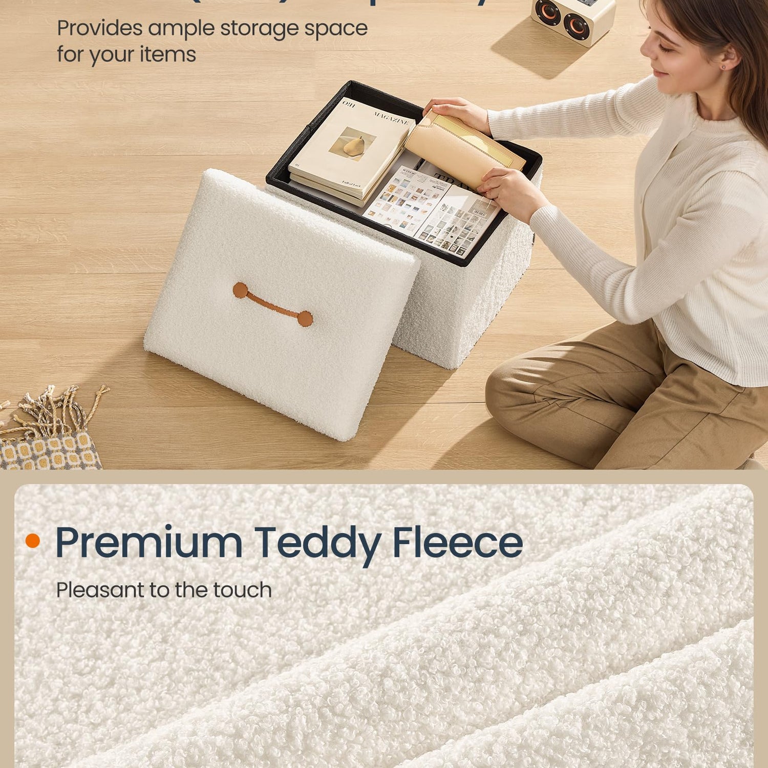 - 【ELEGANT DESIGN, ENDURING COMFORT】This ottoman boasts a chic teddy fleece surface and a unique smile design on the lid, adding a stylish touch to your space. The double-layer fabric and high-resilience foam ensure lasting comfort for relaxation