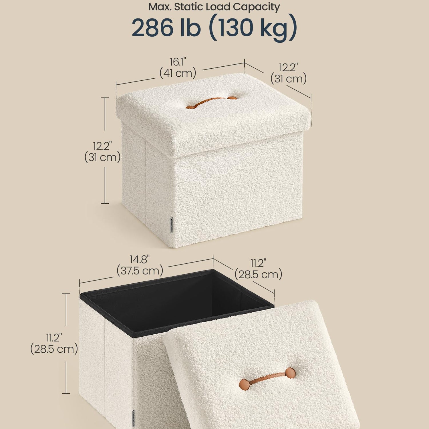 - 【EXTRA STORAGE】With a capacity of 8 gallons (32 L) and measuring 12.2"D x 16.1"W x 12.2"H (31 x 41 x 31 cm), this small ottoman with storage is perfect for organizing your clothes, books, and magazines