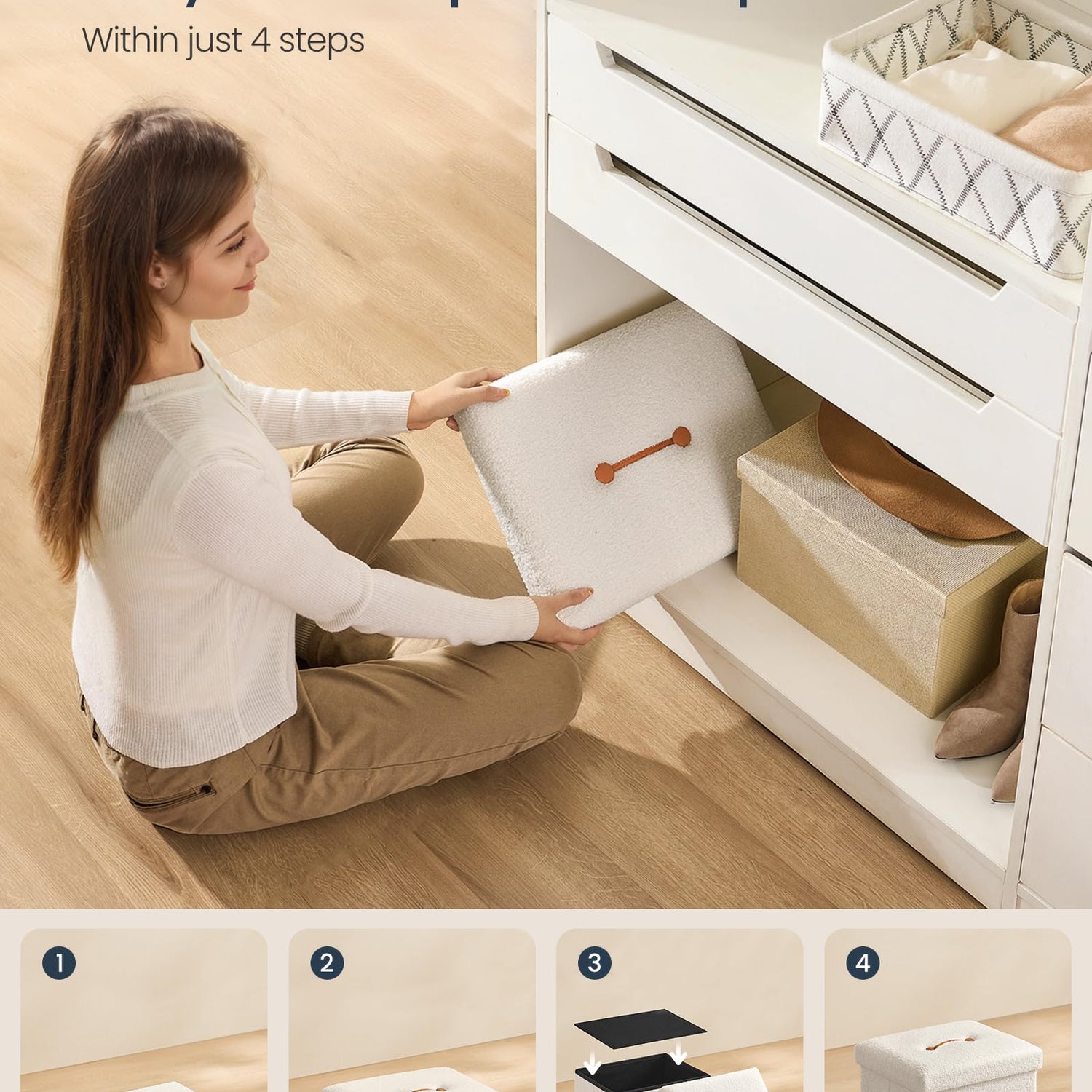- 【EASY TO SET UP & FOLD UP】Set up this foot rest stool with storage in seconds by inserting the bottom panel. Easily fold and store it under the bed or in a closet when not in use