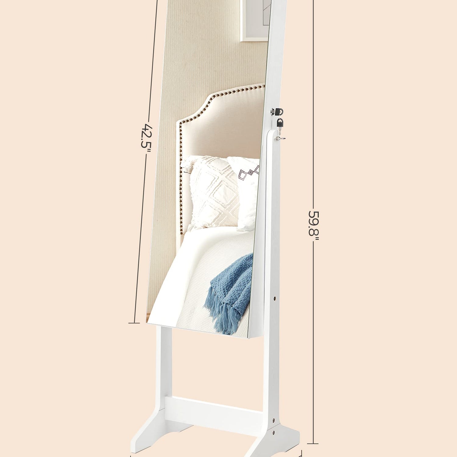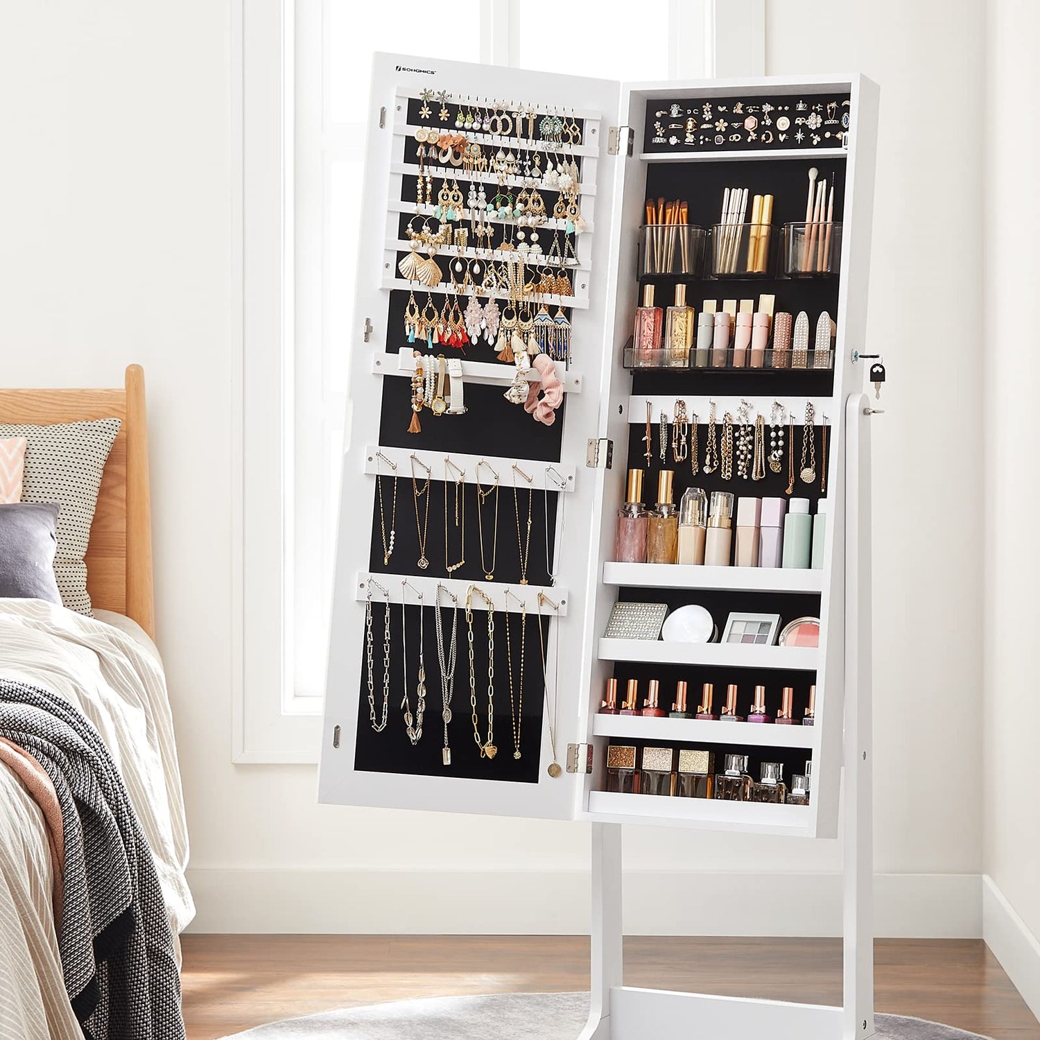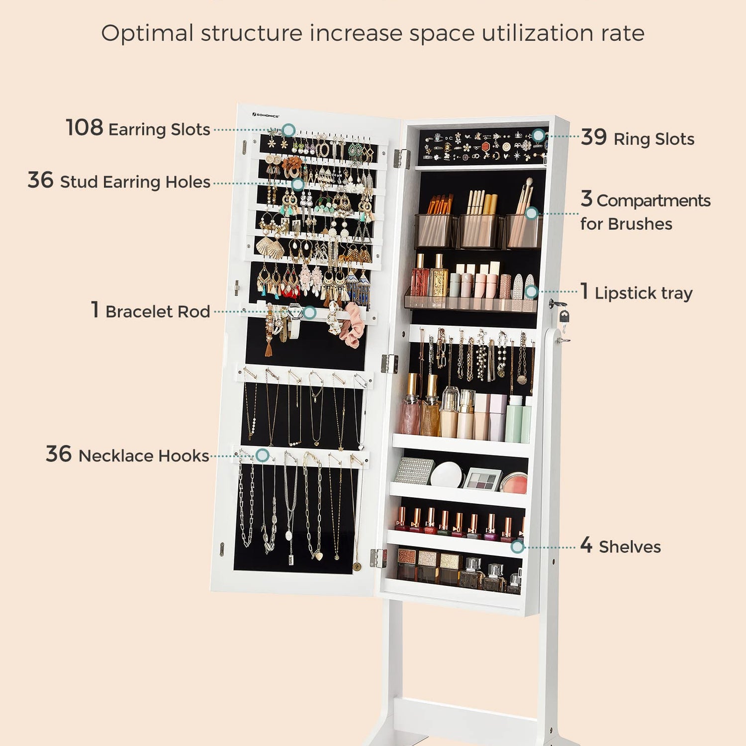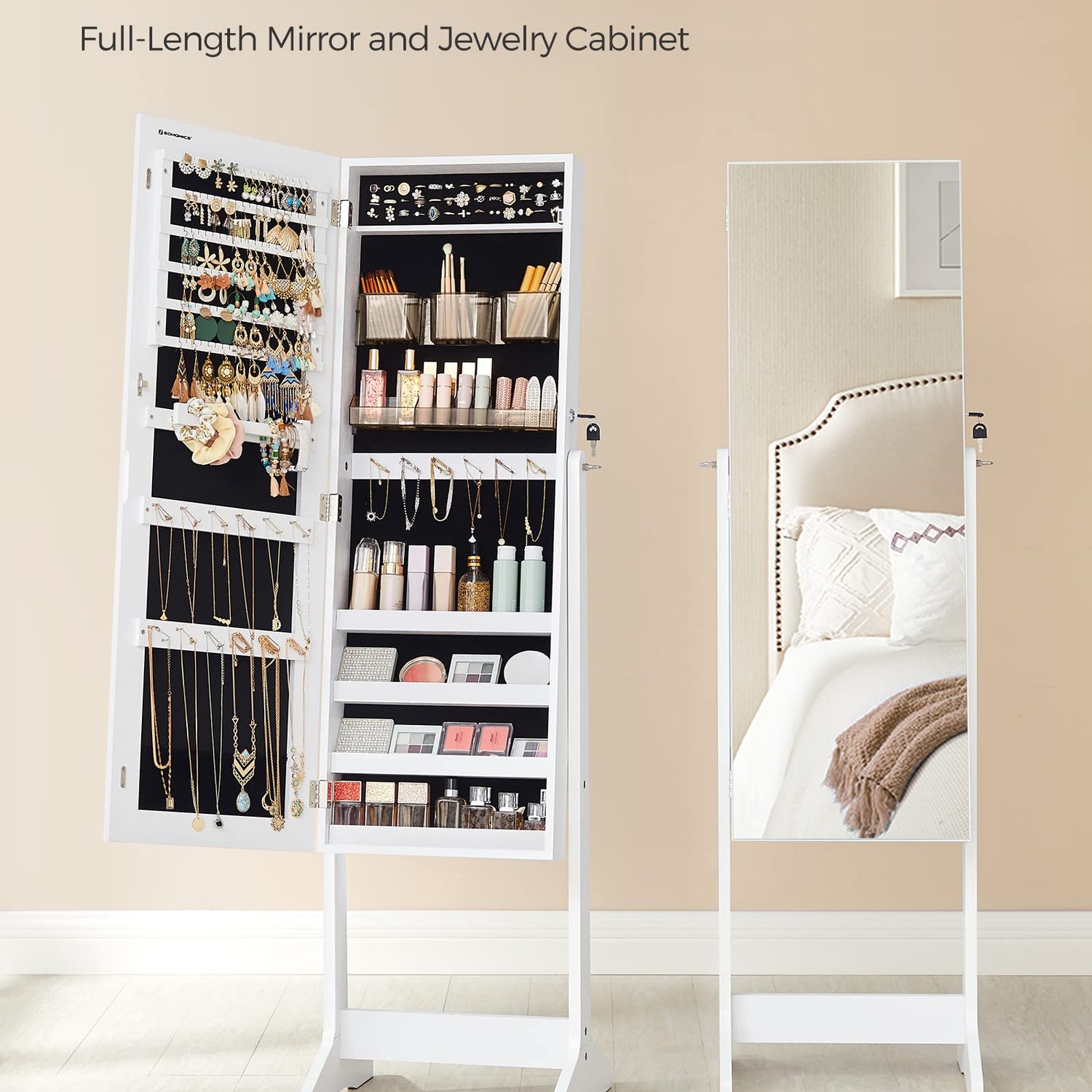 SONGMICS Jewelry Cabinet Armoire, Freestanding Lockable Storage Organizer Unit with 2 Plastic Cosmetic Storage, Full-Length Frameless Mirror, for Necklace Earring, White UJJC002W01