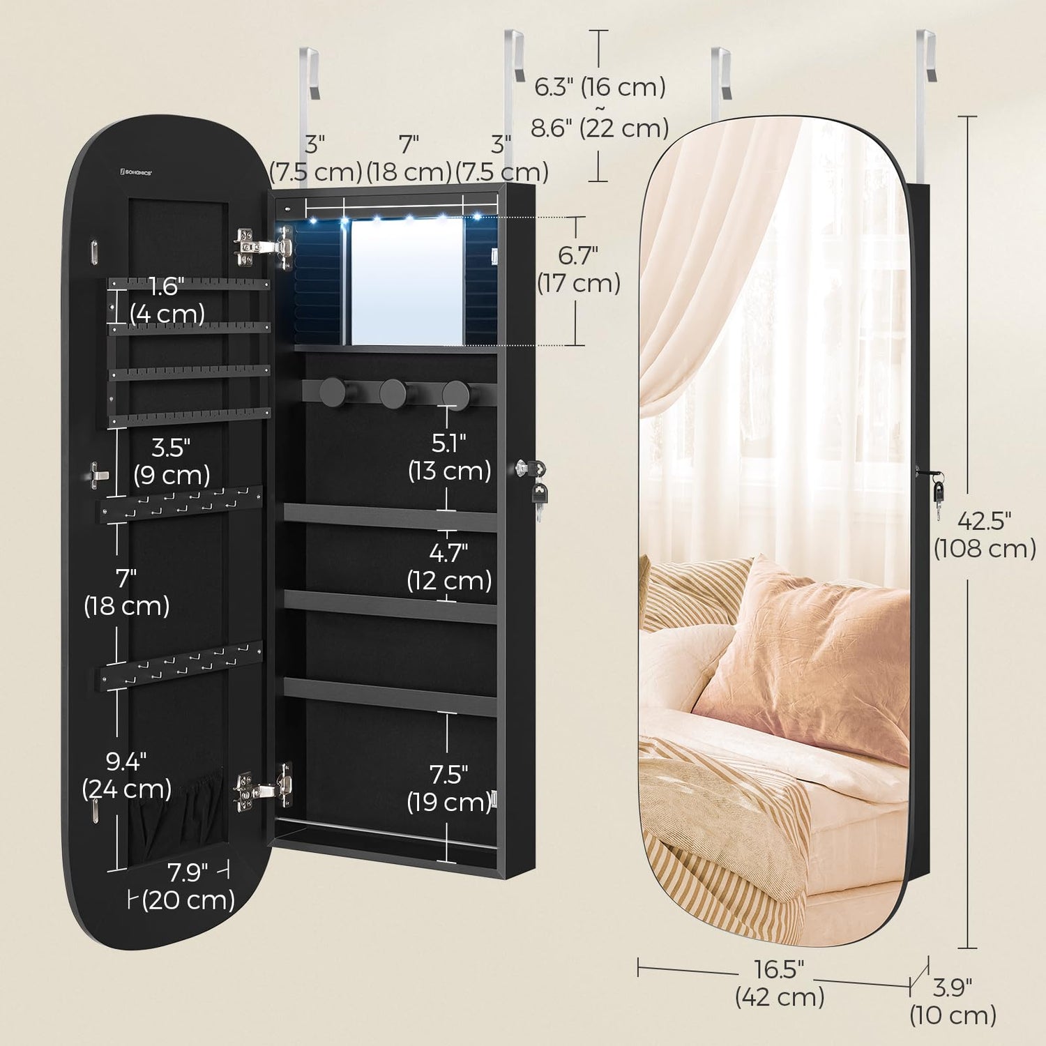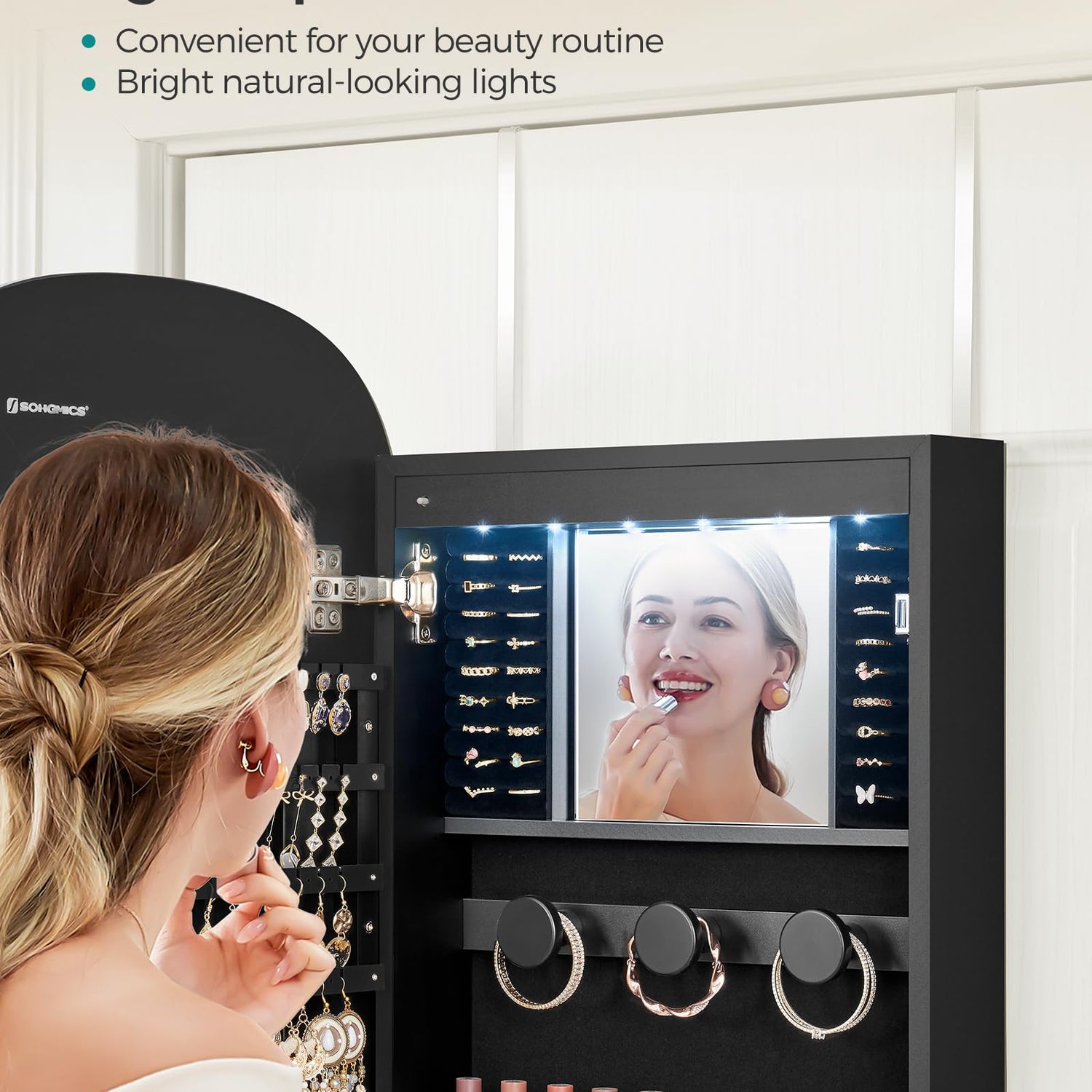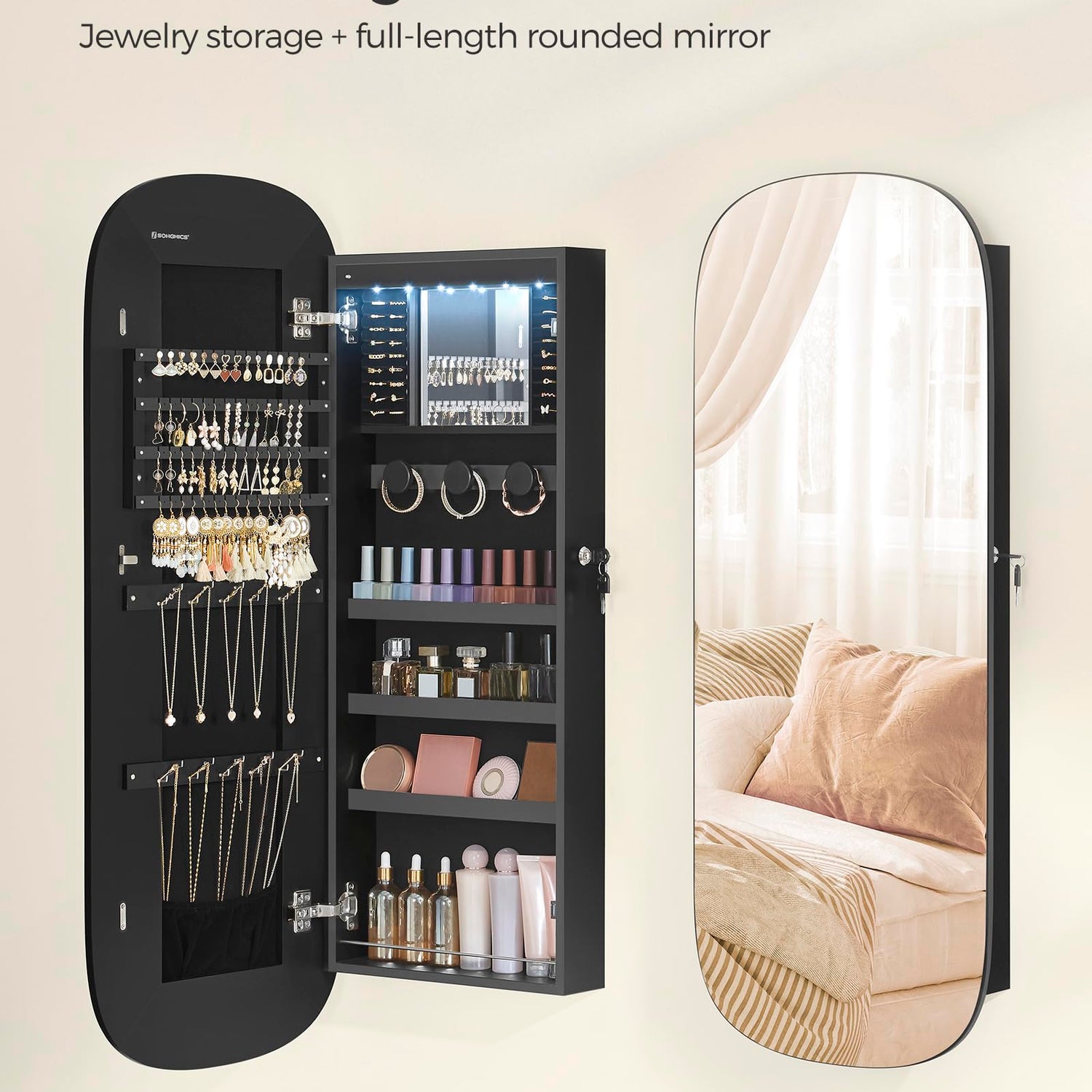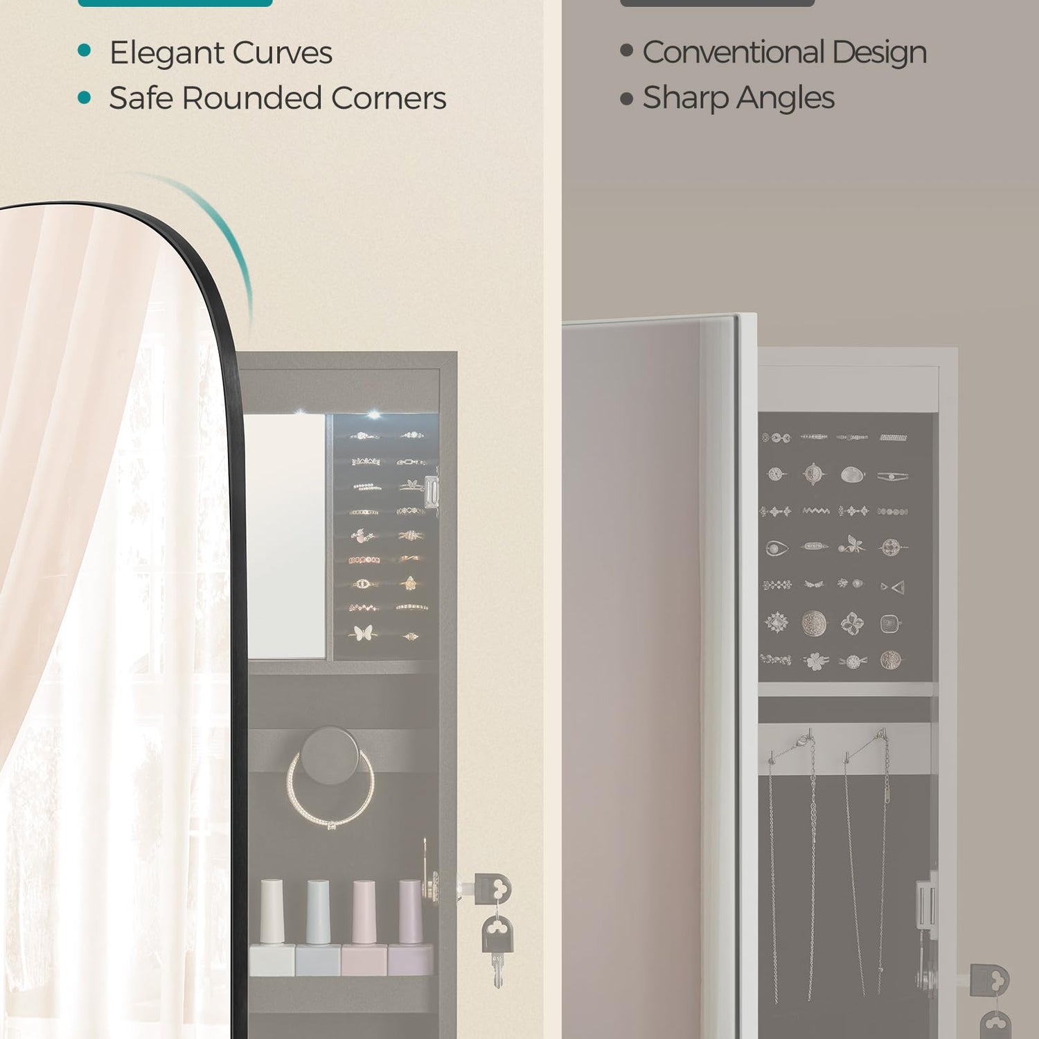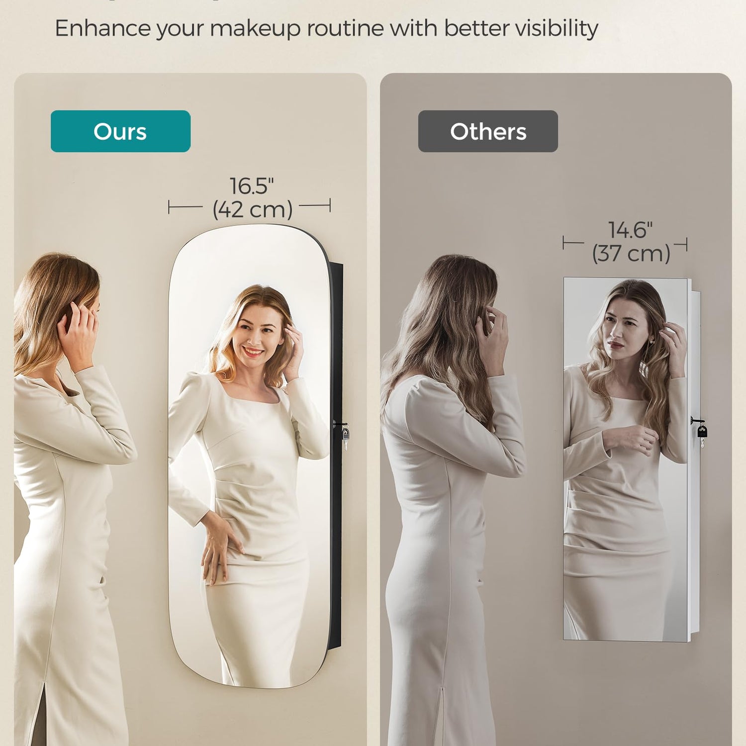 SONGMICS Jewelry Organizer, LED Jewelry Cabinet Wall or Door Mounted, Lockable Rounded Wide Mirror with Storage, Interior Mirror, 3.9 x 16.5 x 42.5 Inches, Black Surface with Black Lining