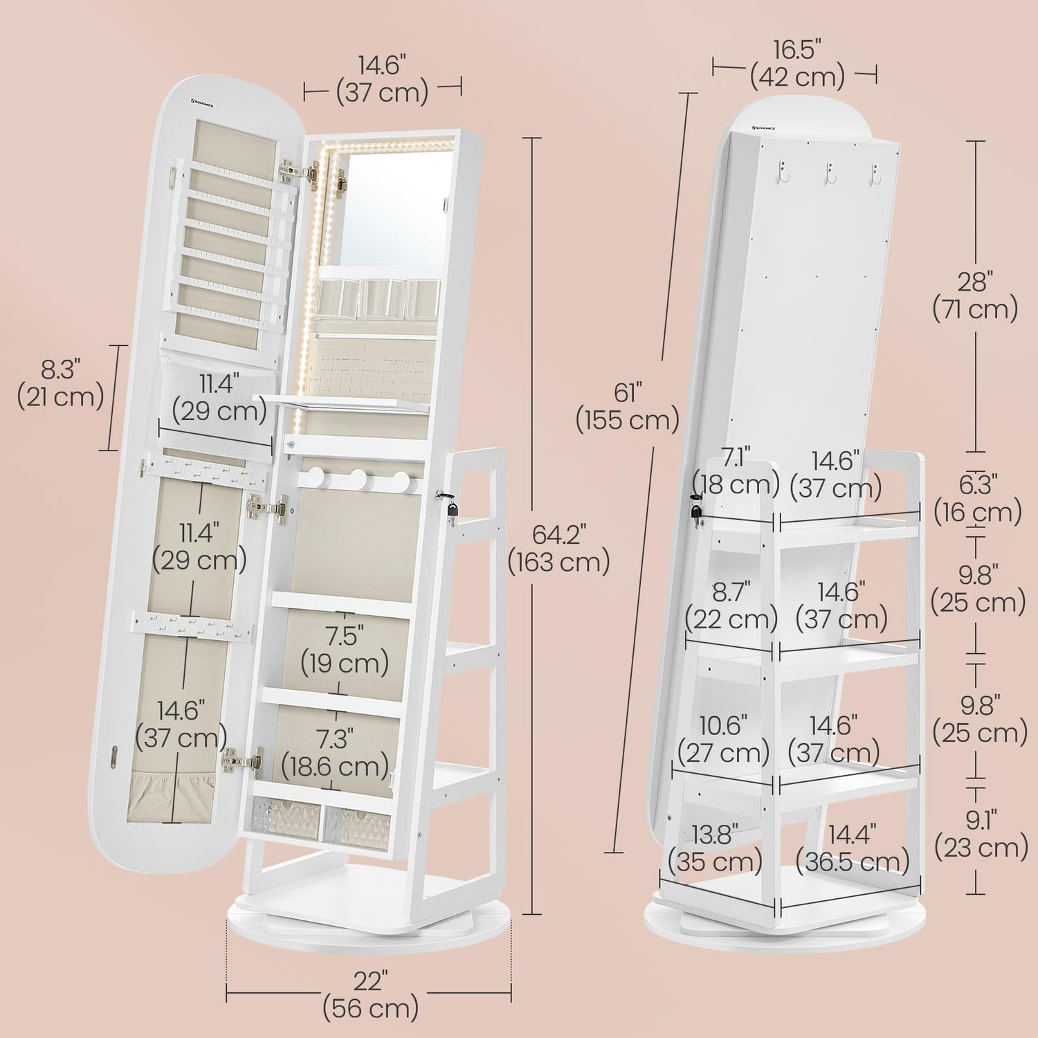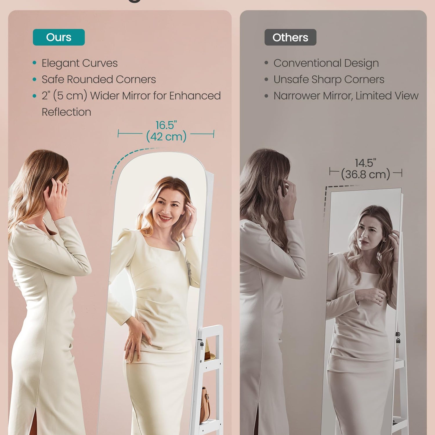 - 【CHIC MODERN AESTHETIC】Enhance any room with this elegant full-length mirror with rounded edges, merging modern elegance with practical functionality. Its floating effect creates a captivating focal point, cleverly hiding jewelry storage behind the mirror