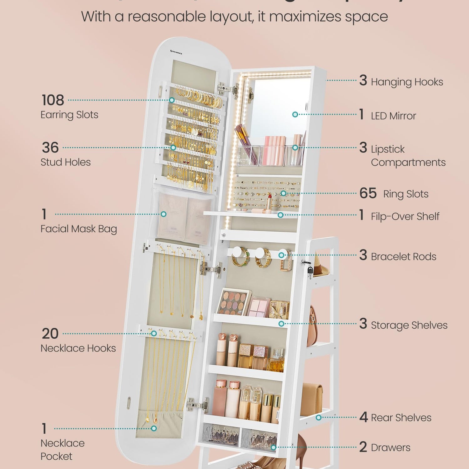 - 【MASSIVE STORAGE】108 earring slots, 36 stud earring holes, 20 necklace hooks, 65 ring slots, 3 bracelet rods—the jewelry jungle ends in this standing mirror jewelry cabinet. Plus, there are 3 compartments, 2 drawers, 4 shelves, and a bag for your makeup!