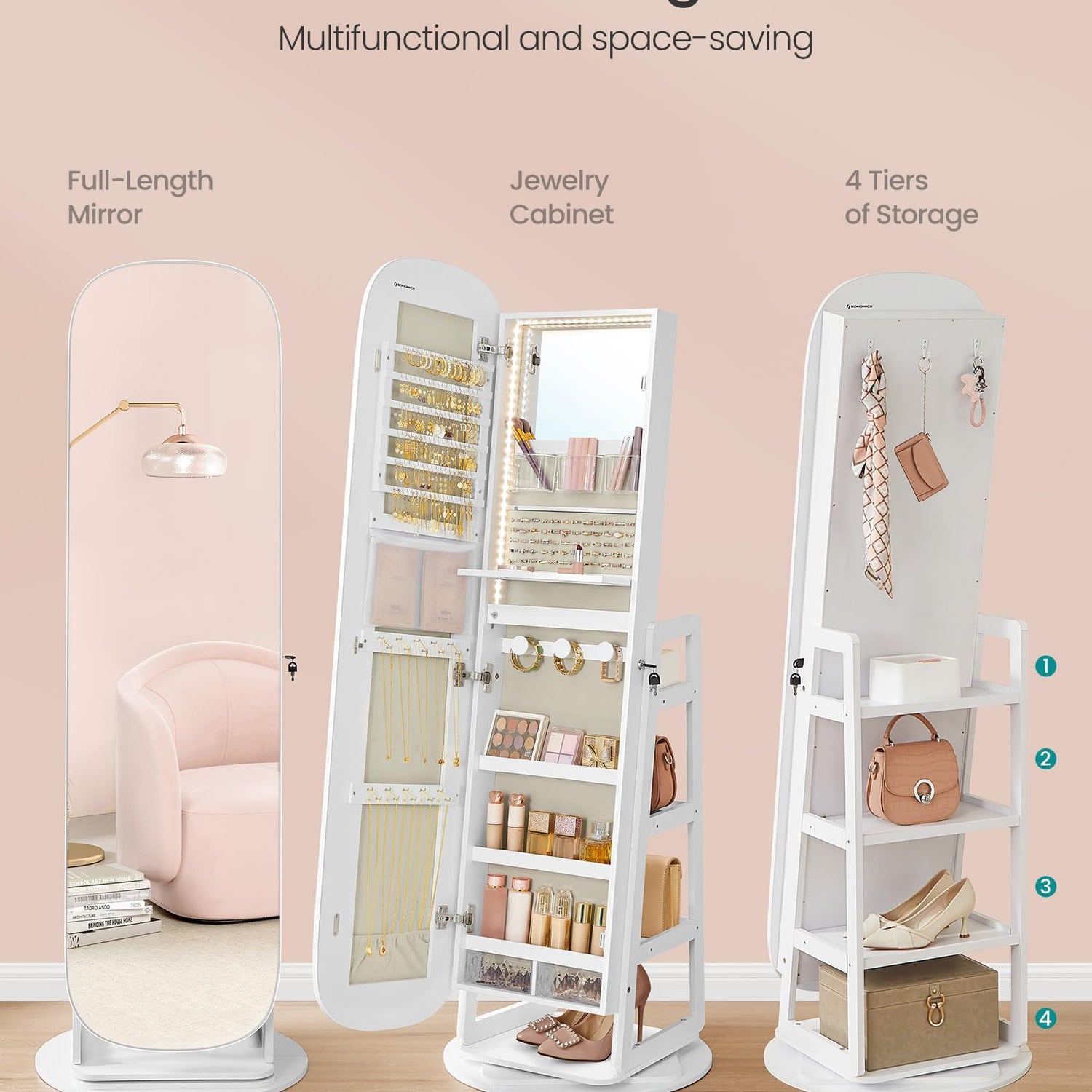 SONGMICS LED Jewelry Cabinet, 360° Swivel Jewelry Organizer, Lockable Mirror Jewelry Cabinet Standing, Rounded Wide Full-Length Mirror with Storage Shelves, Interior Mirror, Cloud White UJJC036W01