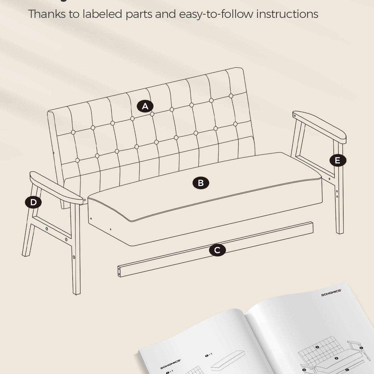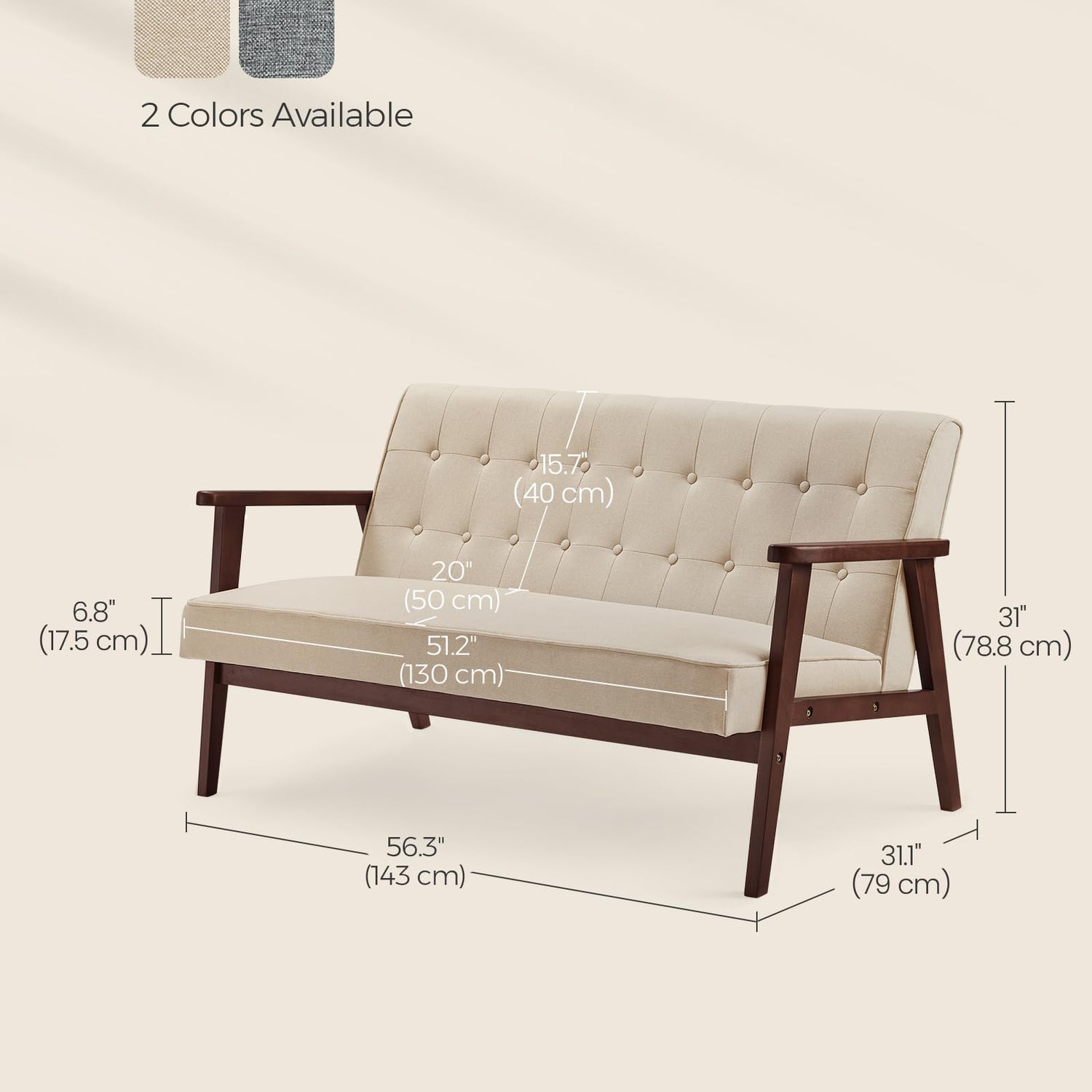SONGMICS Loveseat Sofa, 2 Seater Cushioned Couch for Small Spaces, Mid-Century Modern 51.2-Inch Wide Seat with Solid Wood Armrests, Easy Assembly, for Living Room Bedroom, Sand Beige ULAC012M01
