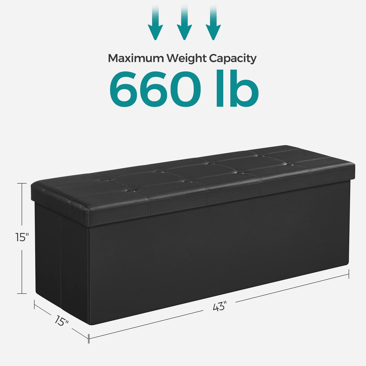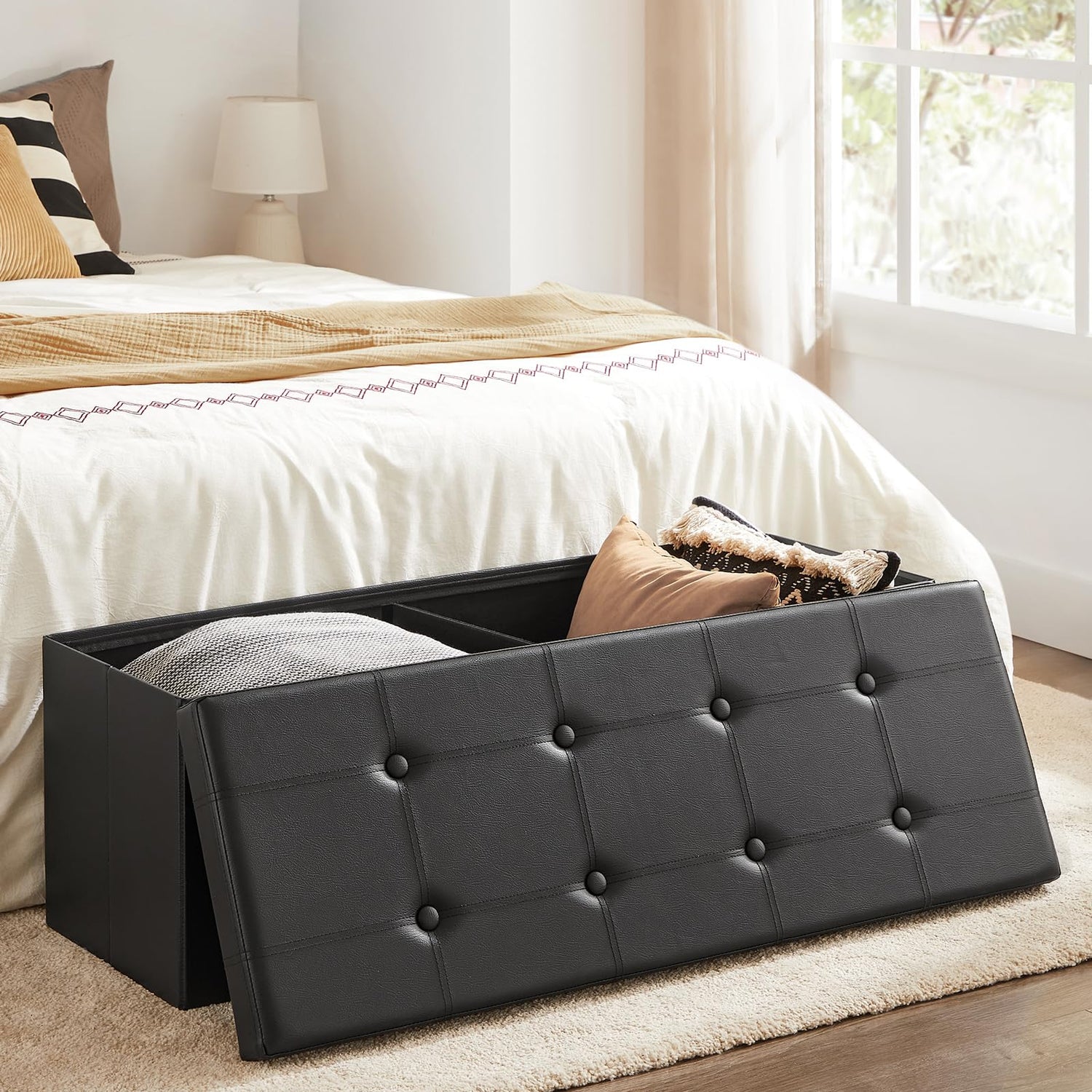 SONGMICS MAZIE Collection - 43 Inches Folding Storage Ottoman Bench, Ottoman with Storage, Foot Rest Stool, Load 660 lb, for Living Room, Synthetic Leather, Black ULSF701