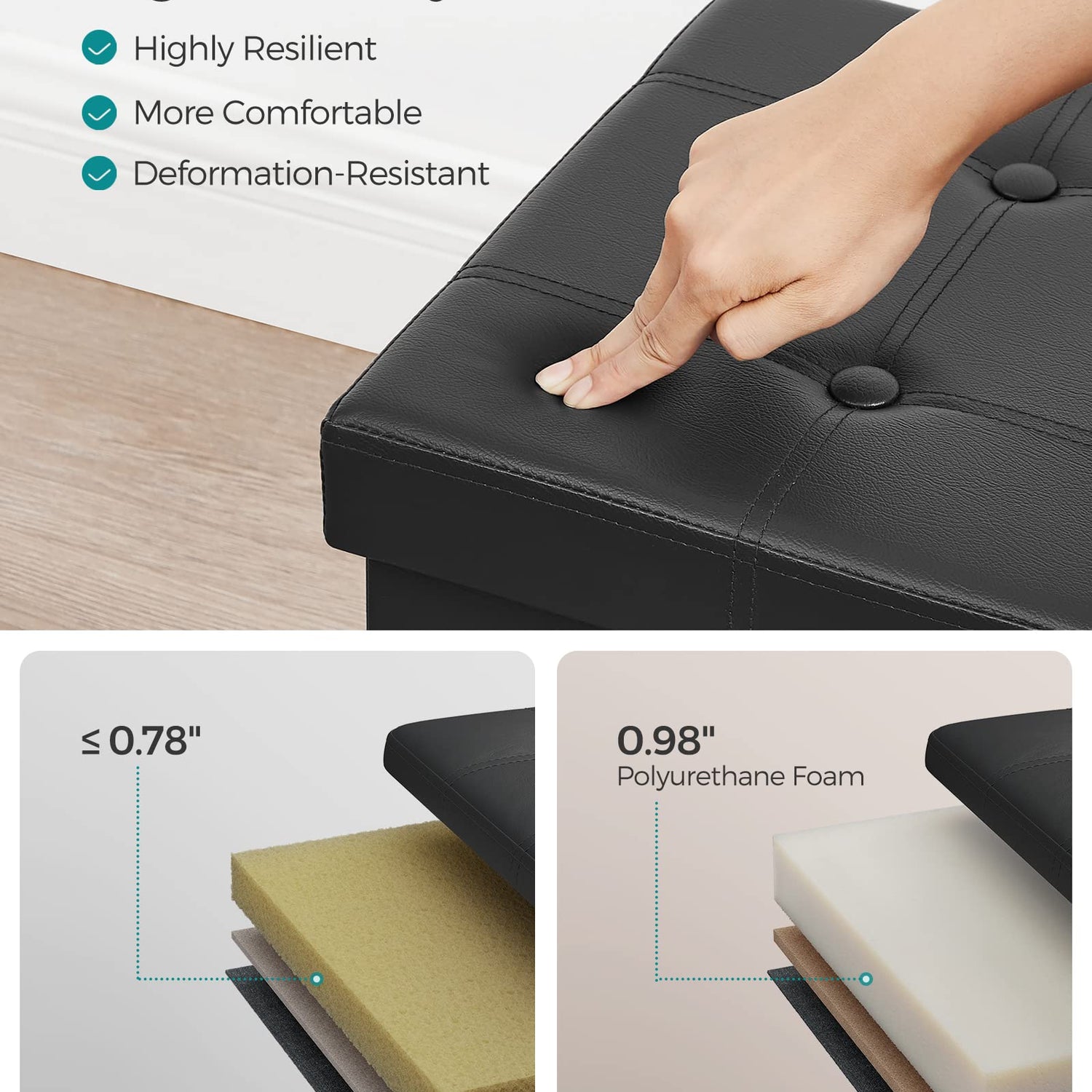 - 【COMFORTABLE SEATS】Padded with 1" (2.5 cm) thick, high-resilient, high-density foam, this storage bench is resistant to deformation, so you can sit on it comfortably