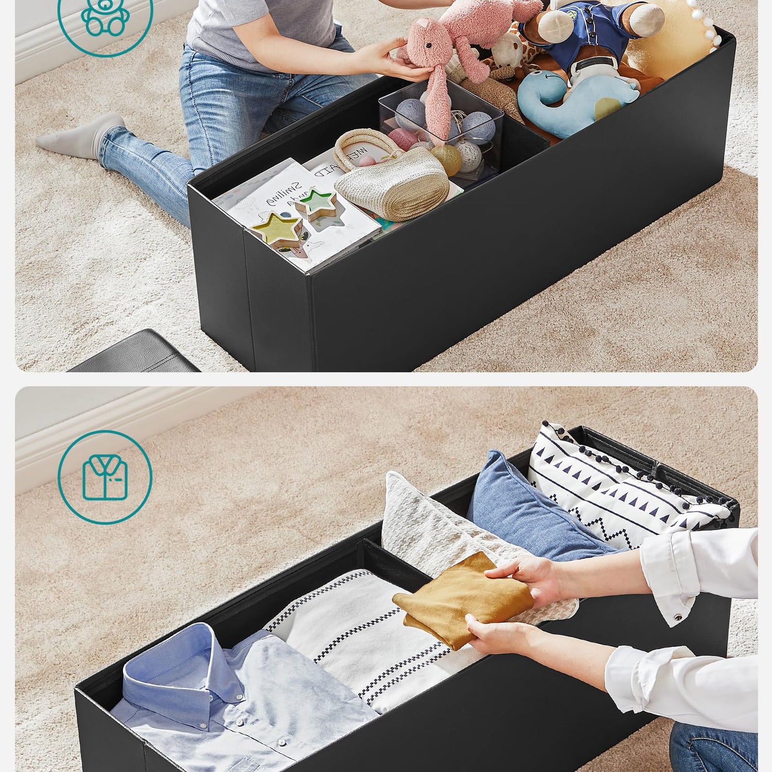 - 【OODLES OF STORAGE】Unfold this storage box, insert the sturdy base plate, and you have 35 gal. (131 L) space for storing bed linen, books, or clothing