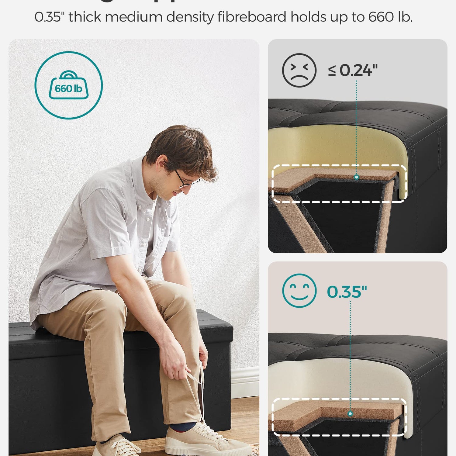 - 【GREAT STRENGTH】Built with thick MDF panels and reinforced with metal corner guards on the lid, this storage chest is strong enough to hold up to 660 lb (300 kg), so you can sit on it with your mind at ease