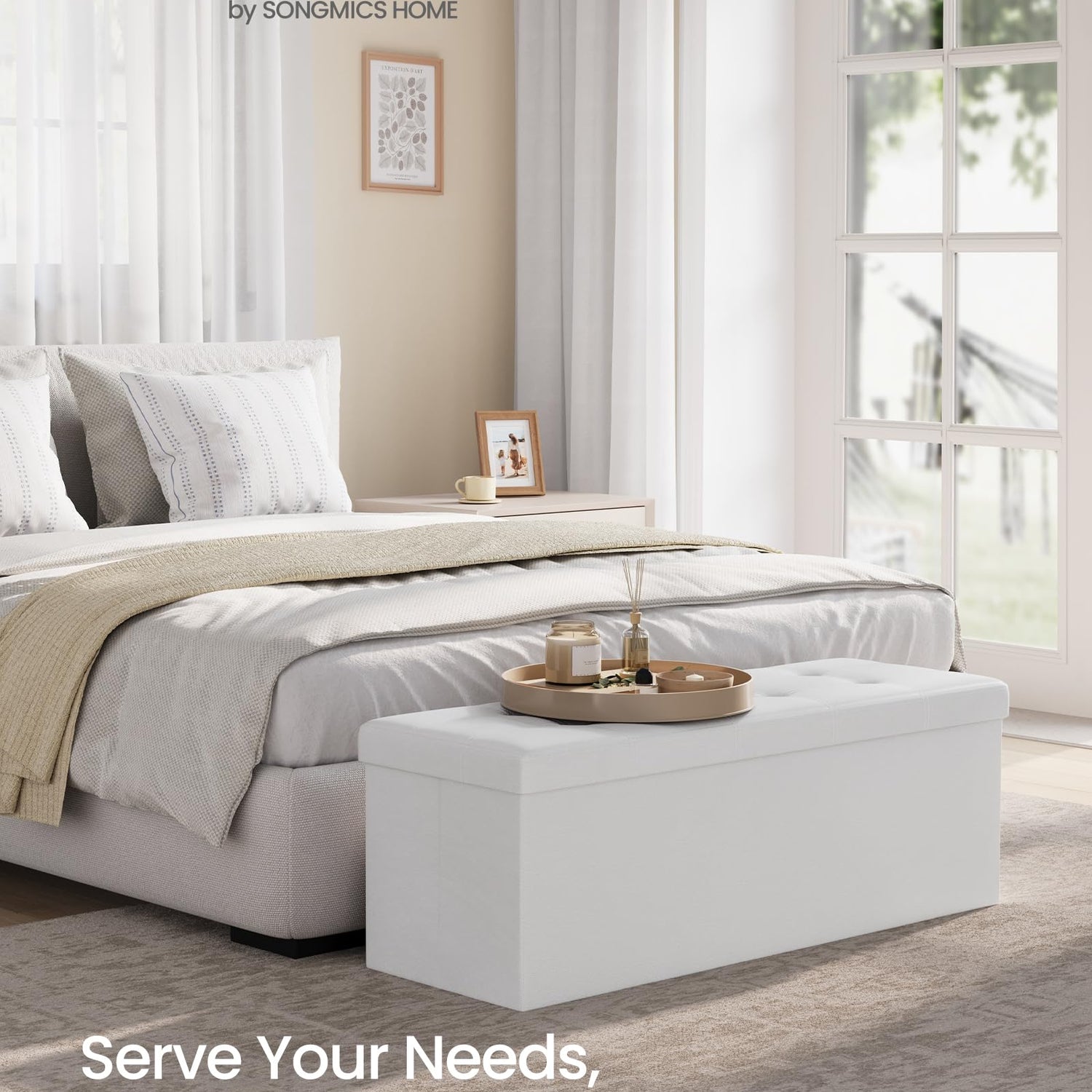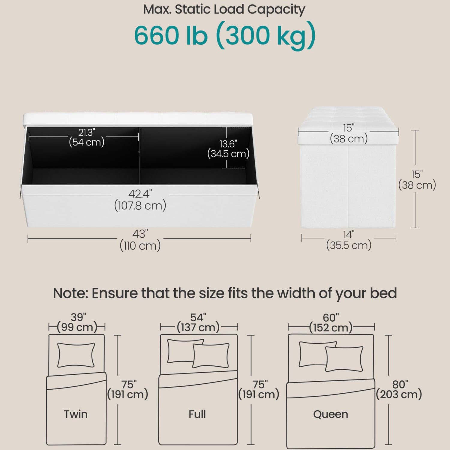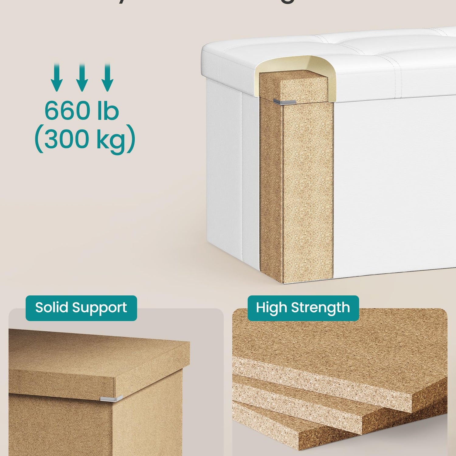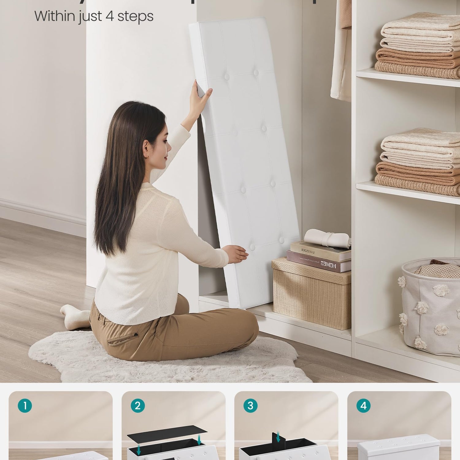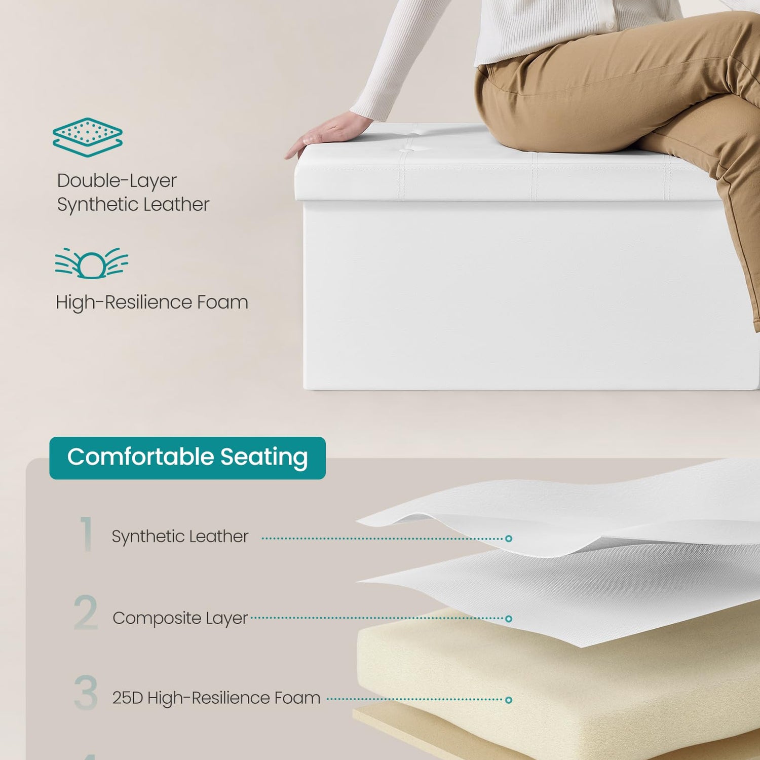 SONGMICS MAZIE Collection - 43 Inches Folding Storage Ottoman Bench, Ottoman with Storage, Foot Rest Stool, Load 660 lb, for Living Room, Synthetic Leather, White ULSF702
