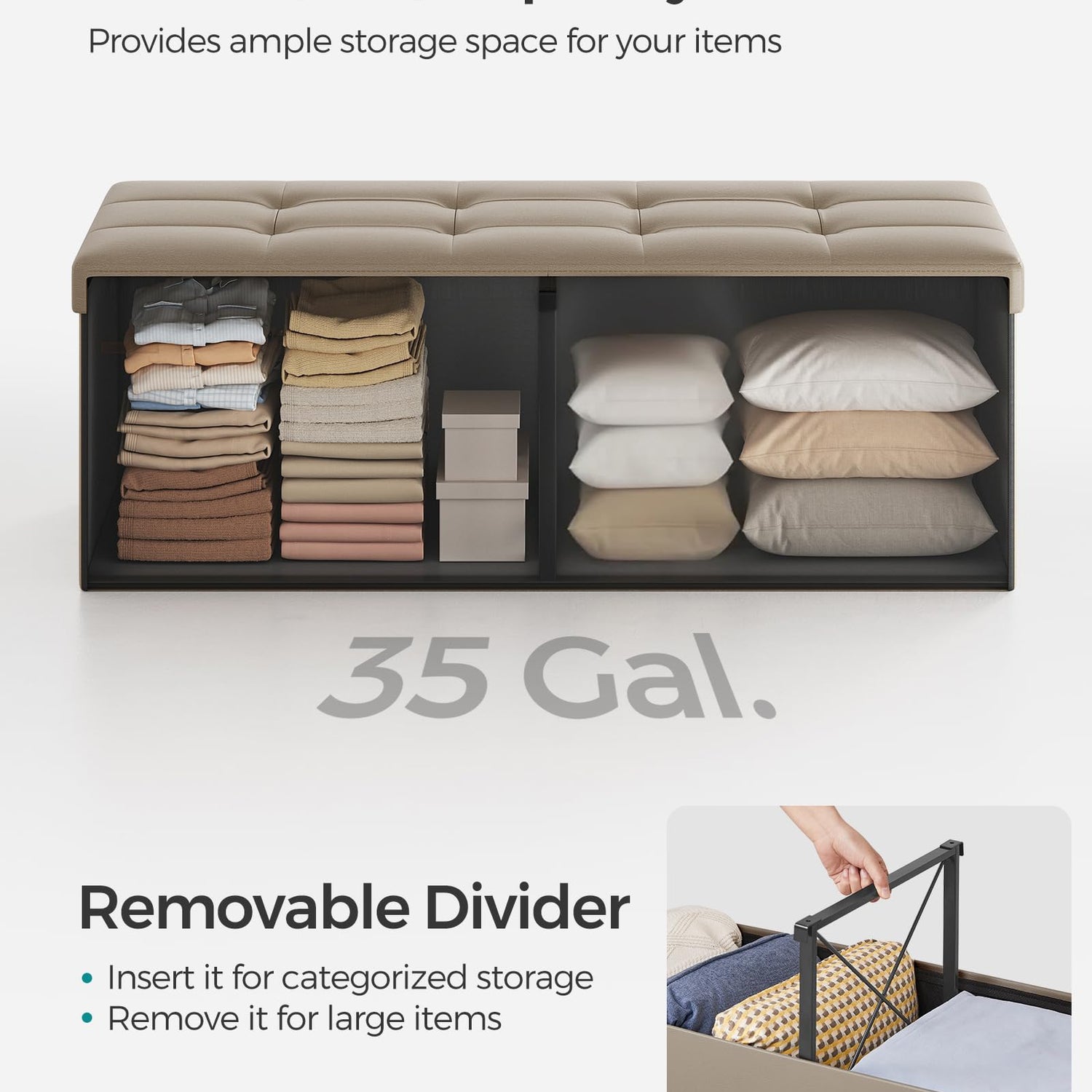 - 【AMPLE STORAGE】With a 35-gallon (120 L) capacity, this 15"D x 43.3"W x 15"H (38 x 110 x 38 cm) storage ottoman can stow away your books, blankets, and bed linens. It also has a removable divider for categorized storage or larger items