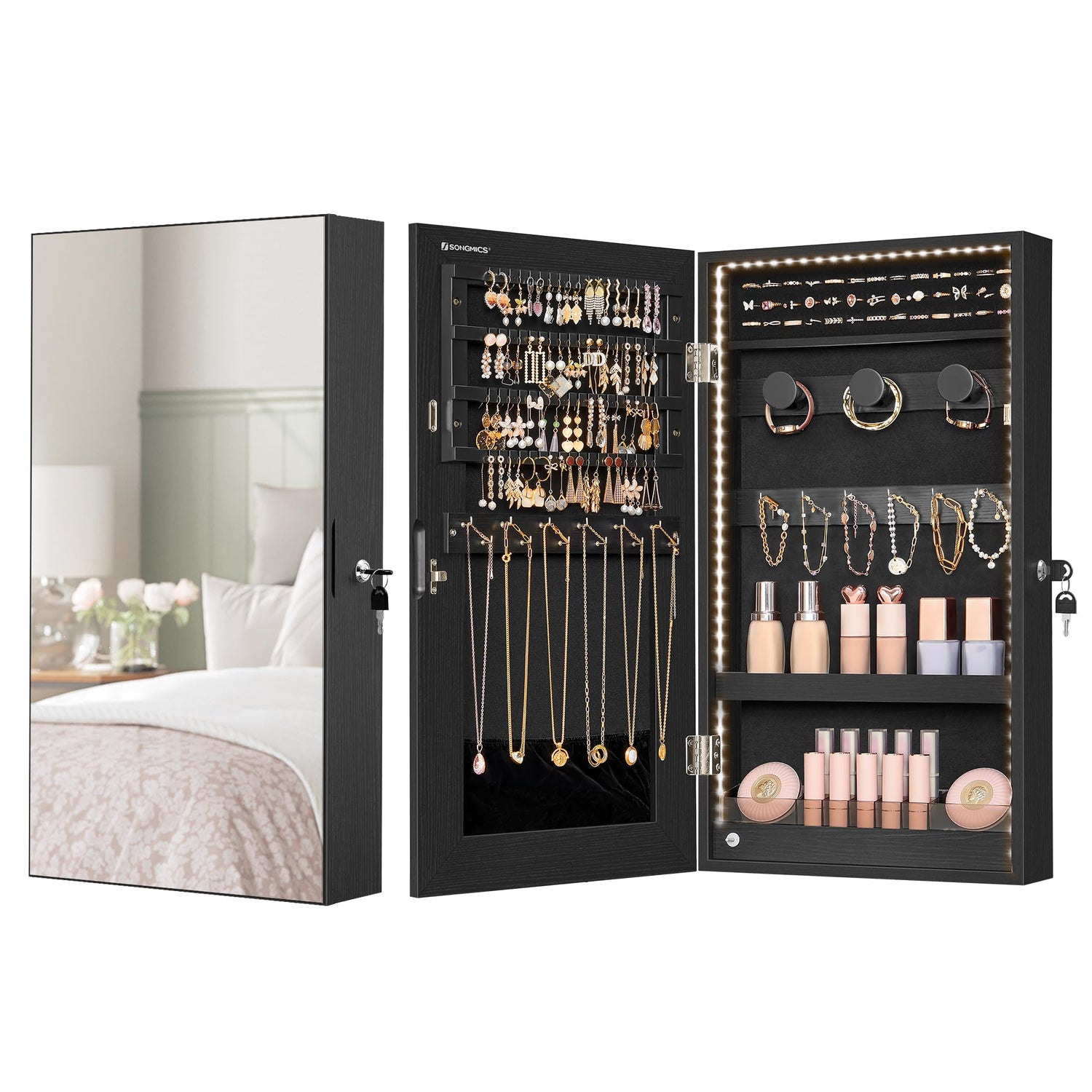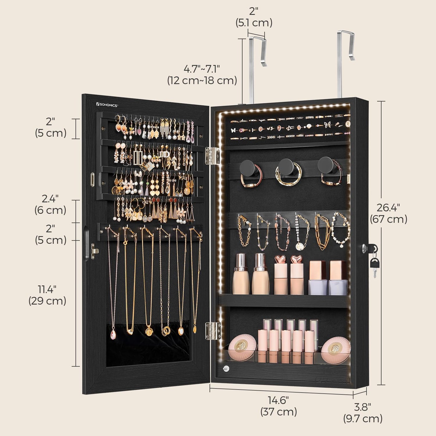 SONGMICS Mirror Jewelry Cabinet Armoire with Built-in LED Lights, Wall or Door Mounted Jewelry Storage Organizer, 3.8 x 14.6 x 26.4 Inches Hanging Mirror Cabinet, Gift Idea, Black UJJC050B01