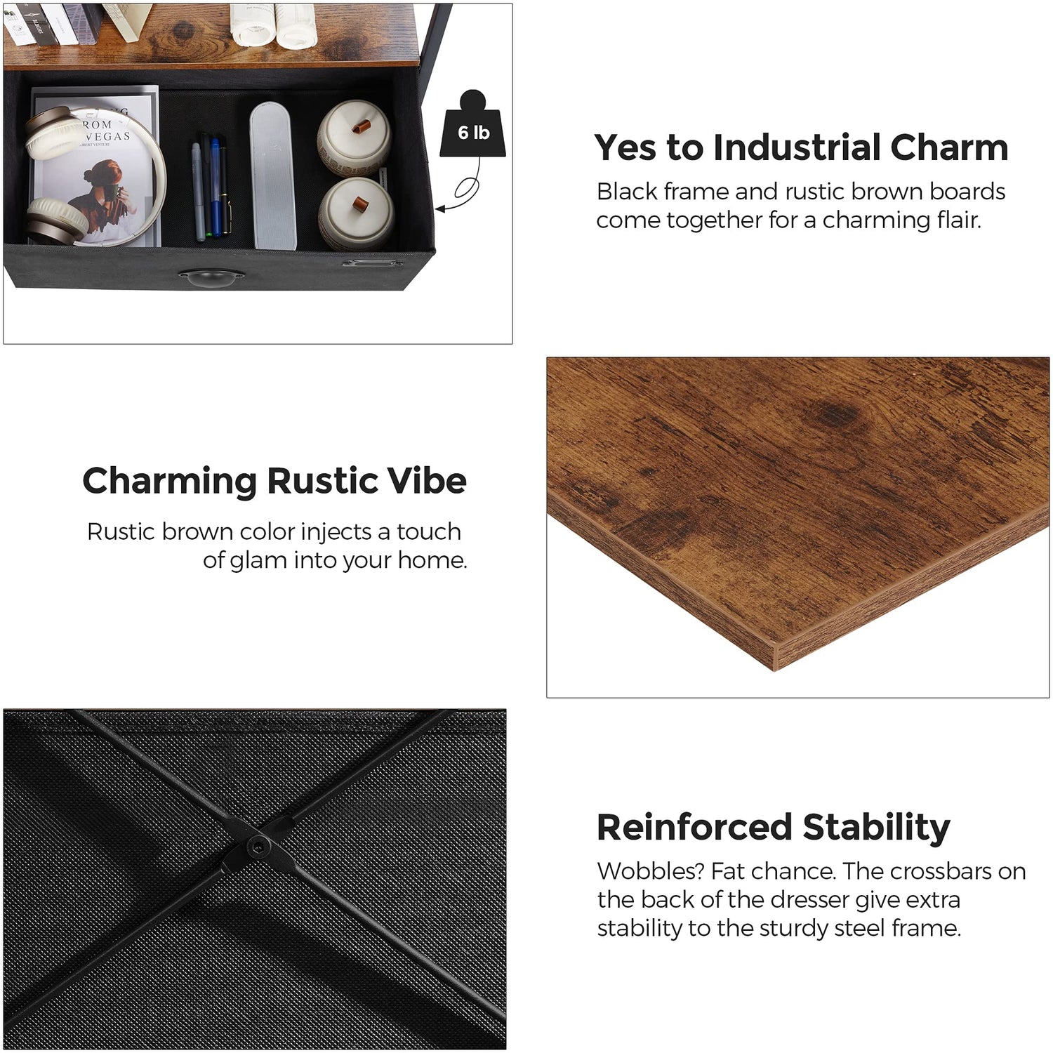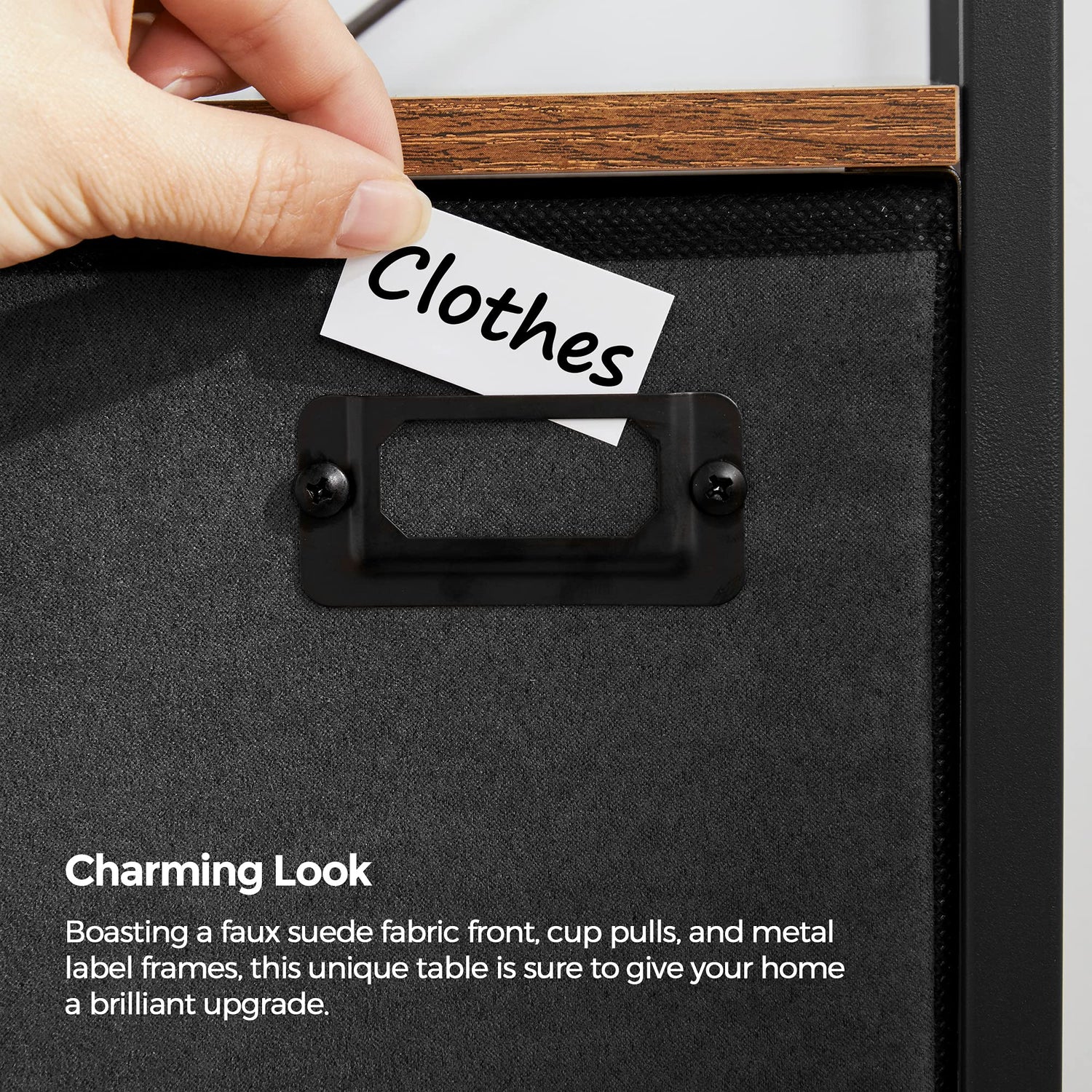 - Charming Everywhere: A rustic top paired with the black metal frame gives a charming industrial look; how about the details? The soft faux suede fabric front and metal cup pulls are icing on the cake