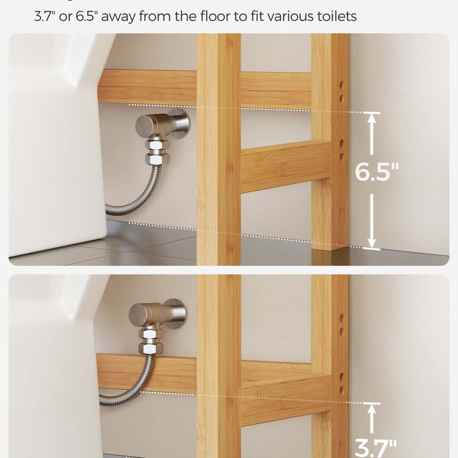 - [Adjustable for the Perfect Fit] The middle shelf of this over-the-toilet organizer is adjustable to 3 heights to hold shampoos or flower pots for a touch of greenery; the bottom bar can be set either 3.7” or 6.5” away from the floor to fit various toilets