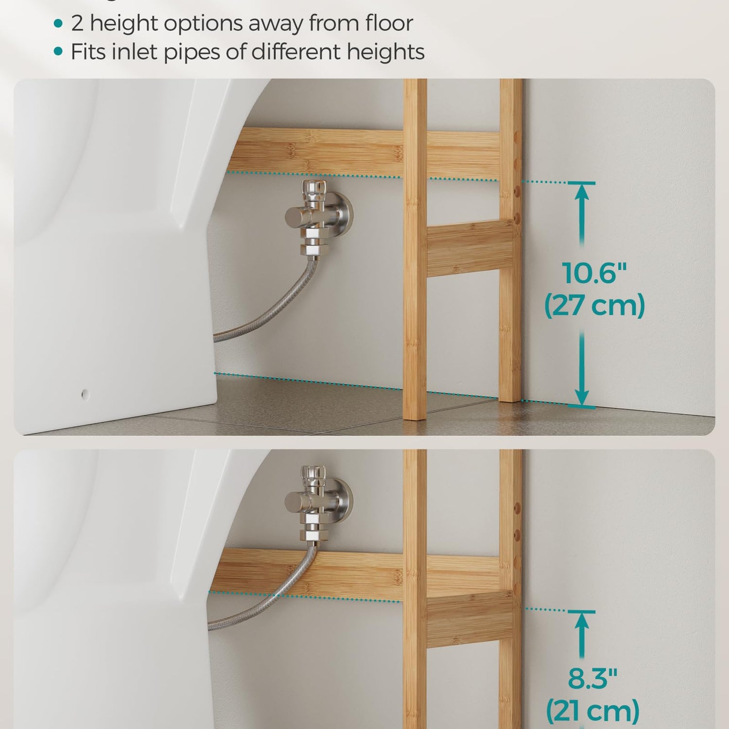 - [Fits Most Toilets] With a clearance of 37.5" from the floor to the bottom shelf, this heightened rack fits over most toilets and allows for contactless opening of the toilet lid. The bottom bar is adjustable to 3 positions so it won't obstruct pipes