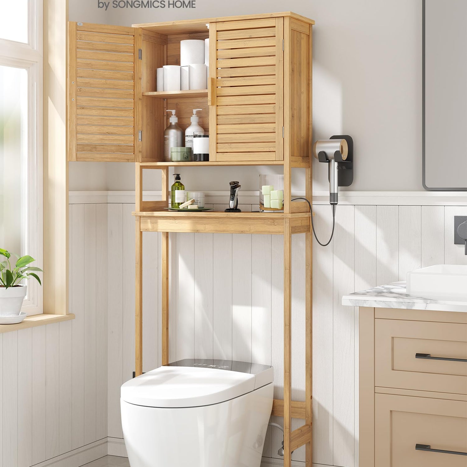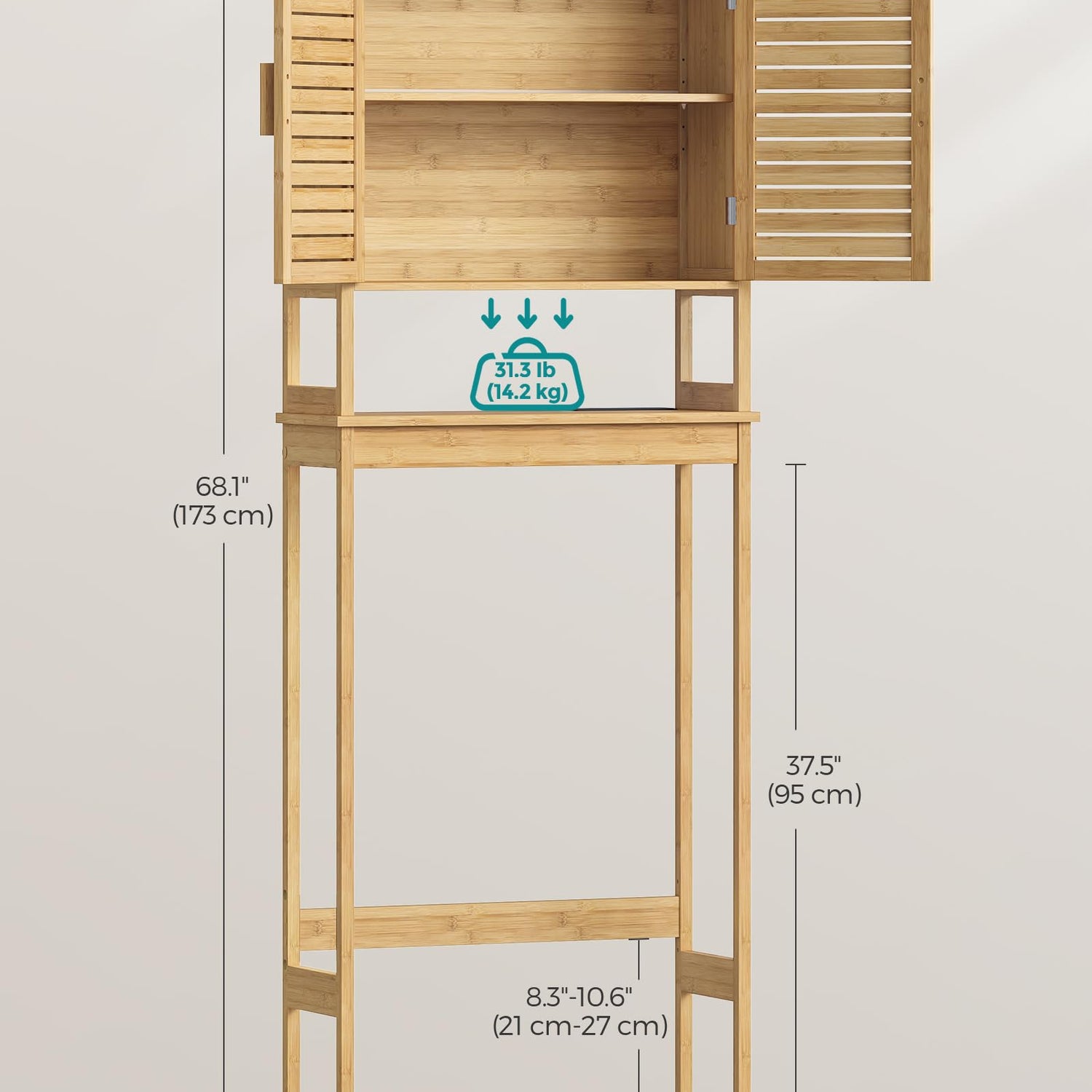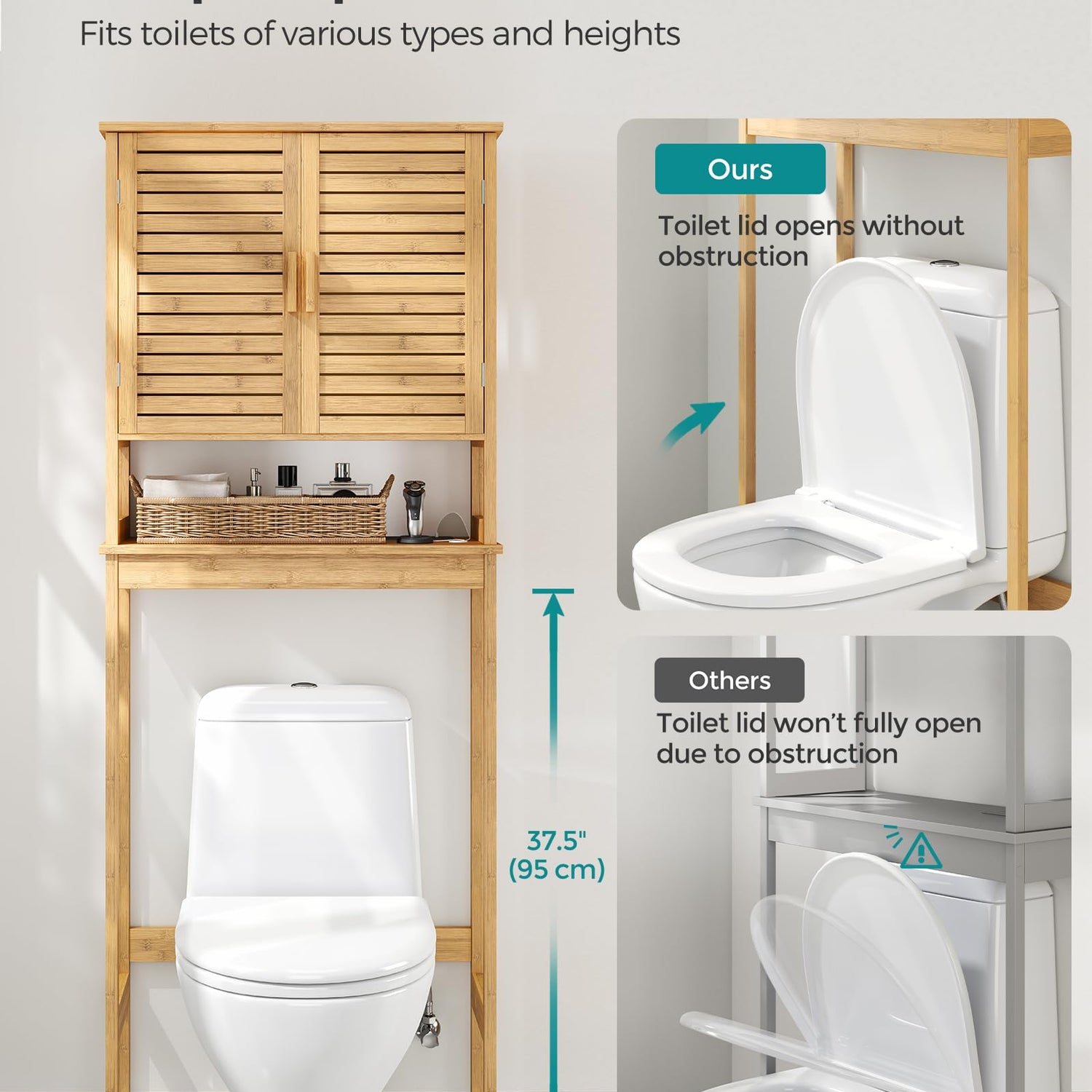 - [Organize Your Bathroom] Need more storage space in your bathroom? Look no further. This tall 3-tier over-the-toilet cabinet with 2 doors keeps essentials organized without occupying excessive space. Say goodbye to bending down for items under the sink!