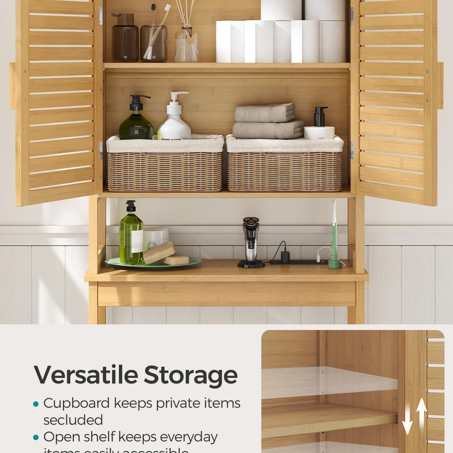 - [Open and Closed Storage] This bathroom cabinet has everything you need, with an open shelf for frequently used items like lotions, shower gel, toilet paper, and towels, as well as a cabinet with 2 doors and an adjustable shelf as a hidden storage option
