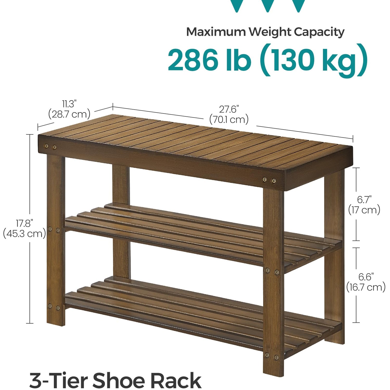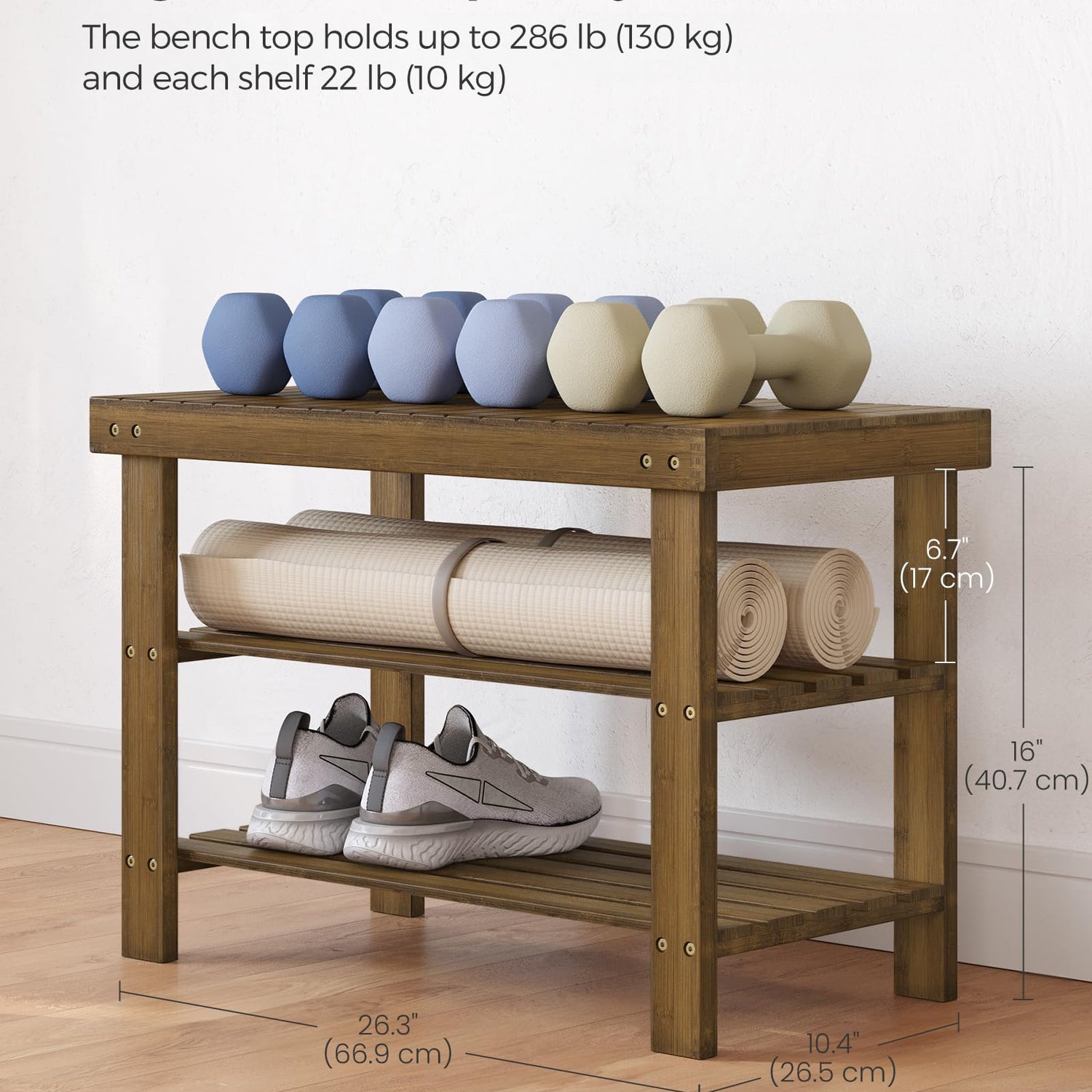 - 【STURDY AND DURABLE】Crafted from premium natural bamboo, this shoe rack can support up to 286 lb on the top, allowing you to sit and change your shoes with confidence. Each shelf can hold up to 22 lb, providing reliable support for your items