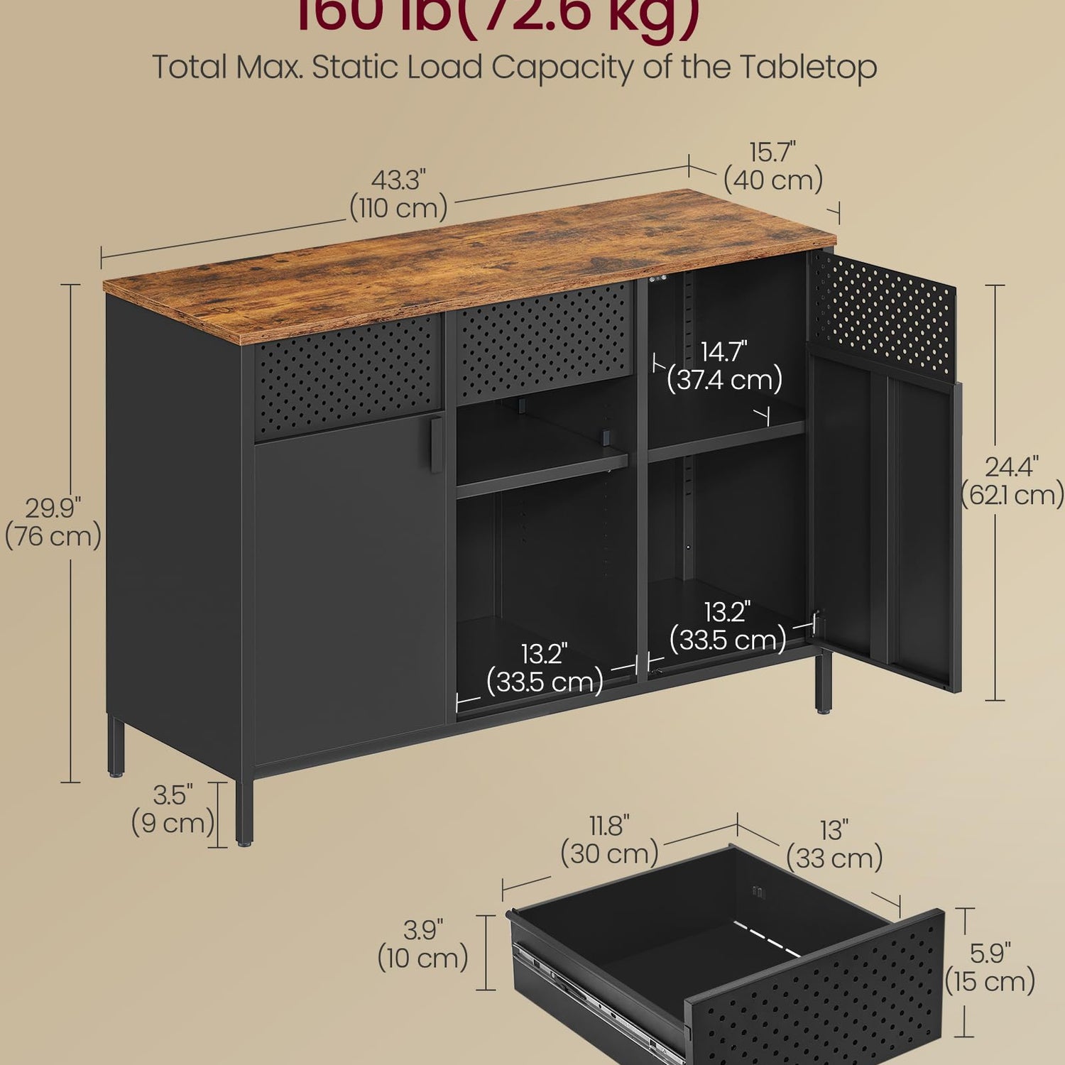 - 【DURABLE & EASY TO MAINTAIN】Constructed from quality materials, this 15.7"D x 43.3"W x 29.9"H sideboard is built to last and can support heavy items (tabletop holds up to 160 lb). The steel cabinet body is moisture-resistant and easy to clean