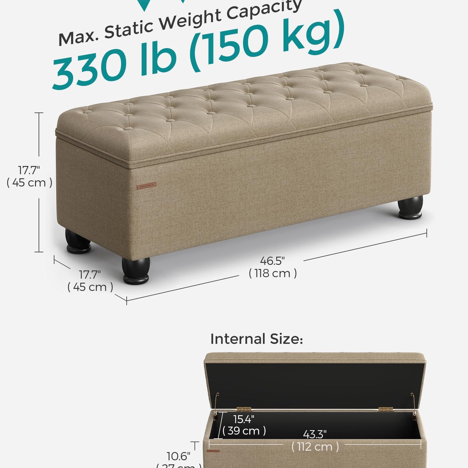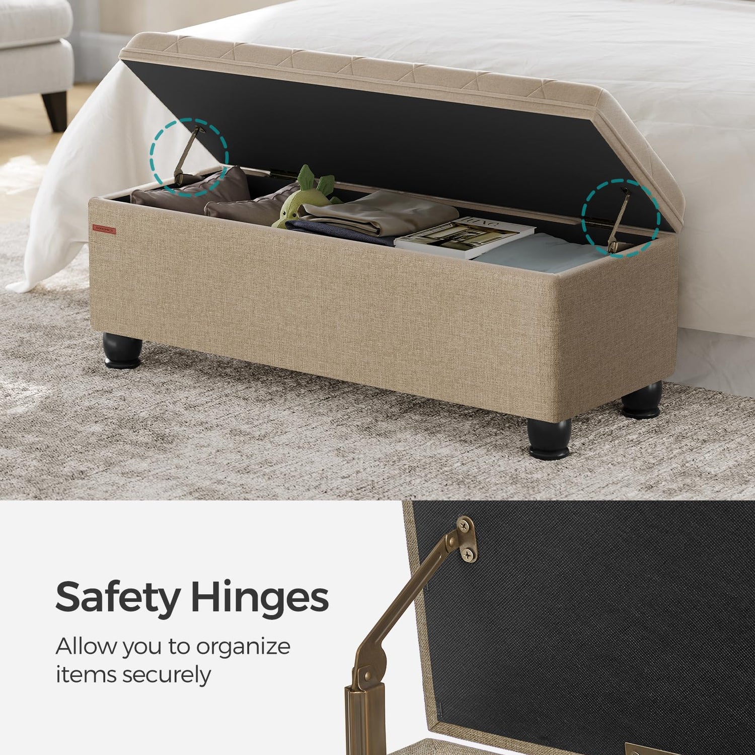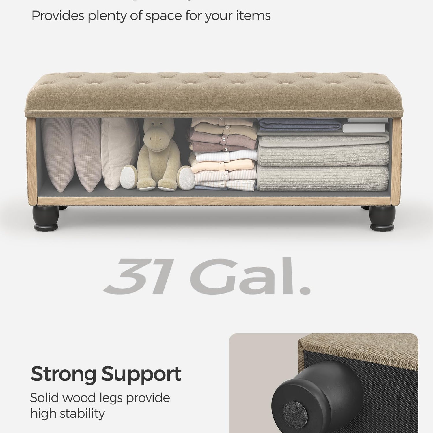 SONGMICS Storage Ottoman, Storage Bench, Tufted Entryway Bedroom Bench, 17.7 x 46.5 x 17.7 Inches, Hinges Easy Lid Operation, Wooden Legs, Linen-Look Cover, Loads 330 lb, Camel Brown ULOM070K01
