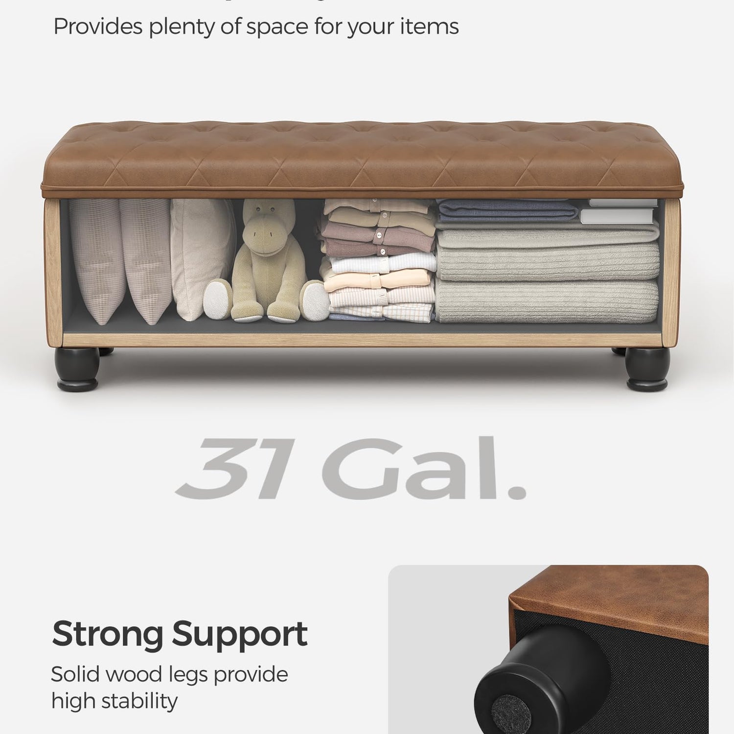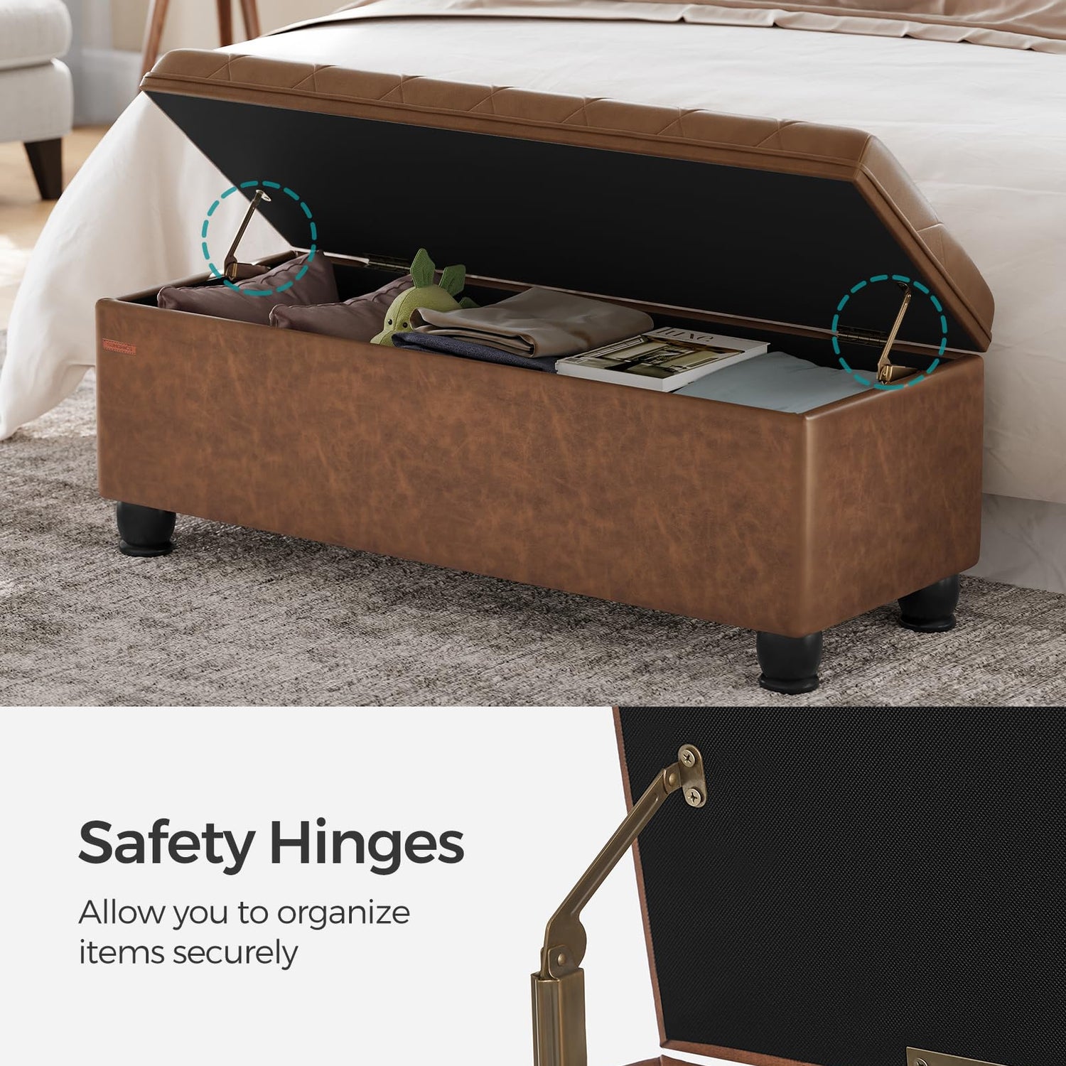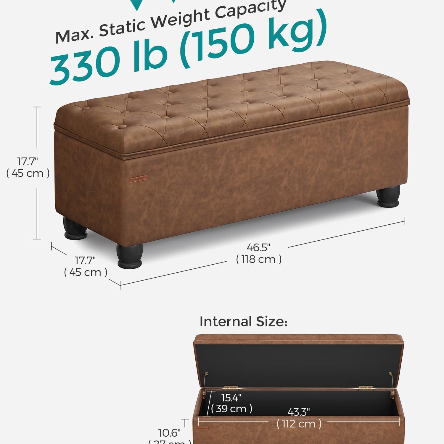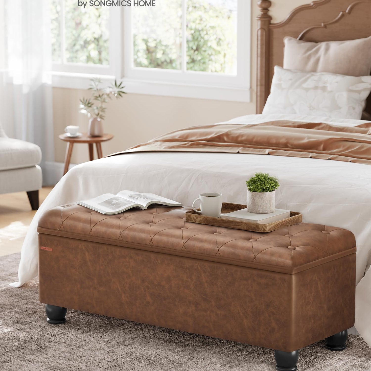 SONGMICS Storage Ottoman, Storage Bench, Tufted Entryway Bedroom Bench, 17.7 x 46.5 x 17.7 Inches, Hinges Easy Lid Operation, Wooden Legs, Synthetic Leather, Loads 330 lb, Coffee Brown ULOM071K01