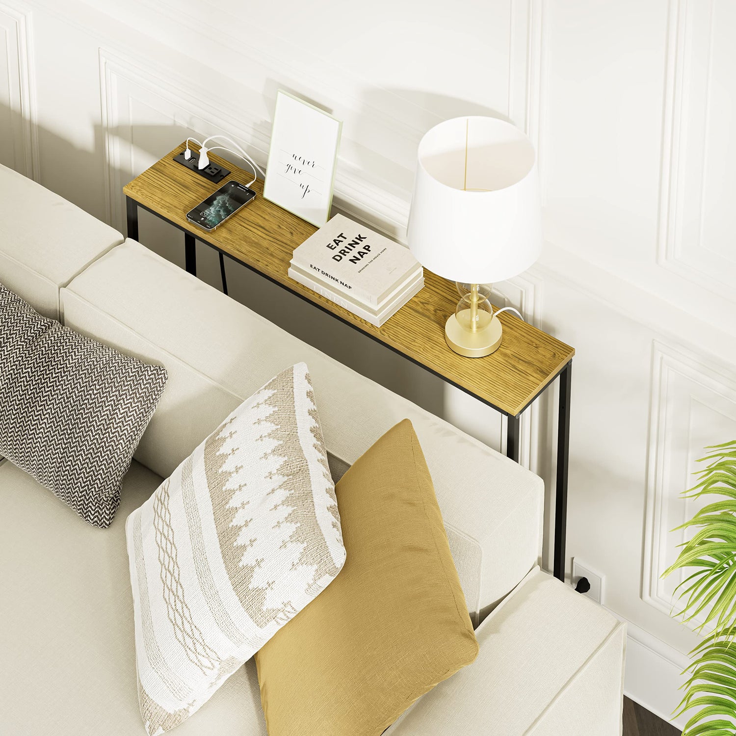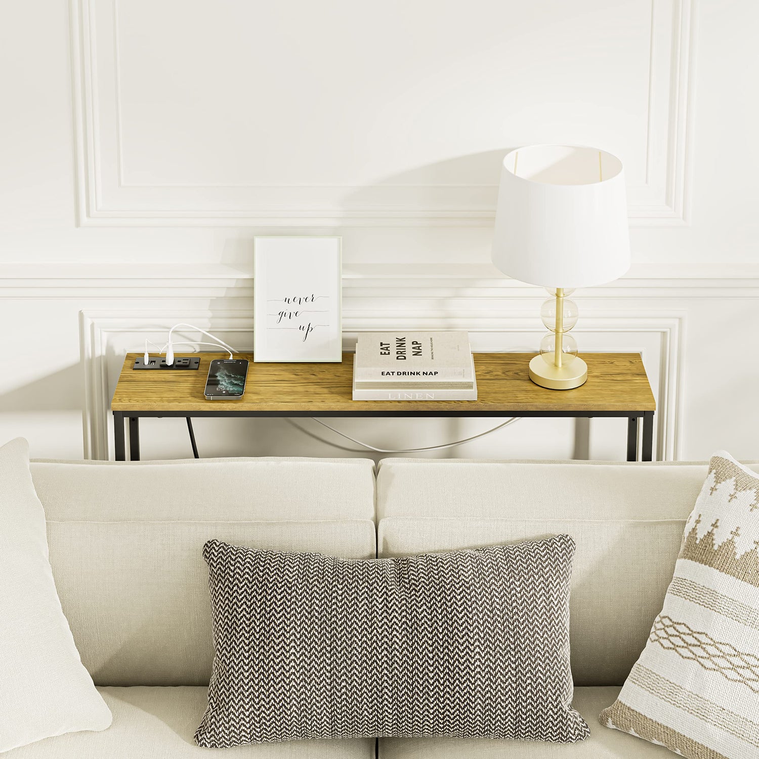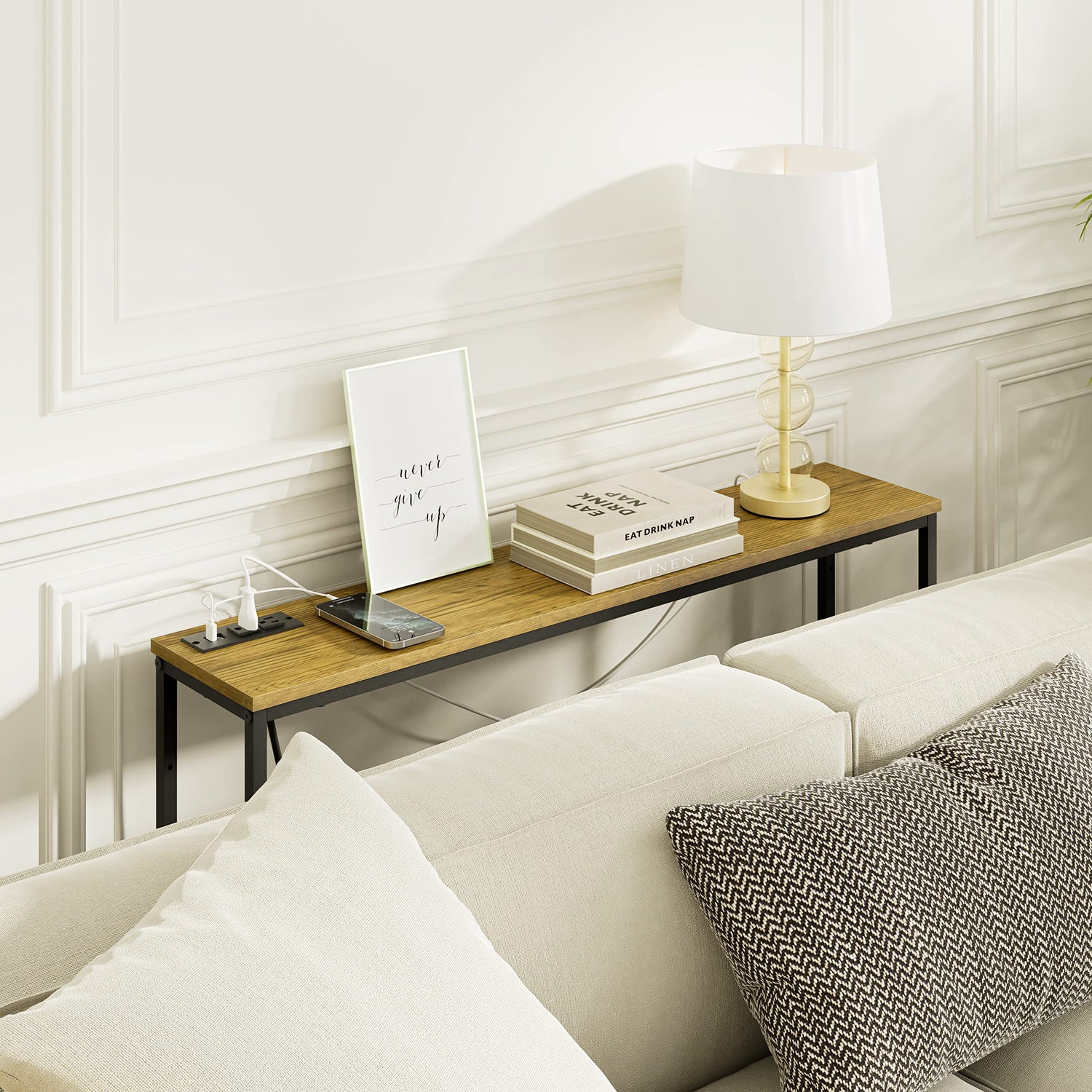 - Perfect Home Facilitles: The sofa table is equipped with 2 socket plugs and 2 USB ports, plus a 79" power cord, which perfectly solves your charging problems. Desk lamps,iphones, iPads, small fans... all is well. No low battery worries.