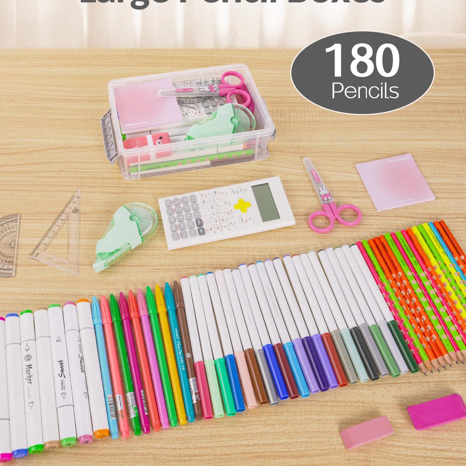- Large Pencil Boxes: Sized (L)8.6in x (W) 5.5in x (H)2.7in. Interior Dimensions: 7.8"L x 4.9"W x 2.4"H. This hard pencil box is deeper than the standard pencil case. It holds a lot of pens in the bottom. Comes with 6 pack stackable pencil boxes, holds 180+ pencils, 100+markers, 200+ crayons, and the other accessories.