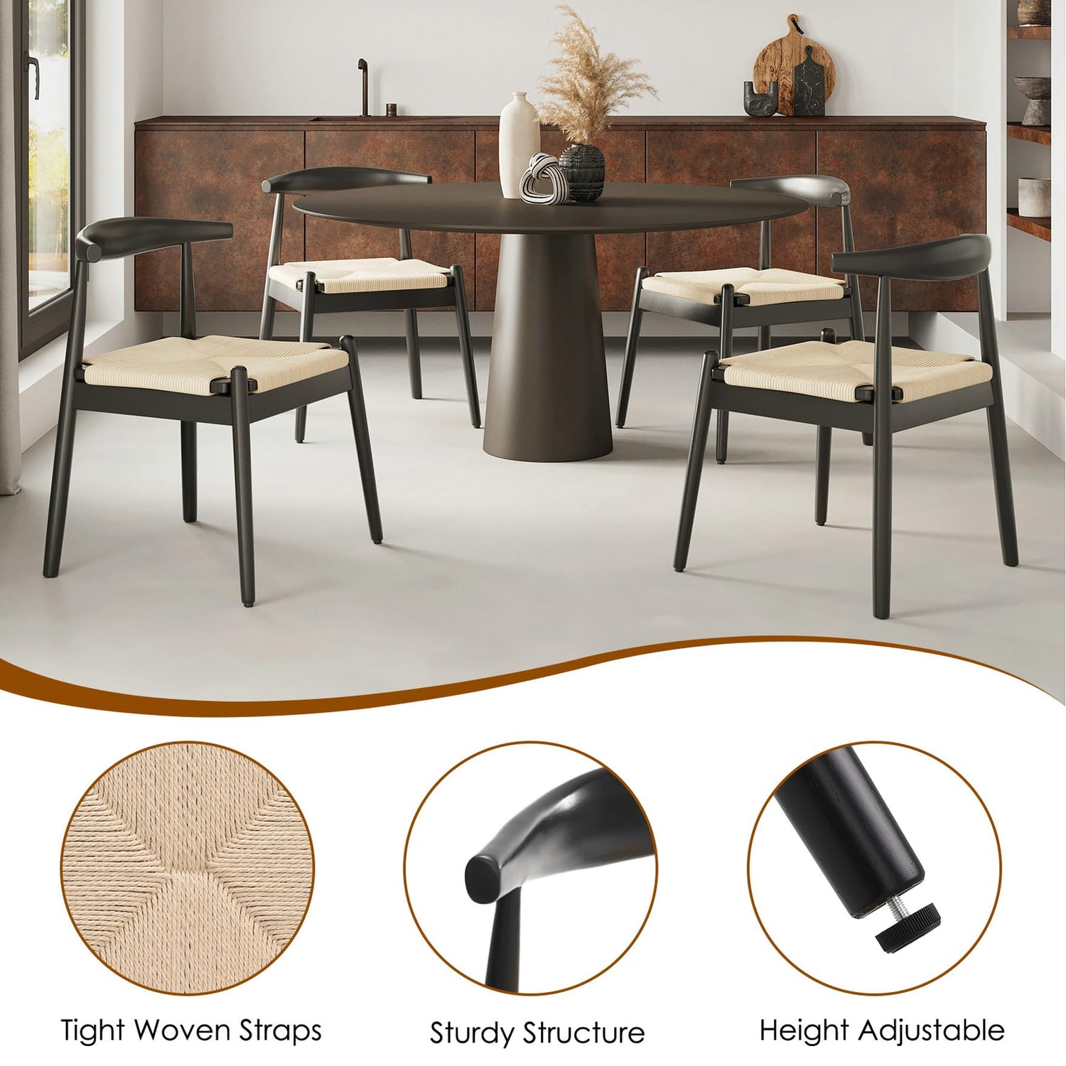 - Elegant Design: We designed an exquisite woven rope seat for this dining chair, which makes this woven dining chairs looks elegant and stylish. This dining room chairs can create a harmonious environment for your dining room and living room.