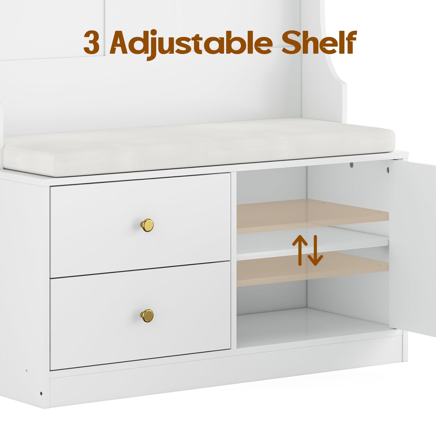 - 6-in-1 Hall Tree with bench and shoe storage: 7 sturdy hooks (15 lbs capacity each) serve as a coat rack replacement.The robust entryway shoe bench features a comfortable 1.6" thick cushion for a pleasant seating experience.2 spacious drawers and an adjustable-height shoe rack allow you to store various sizes of shoes,while the top storage area is perfect for keeping your personal items organized