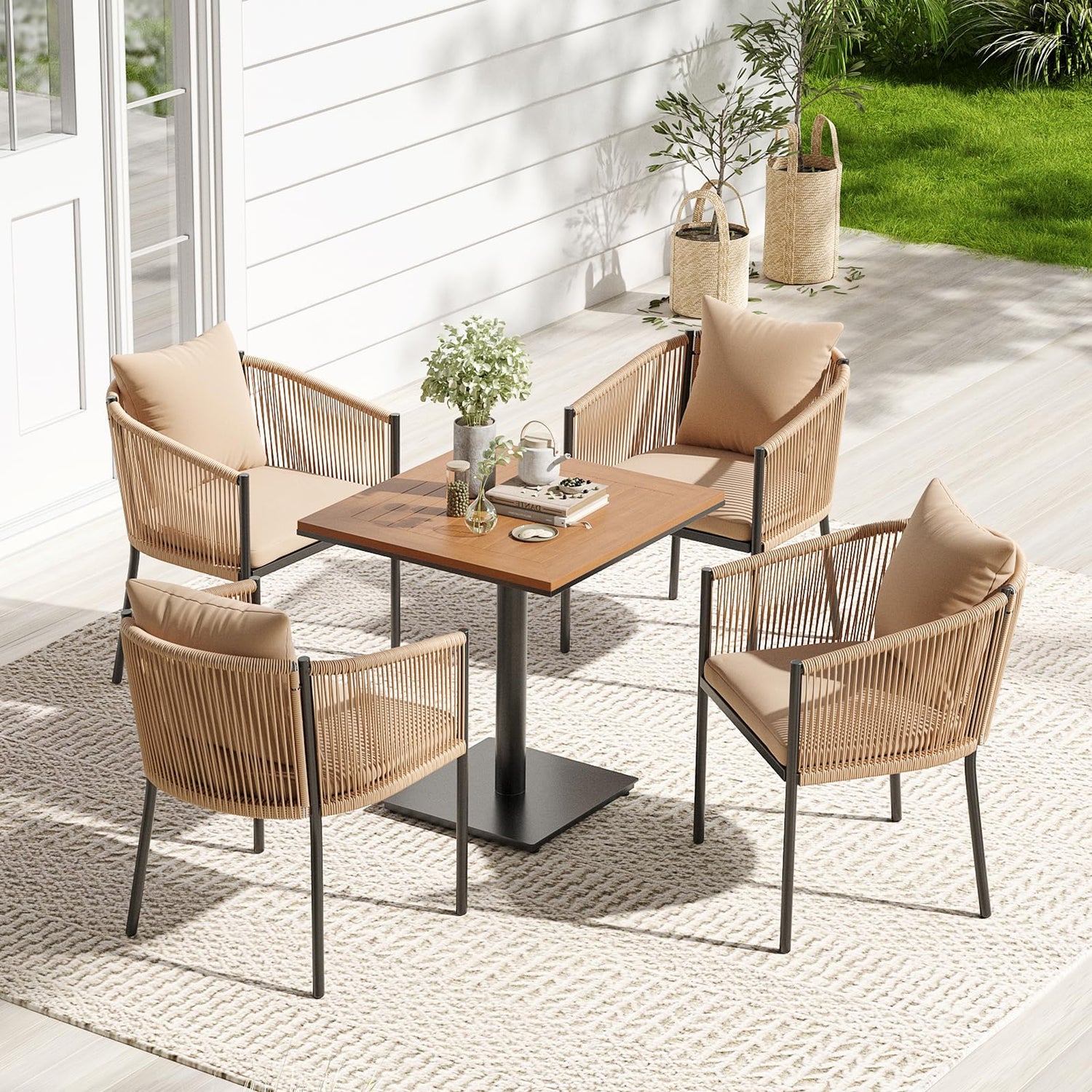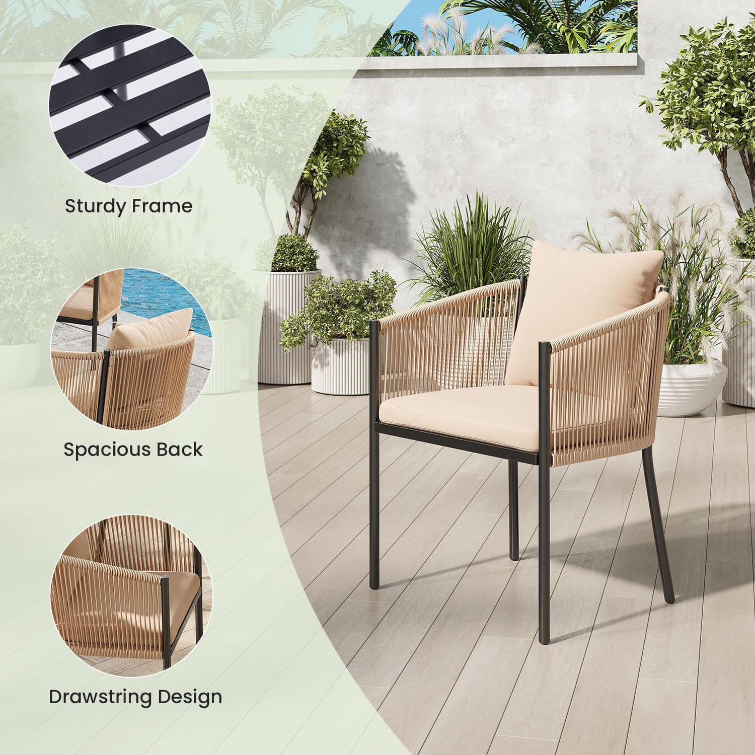 - [MARKED COMFORT]: The patio dining set is designed for comfort. Curved armrests and a large back on the chairs provide extra comfort. The seat cushions are soft, removable, and easy to clean. The integrated base tabletop design ensures that the legs can be placed freely, with no worries about bumps.