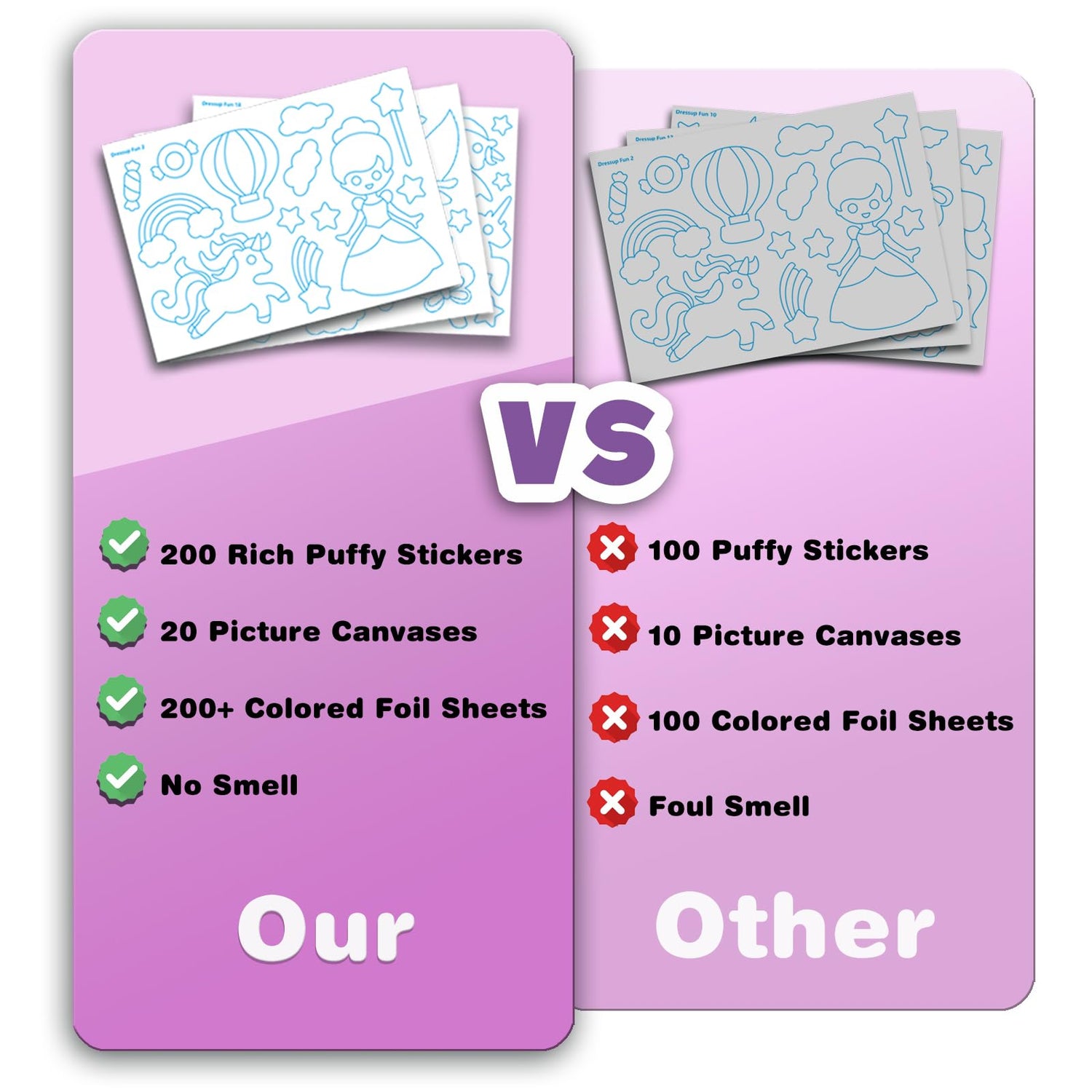 - 【Product content】200 Colored Foil Sheets, 200 Foam Sticker Sheets (200+ Foam Stickers), 20 Picture Canvases(double size printing ), and Googly Eyes, Instruction Manual.Sufficient colored stickers are enough for children to create rich and colorful styles.