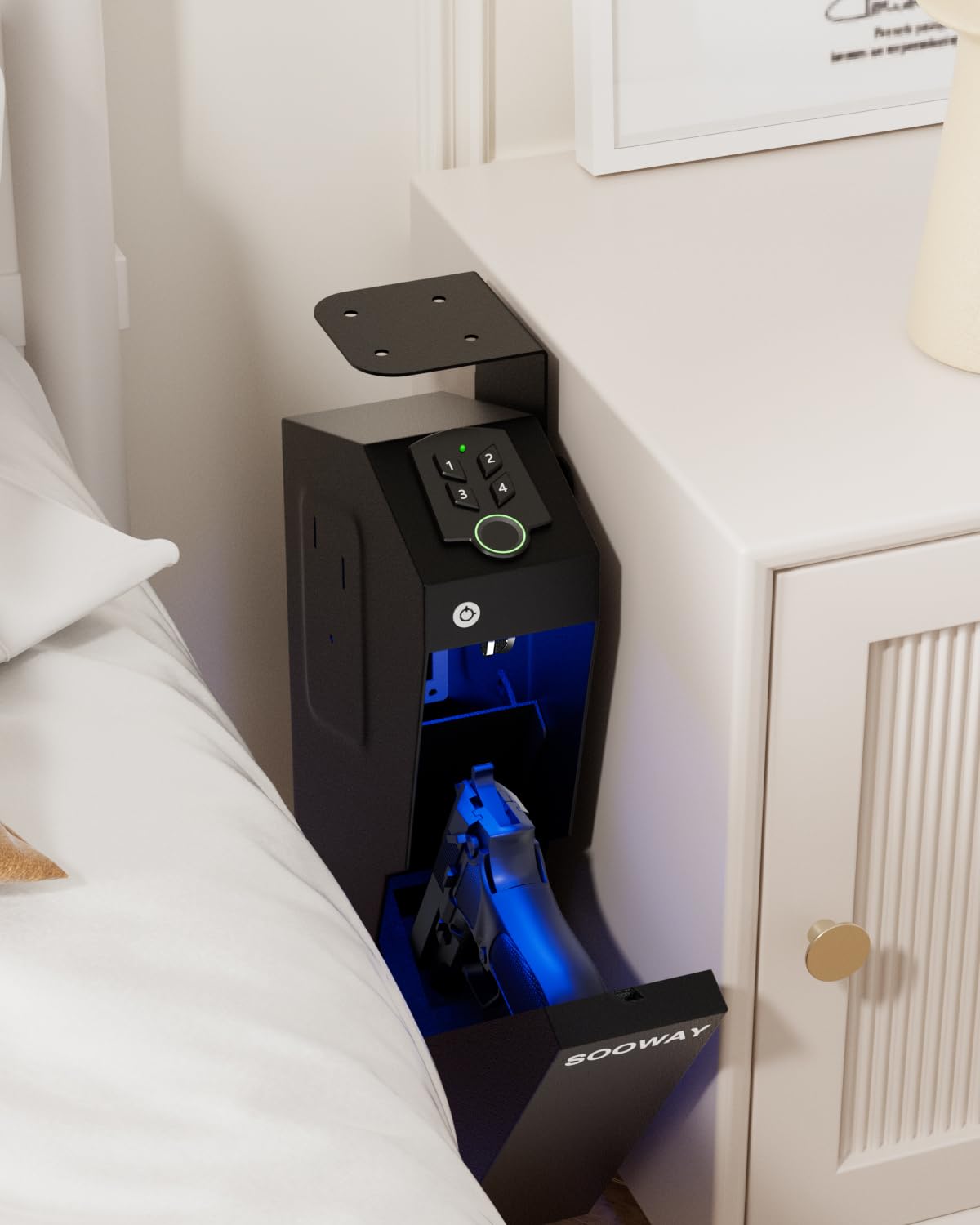 SOOWAY Biometric Pistol Safe Fingerprint Quick Access Gun Safe for Handgun, Drop Down Mounted with 3 Ways Unlock Gun Lock Box for Car, Nightstand, Desk, Wall, Dresser