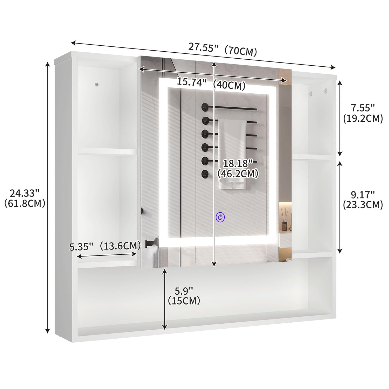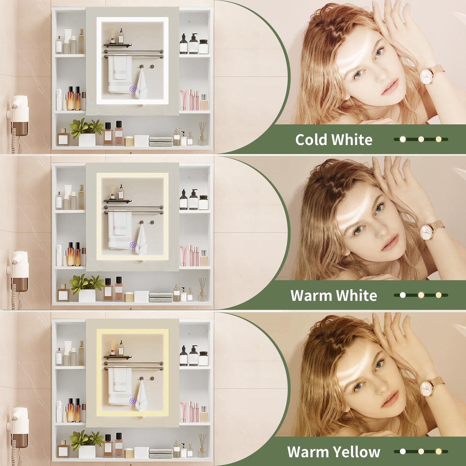 Our medicine cabinet organizer keeps everything within reach, making mornings a snap.This medicine cabinet mirror doubles as a bathroom vanity mirror with lights and offers plenty of room for toiletries, all while looking great in your bathroom Made from sturdy wood treated with a protective lacquer coating, this suface mounted bathroom medicine cabinet with mirror is built to withstand the humidity of your bathroom.The smooth finish is easy to clean and maintains its beauty for years to come Our lighted medicine cabinet features 3 light modes of cold white, warm white, and warm yellow, meeting different lighting needs for makeup or shaving. You can also dim the brightness(20%-100%) to your comfort level.I believe there is always a kind of brightness that can set off a beautiful self Featuring a mix of 4 open shelves, 1 internal shelf, and a dedicated bottom shelf, this cabinet caddy medicine organizer offers a variety of storage and organization to suit your needs. Keep everyday essentials within easy reach on the open shelves, while storing away bulkier items behind the mirrored doors Worried about assembly? Fear not! Our surface mount cabinet includes detailed instruction, numbered components, and all the tools you need for a hassle-free setup. If some parts are missing,please contact us first and we will send you the parts for replacement,you don't have to take it apart and return it
