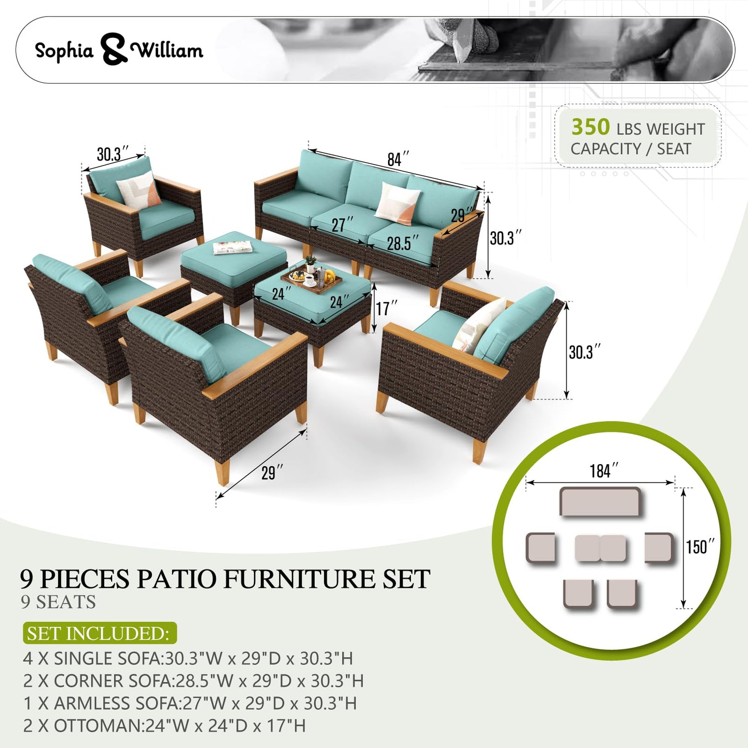 Sophia & William Patio Furniture Set 9 Piece Outdoor Wicker Furniture Sectional Sofa, Extra Large Patio Rattan Conversation Set with Ottoman for Backyard, Deck, Pool(Aqua Blue)