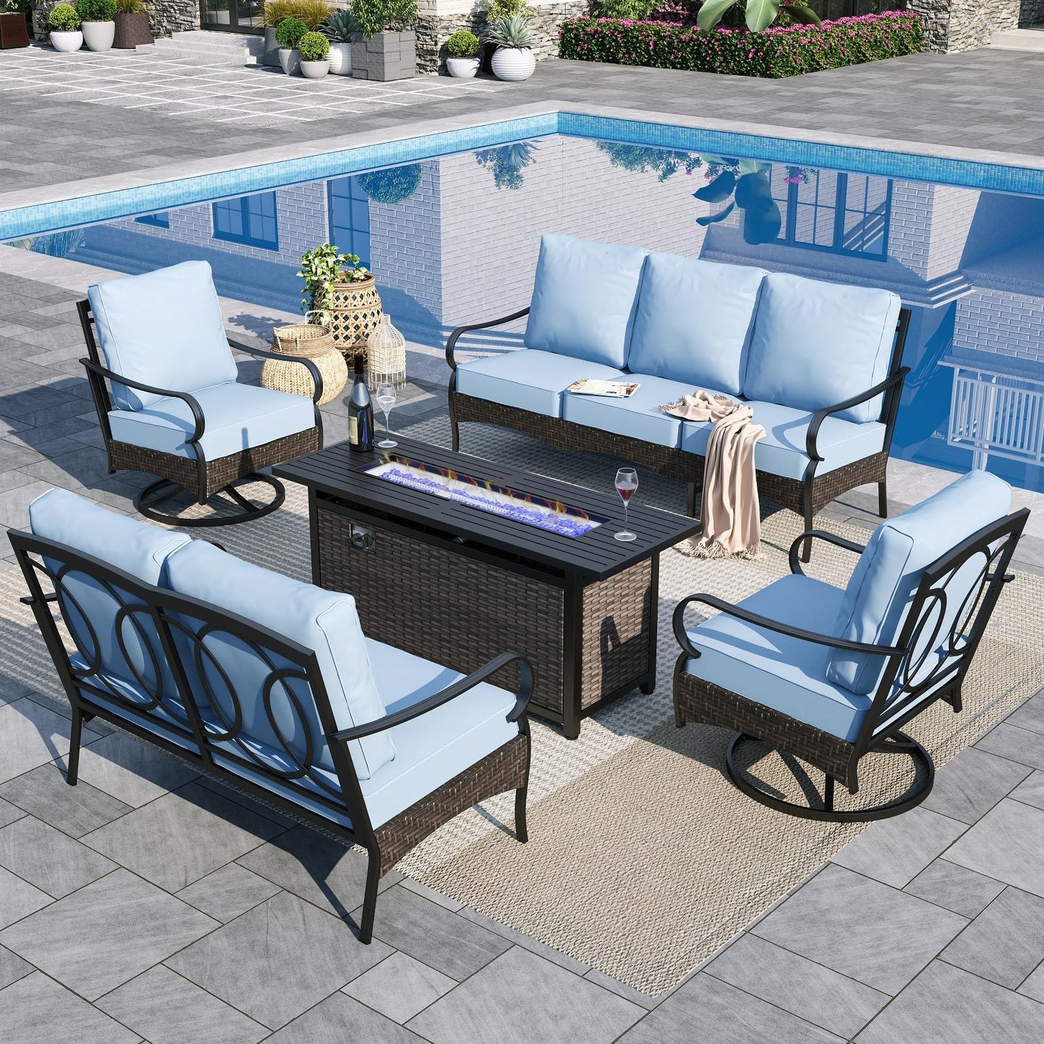 - Metal Patio Furniture Sets: Sophia & William patio furniture sets include 56-inch fire pit table, 3-seater sofa, and 2 swivel chairs,1 loveseat, designed to elevate your outdoor living experience. Perfect for relaxing or entertaining, this set includes comfortable seating and the powerful fire pit, ideal for gatherings, barbecues, or enjoying a quiet moment outdoors.