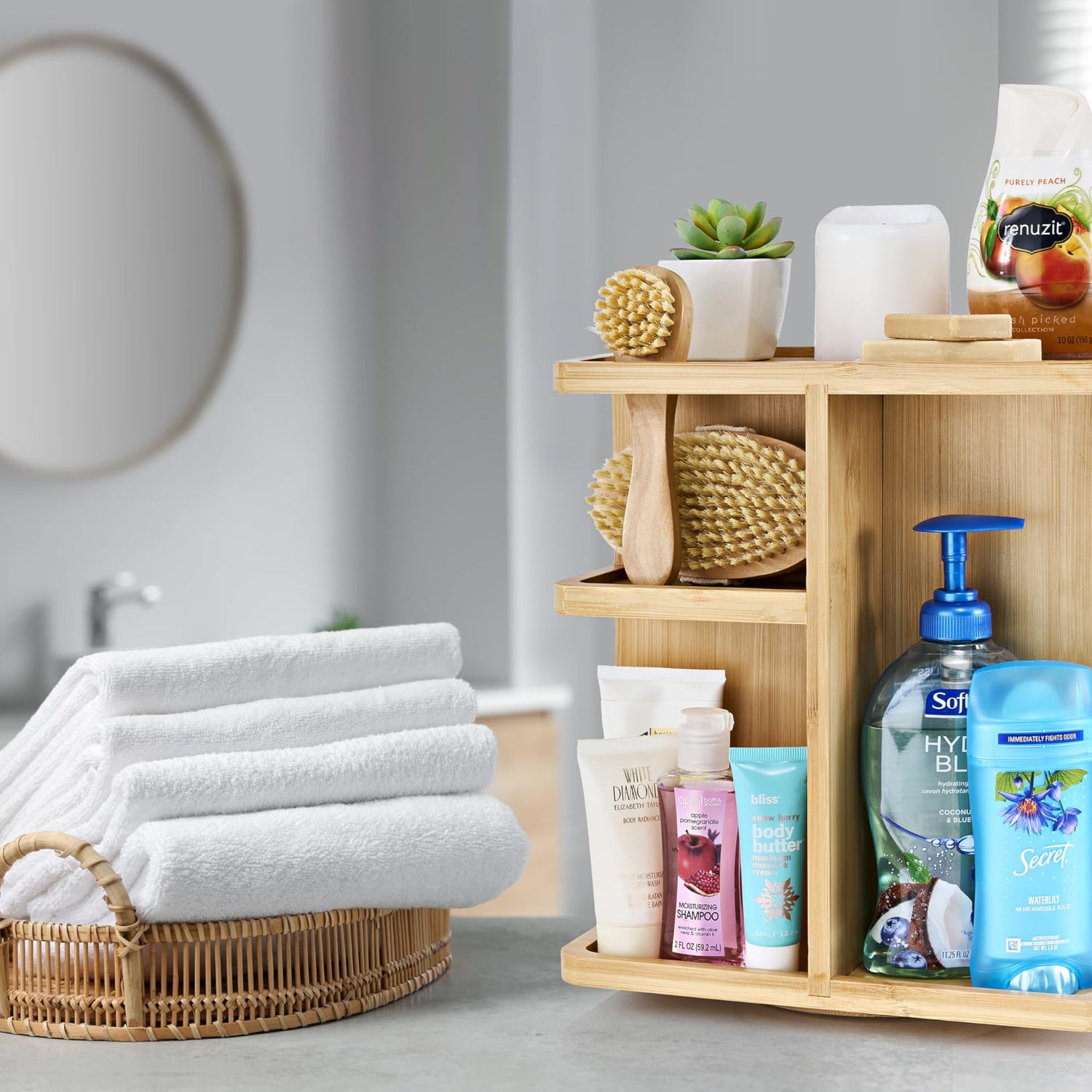 - Rotates For Easy Access: Items are always within easy reach - Lazy Susan swivel base rotates 360 degrees for convenience - Simply spin the bathroom organizer to stow or retrieve products on multi-level tier trays from each side - Use as bathroom organizer countertop or closet storage, make up organizers and storage, nail polish organizer or on your makeup vanity or bathroom vanity