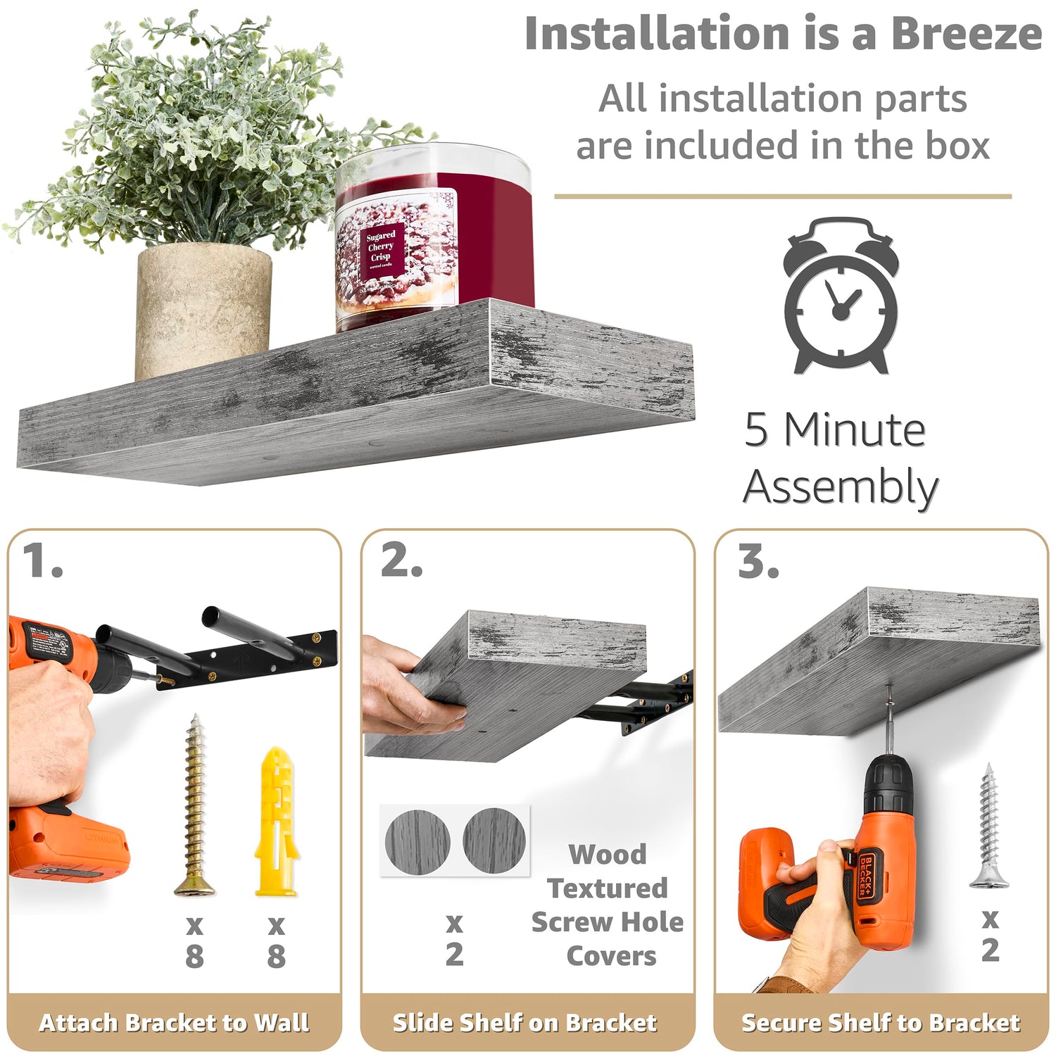 - Easy Installation: Mounting hardware INCLUDED the Hanging shelves are made of beautiful MDF with PVC + Bracket - Sturdy enough to arrange and display your favorite small objects - Attaches firmly to the wall without visible support - Minor assembly required - Supports up to 22 pounds per shelf - Measures approximately 16.25 inch L x 5.50 inch W - Each display shelf 1.5 inch thick