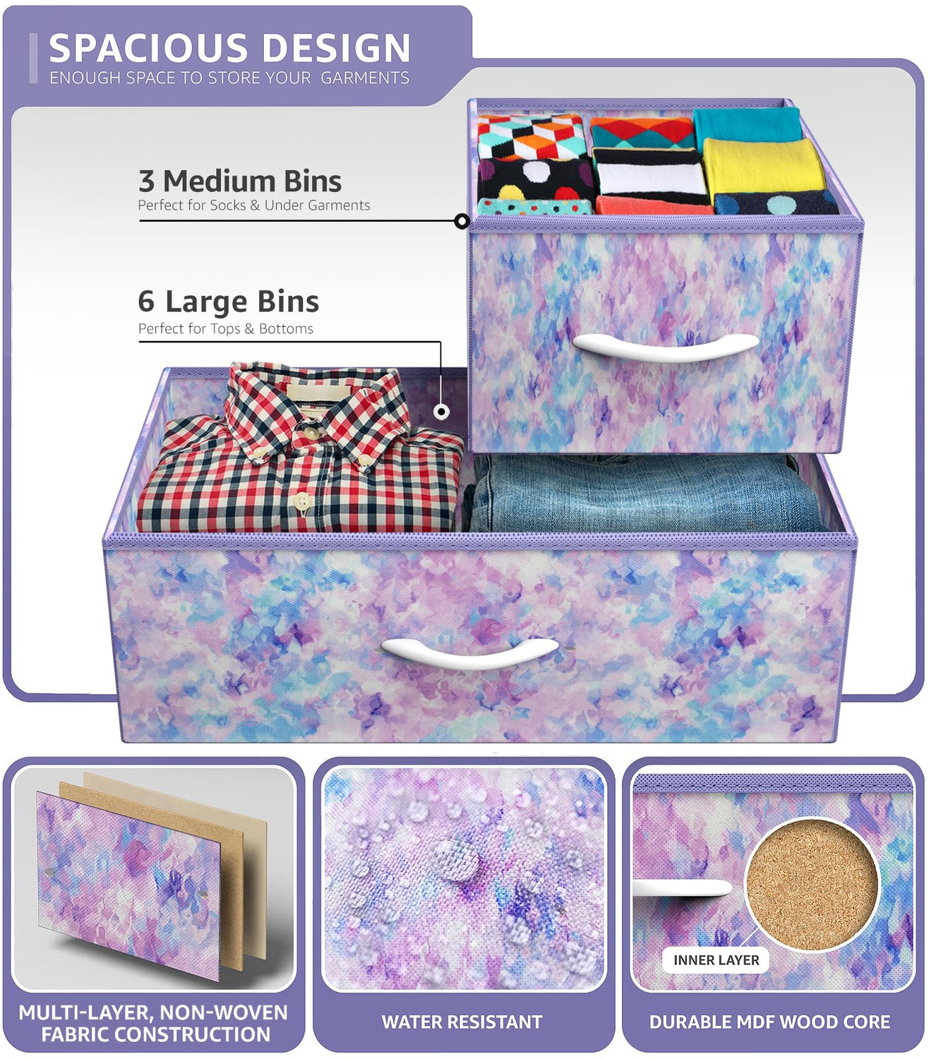- FOLDABLE DRAWERS — Soft fabric drawers with reinforced base — Easy pull handle for quiet opening and closing — Removable Drawers fold flat for easy storage when not in use — Entire unit is portable, lightweight, and easy to relocate to different spaces — Each drawer approx. 8.25” deep