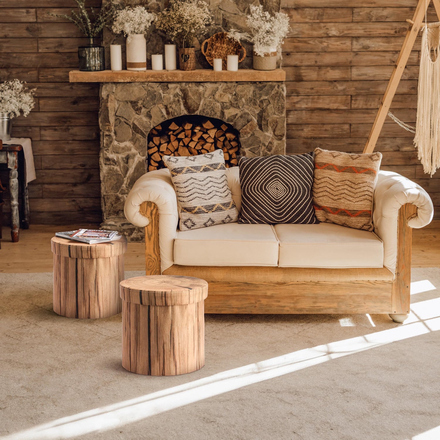 - FUN DESIGN — Sleek Tree Trunk Stump Stool contemporary log cabin design accents existing decor — 100% Polyester with cushioned padding — Finished with meticulous woodland print details — Measures approximately 15” L x 15” W x 15” H.