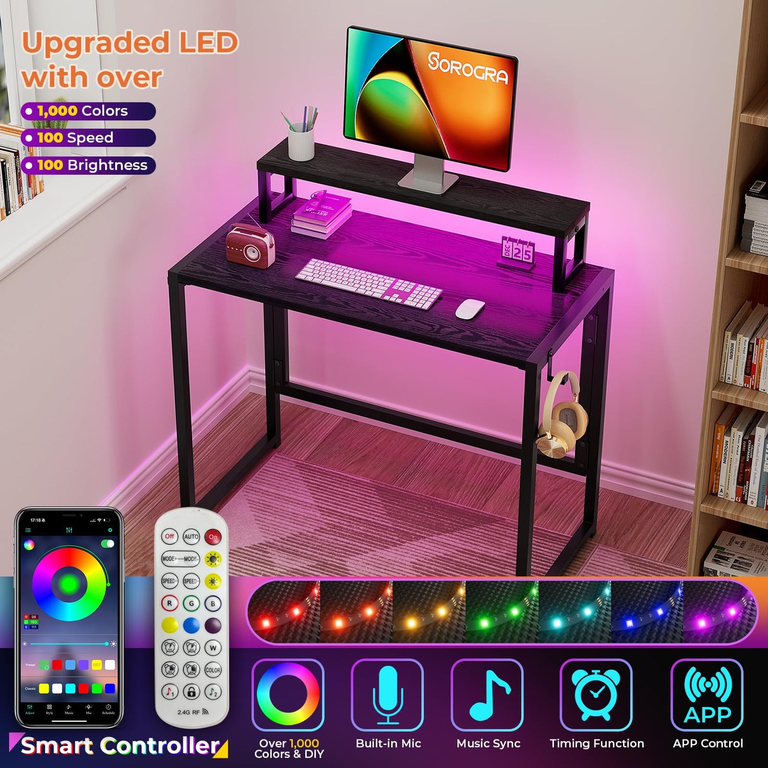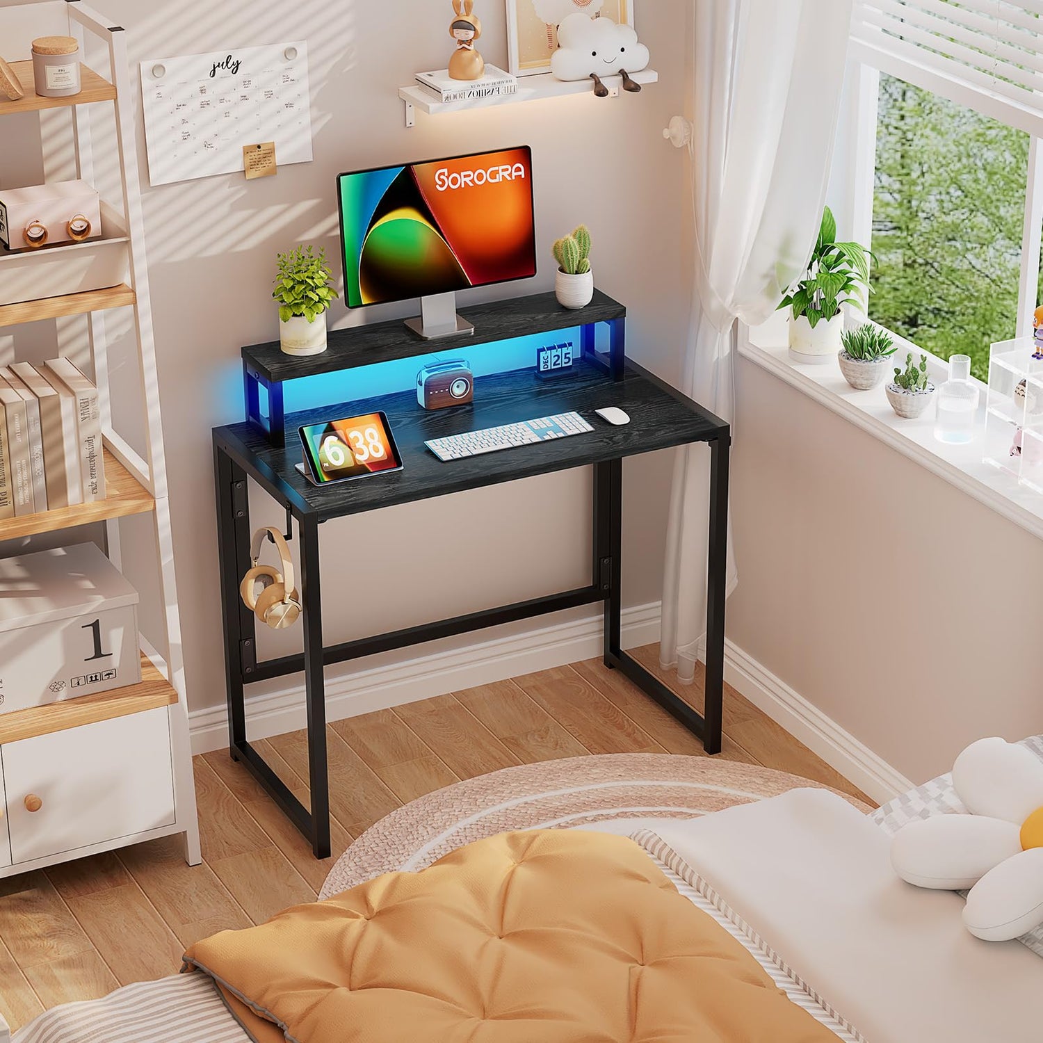 SOROGRA Small Folding Desk 31.5 Inch, Foldable Computer Desks with LED Lights and Monitor Stand, Work Portable Table for Bedroom Home Office, Black