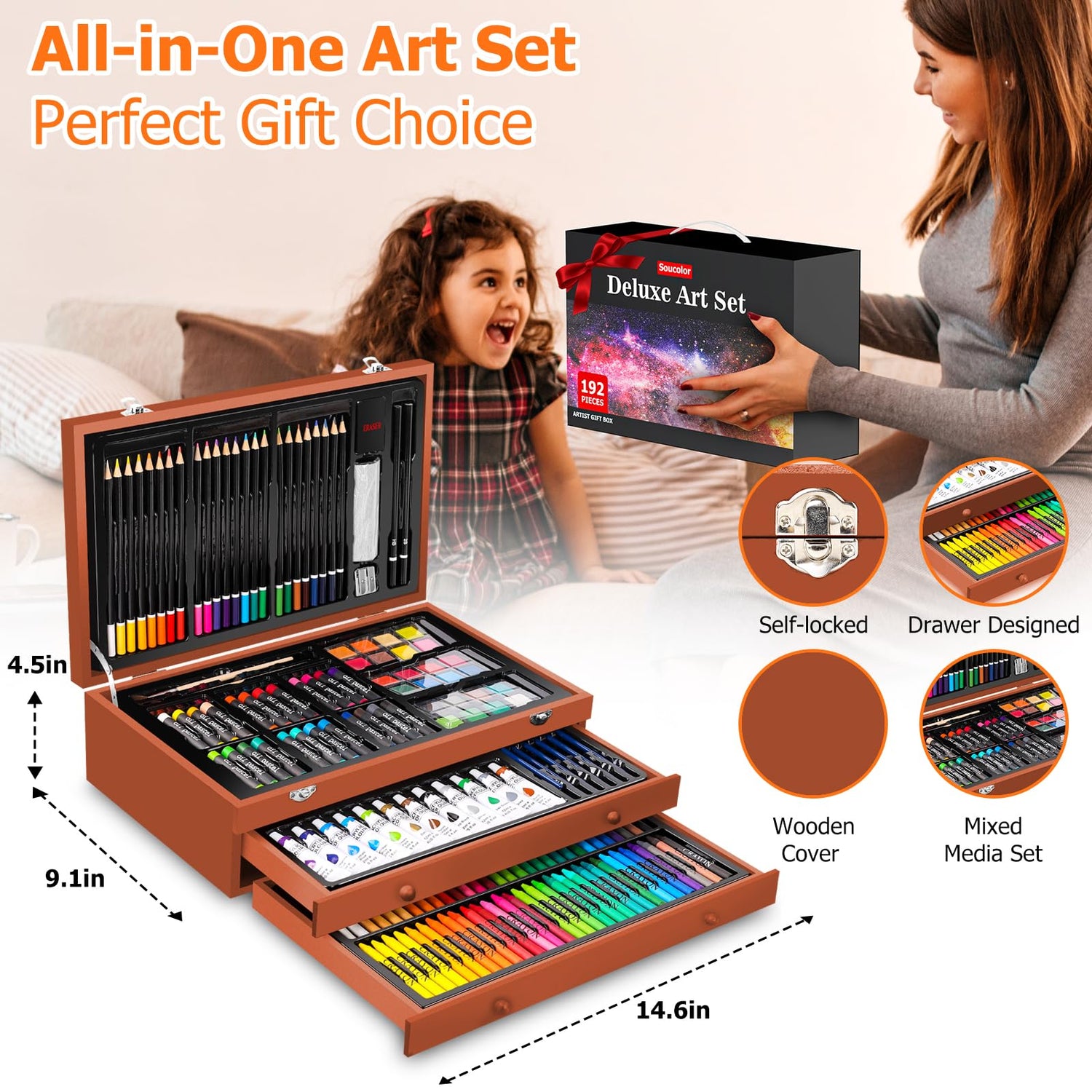 - 【Complete ALL-IN-ONE Deluxe Wooden Art Box】Soucolor 192-pack Deluxe Art Set includes a wide range of art supplies: 60 crayons, 24 colored pencils, 24 oil pastels, 24 watercolors, 24 acrylic paints, 11 sandpapers, 8 brushes, 8-well palettes, 3 A4 canvases, 1 color wheel, 1 sponge, 1 color palette, 1 HB pencil, 1 2B pencil, 1 eraser, 30 sheets sketchbook, 20 sheets acrylic pad, 20 sheets drawing pad, 1 sharpener, 1 wooden case, 1 Gift box, perfect art kit for beginners and artists of all levels.