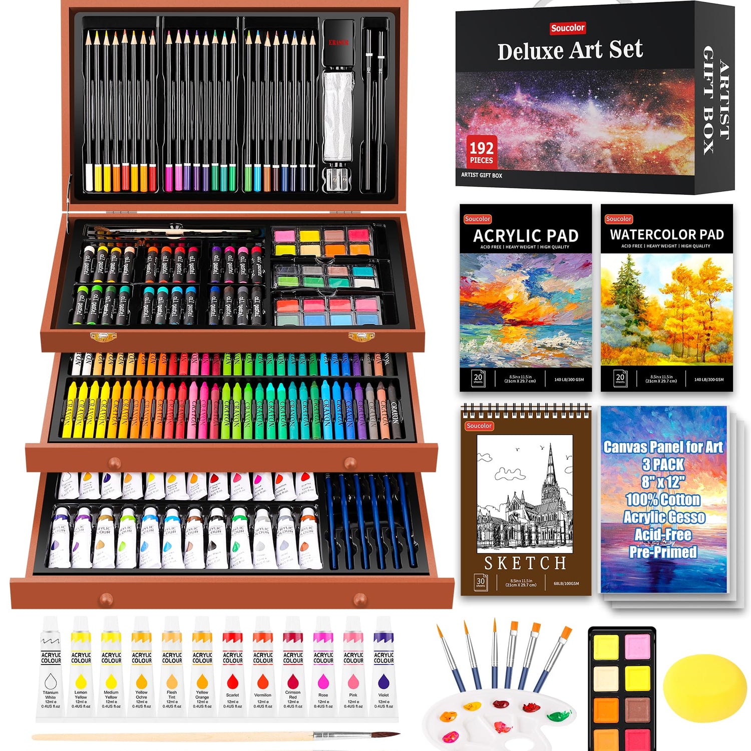 Soucolor Art Supplies, 192-Pack Deluxe Art Set Drawing Painting Supplies Art Kit with Acrylic Pad, Watercolor Pad, Sketch Book, Canvases, Acrylic Paint, Crayons, Pencils, Gifts for Artists Adults Kids