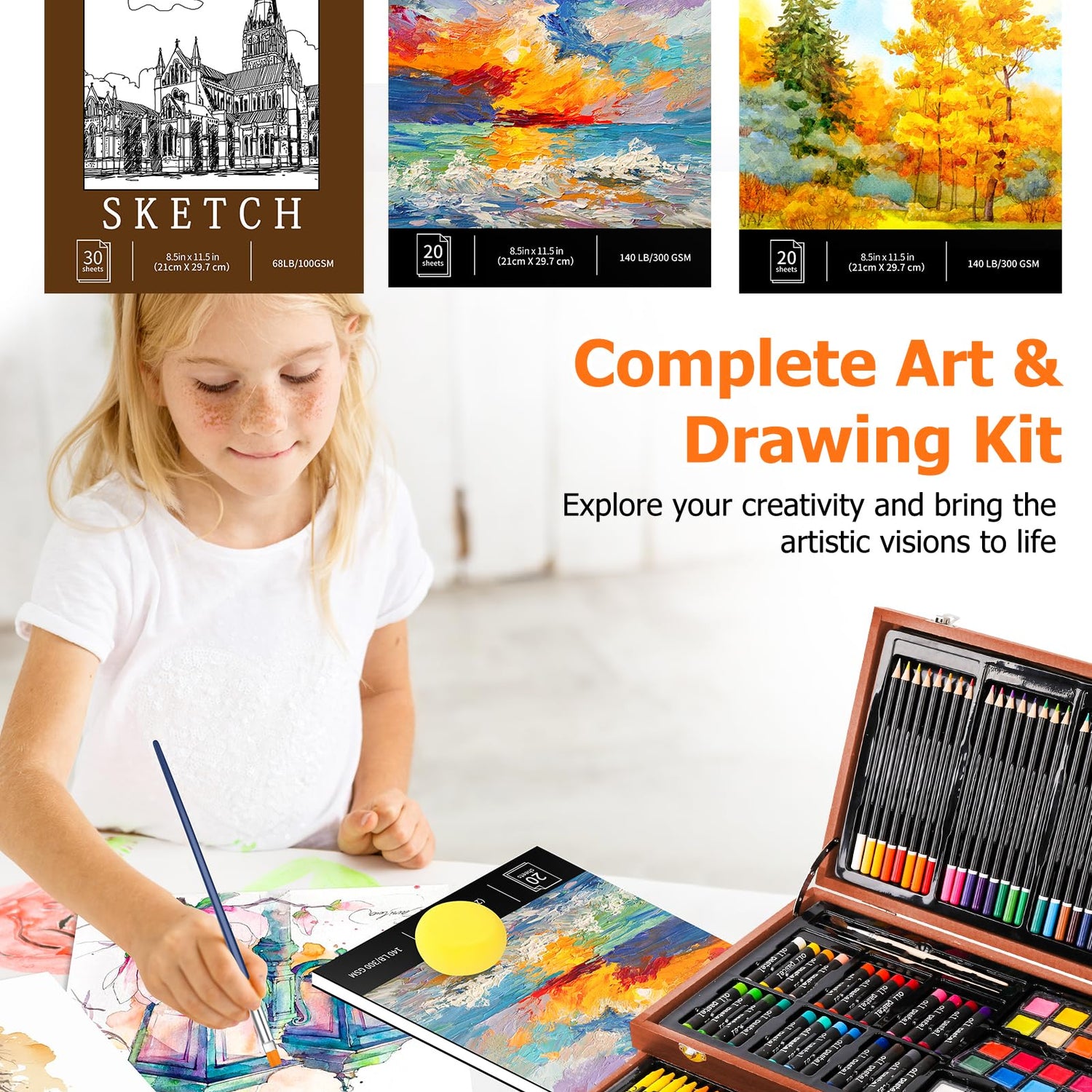 - 【Well Organized Deluxe Wooden Case】Our art kits with removable double drawers are neatly organized in a sturdy wooden case, providing convenient storage and easy access to your art stuff while keeping all drawing supplies tidy. Double wooden box makes it convenient for you to use on the go. Whether you're at home, in the office, at school, or travelling, your art supply kit is always within reach, making your artwork effortless. Great Christmas Gifts Stocking Stuffers Art Sets for Adults Kids.